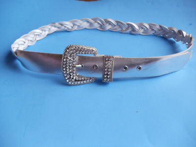 Silver Ladies Belt Braided Back Rhinestone buckle