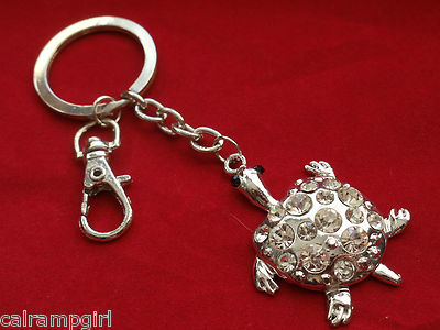 This keychain features a silver colored turtle adorned with crystals. A small chain connects the turtle to a durable keyring and lobster claw clasp is attached.