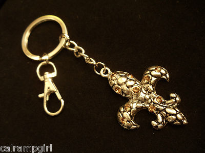 Designed in a silver-tone metal, this cute keychain features one beautifully crafted fleur de lis charm The fancy design and crystal rhinestones .Keychain measures 5" top to bottom charm measures 2" I do combine shipping so please look at my other items.