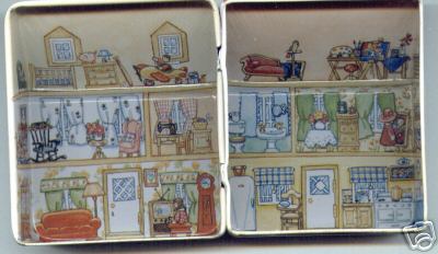 Doll House Miniature Tin. A wonderful rare find from Europe imported. This is one tin from a collection of 4 different designs. The one your looking at now is called The 20th Century American designed by Dana Kubick. Size: 2" Long x 2 1/2" High and 1 1/4" Deep... which opens up on a hinged lid to reveal the designed interior inside!