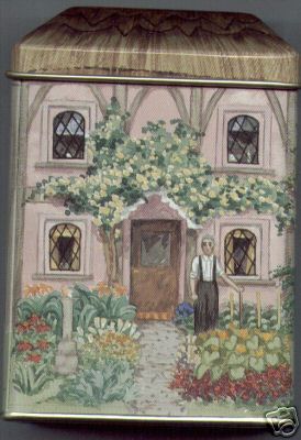 Cottage Spice Tin Box. This is one of a set of 4 different designs. This spice tin box is 3 1/4" High x 2 1/4" Long x 1 1/2" Wide which makes this tin ideal for your spices with its pop off air tight lid. These tins are imported from Europe and are Available Now to be shipped to your home. You may find other uses for this wonderful tin that has details on all sides. |