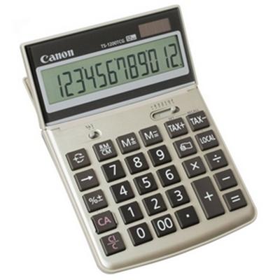 Canon's Desktop calculator 12-digit display decimal positions: A, 4, 3, 2, 0, F large adjustable titl display, calculator shell is made with 100% post-consumer recylced plastic. Dual power (solar and battery)