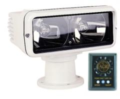 200,000 candela Internal elevation mechanism provides pitch control of spotlight beam; protects elevation mechanism from weather Includes a fingertip remote control Point Pad ; up to three remote Point PadT units may be installed on system; surface/ flush mount options included Rugged triple-primed and sealed, marine grade aluminum housing Wiring harness 15 ft (4.57 m) length Salt water-resistant construction with nylon and phenolic washers, aluminized stainless steel screws with insulating lubricant Application: Sport yachts, mega-yachts, sportfish and commercial vessels 12V Size: 8.0 x 9.0 x 8.0 in (20.3 x 22.9 x 20.3 cm) Weight: 7.2 lbs (3.2 kg) Material: Rugged triple-primed and sealed, marine grade aluminum housing Color: White Operation: Remote controlled Accessories: Universal Remote Control Point Pad for remote control with install kit - P/N 9283.3 55W/12V Halogen lamp - P/N 6001 Beam Angle: 5o vertical, 7o horizontal Elevation Angle: 9o up, 17o down Rotation: 360o Rotation Speed: Fast 28o per second, Slow 18o per second Elevation Speed: 2o-7o per second - (12VDC) Lamp: High intensity 55W Halogen Limited Warranty: 1 year |