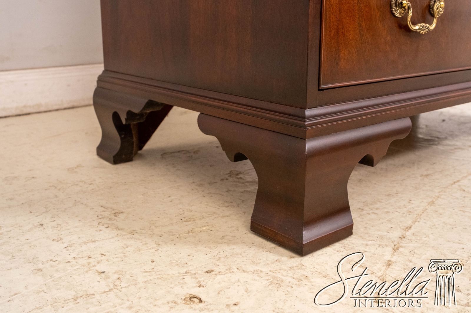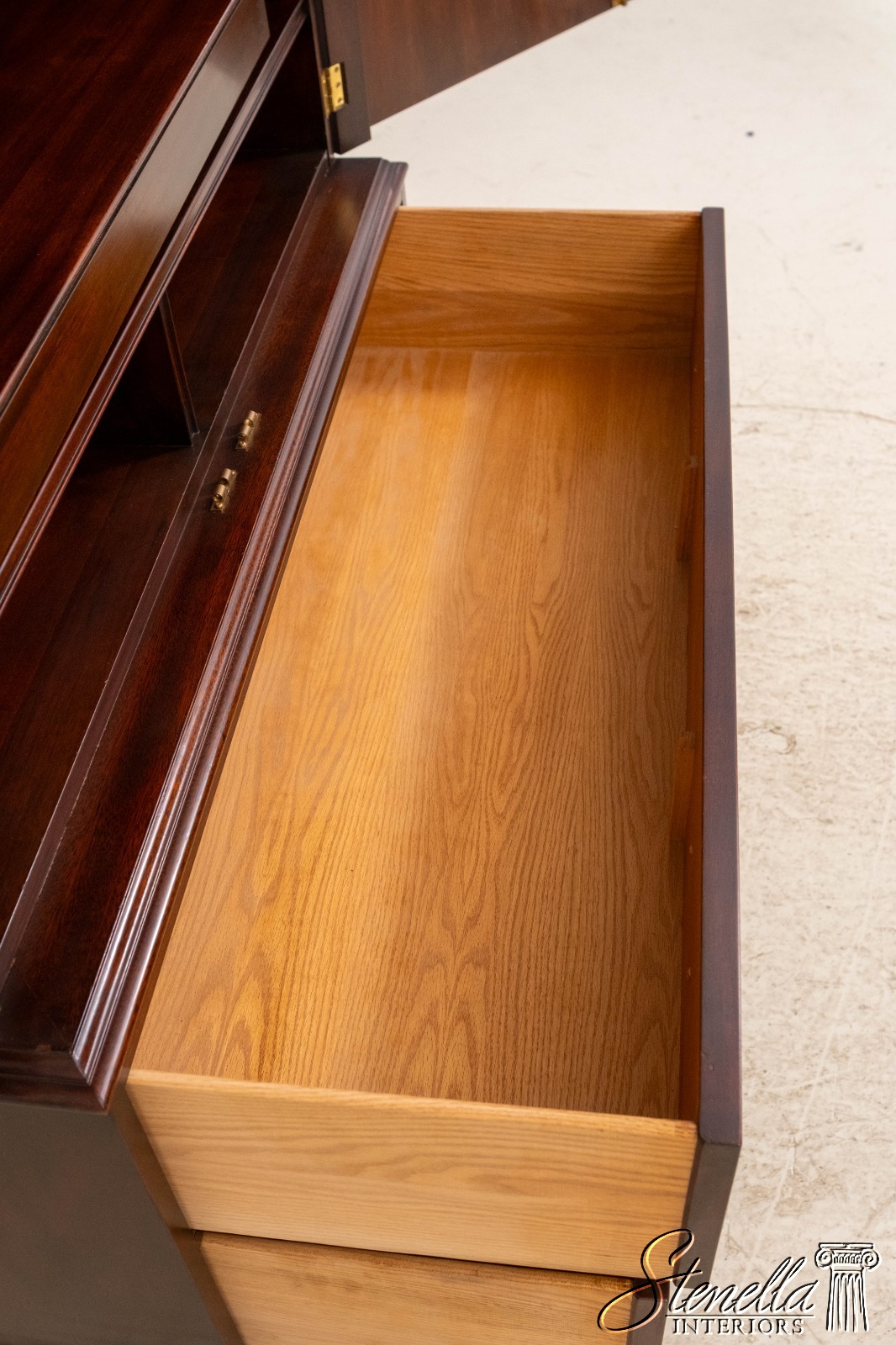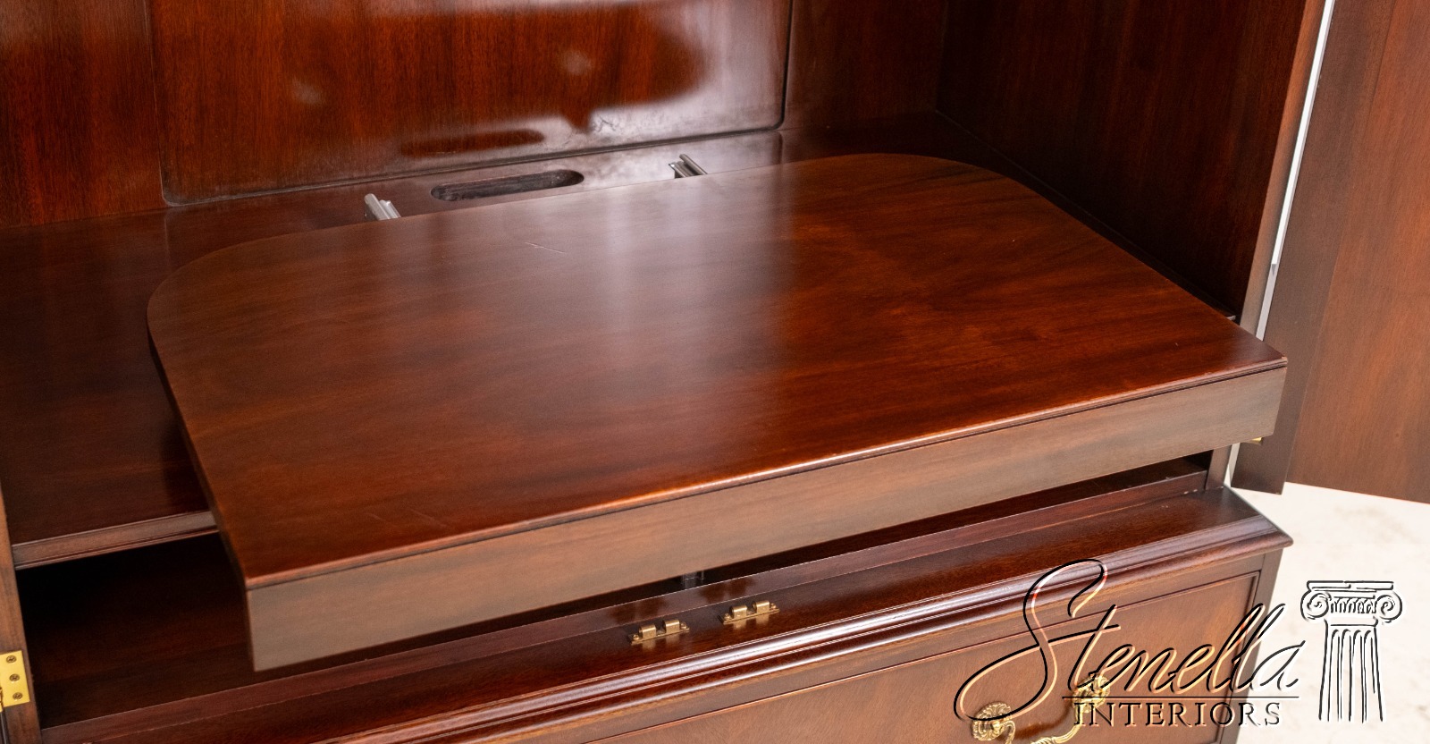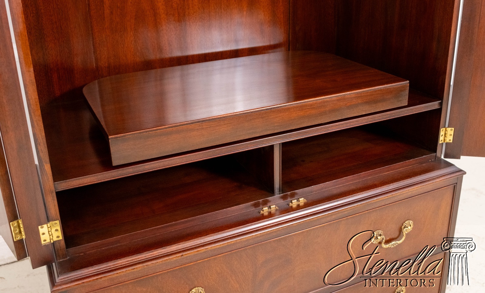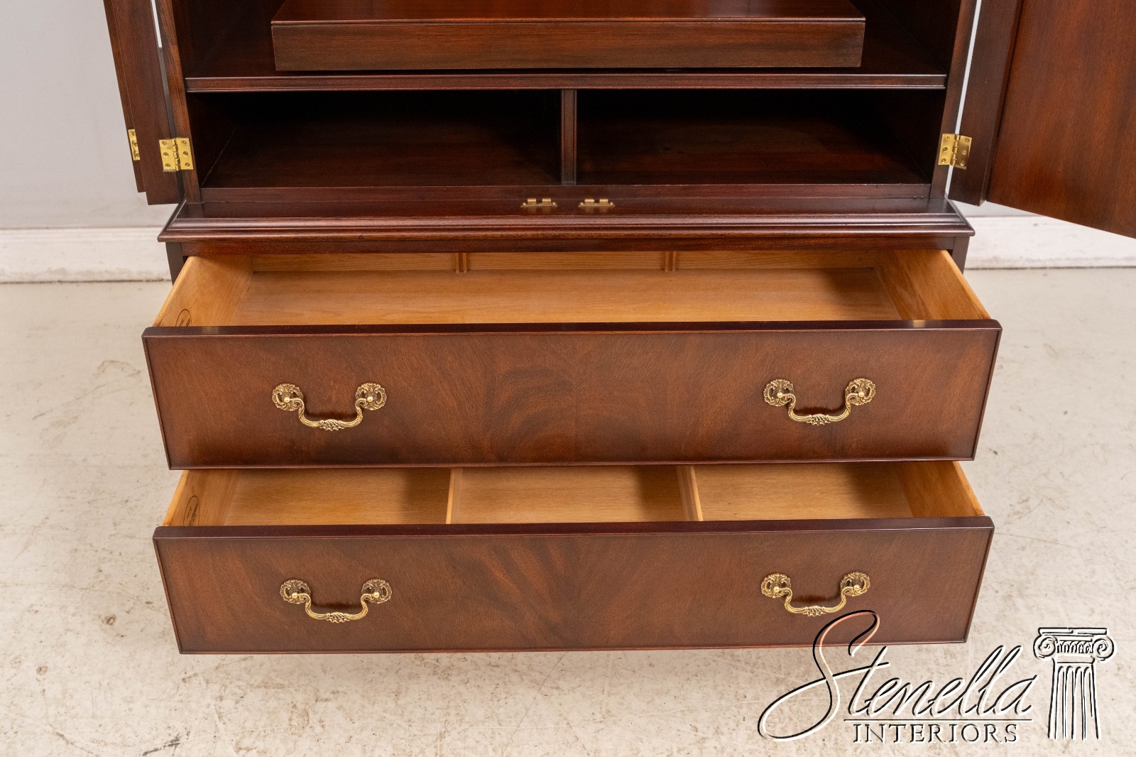 Details: Finish no.29 Mahogany Bracket Feet Fine Carved Details High Quality Construction Large Impressive Cabinet Raised Panel Doors Rich High Sheen Finish 18 C. Design Chippendale Style Dentil Crown Molding Solid Brass Hardware Gorgeous Figural Mahogany Front Fluted Quarter Columns Partitioned Lower Drawer Pull Out TV Tray Offered @ Fraction Original Retail Cost
