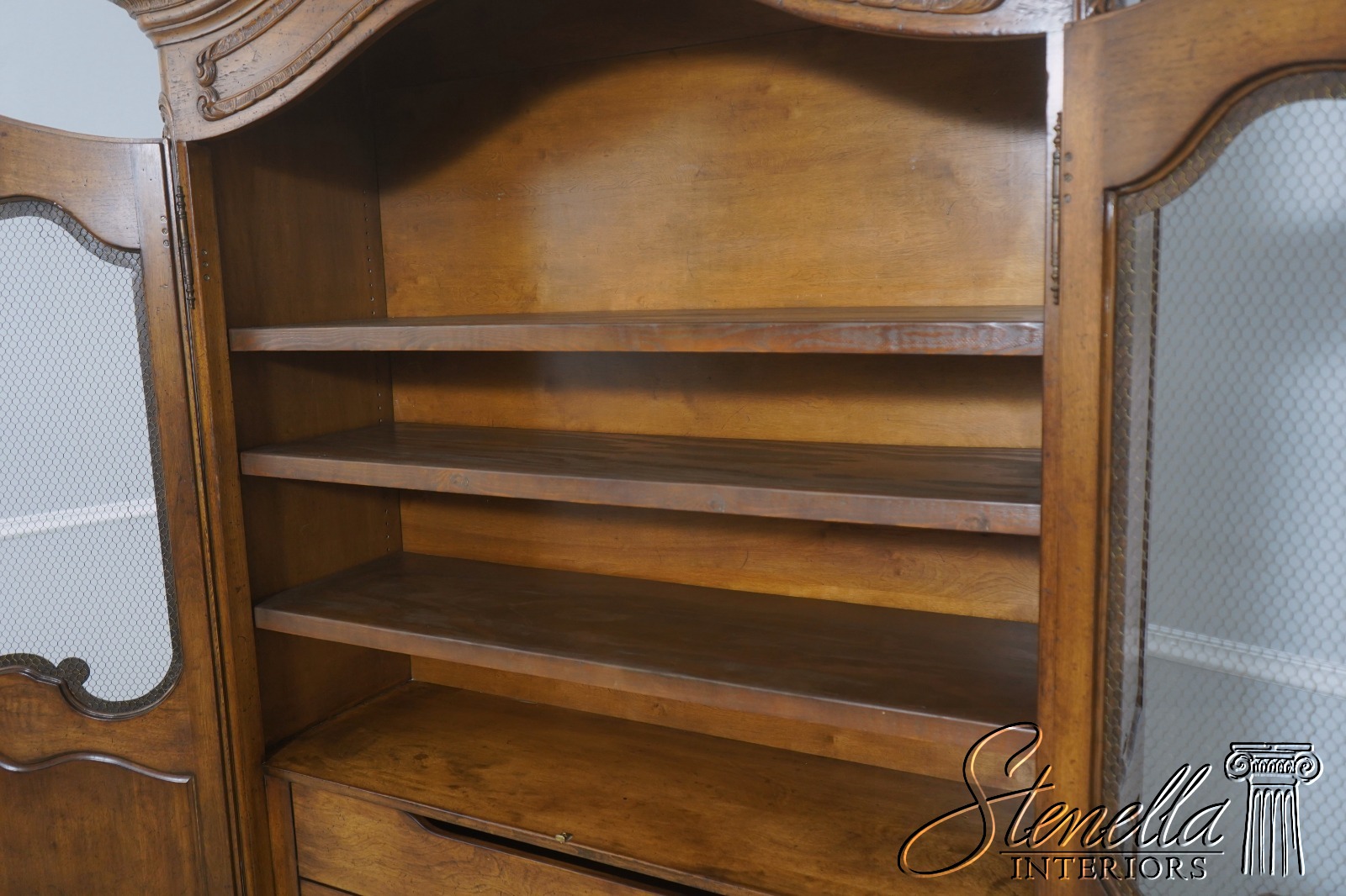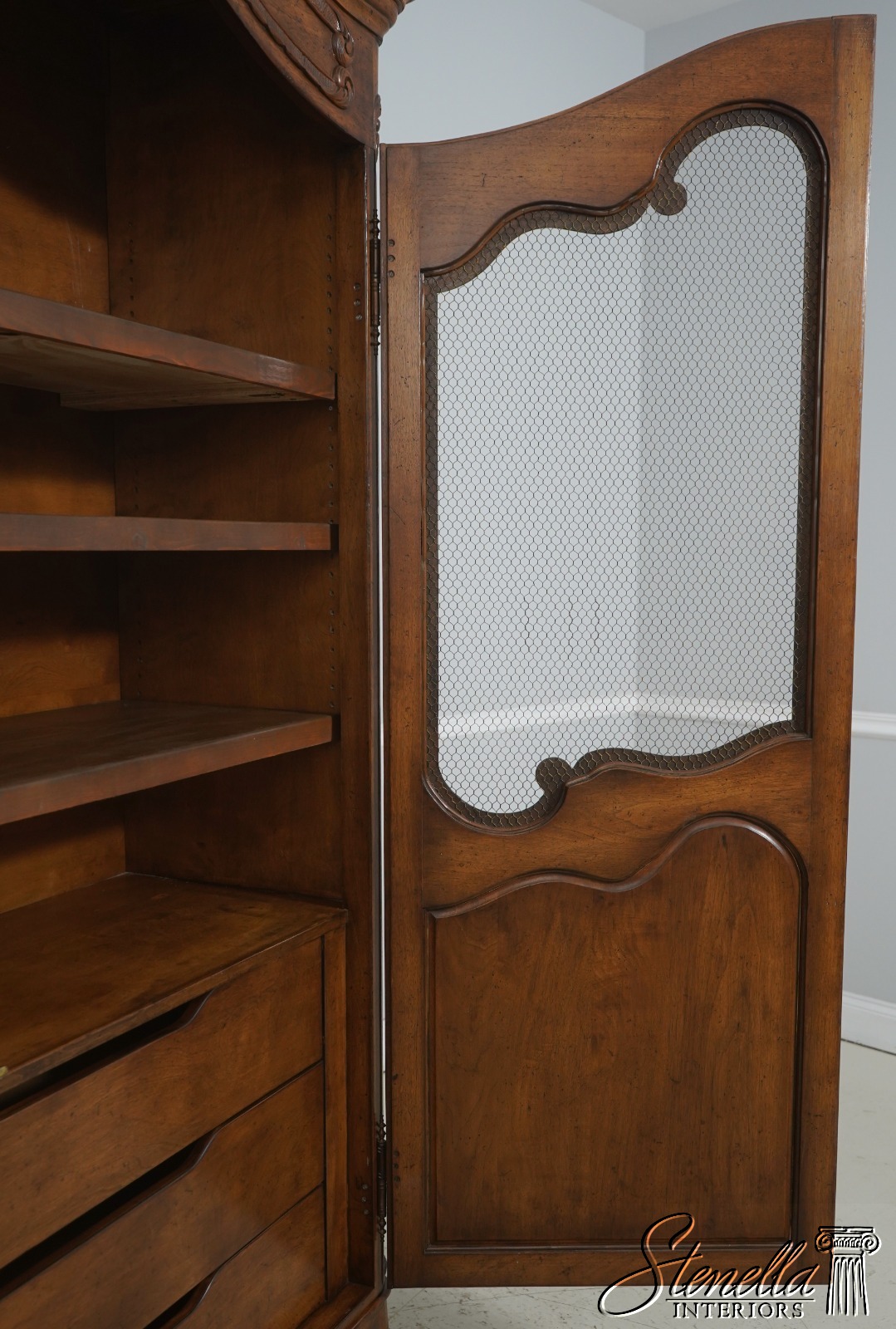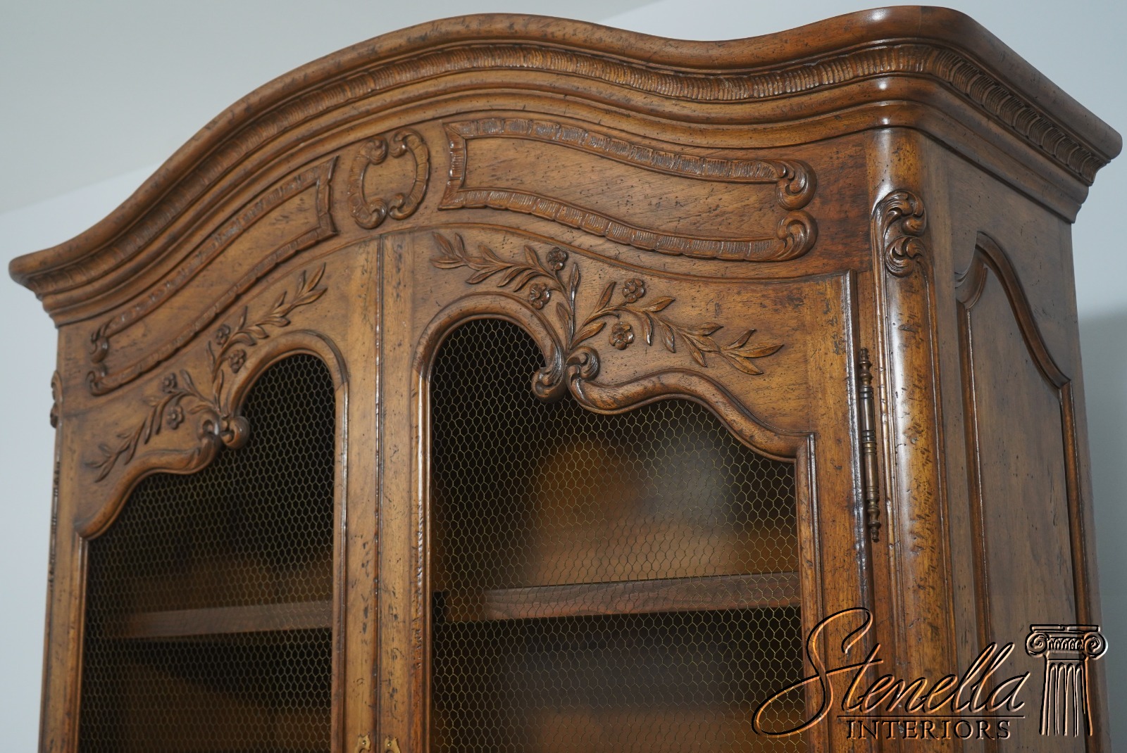 Details: Factory Distressed Country French Style Adjustable Shelves Fine Carved Details High Quality Construction Large Impressive Cabinet Wire Mesh Doors He Locking Doors Unmarked As To Manufacturer Possibly By Don Russo, Bodart, Or Similar Manufacturer