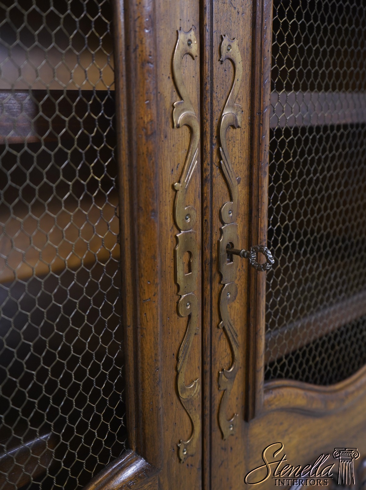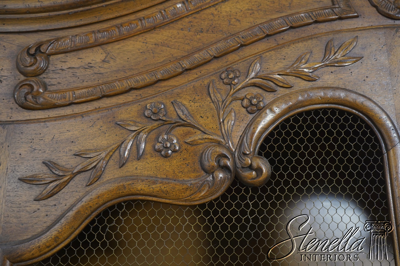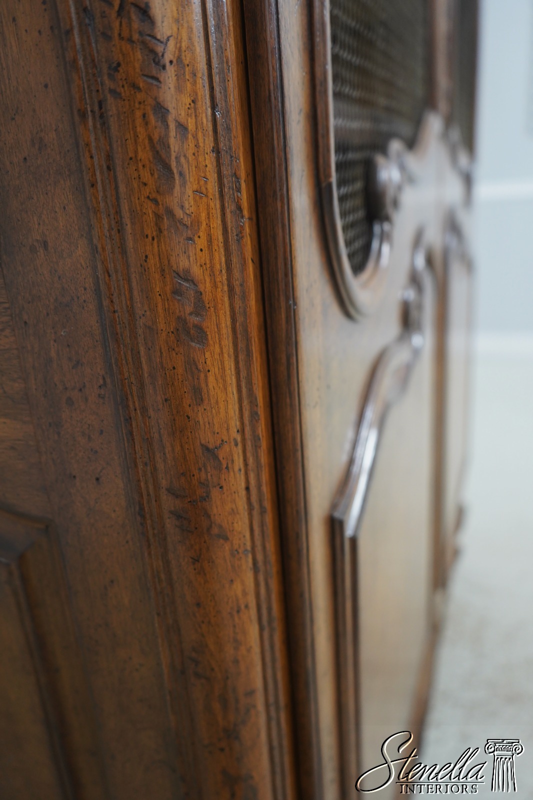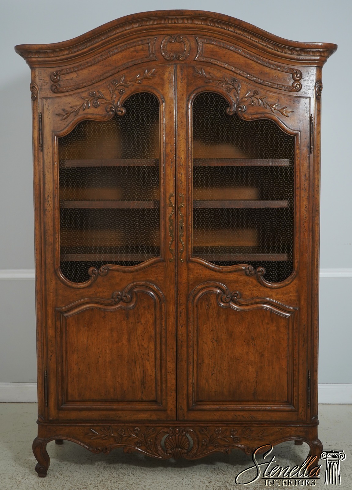 Details: Factory Distressed Country French Style Adjustable Shelves Fine Carved Details High Quality Construction Large Impressive Cabinet Wire Mesh Doors He Locking Doors Unmarked As To Manufacturer Possibly By Don Russo, Bodart, Or Similar Manufacturer