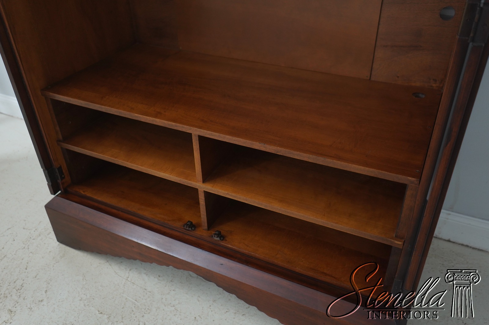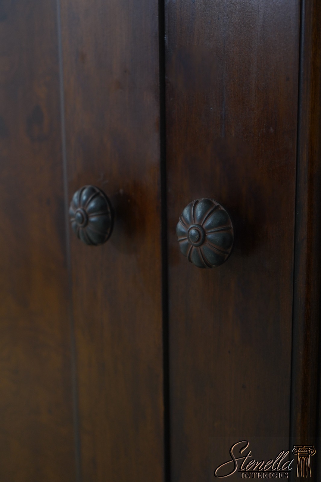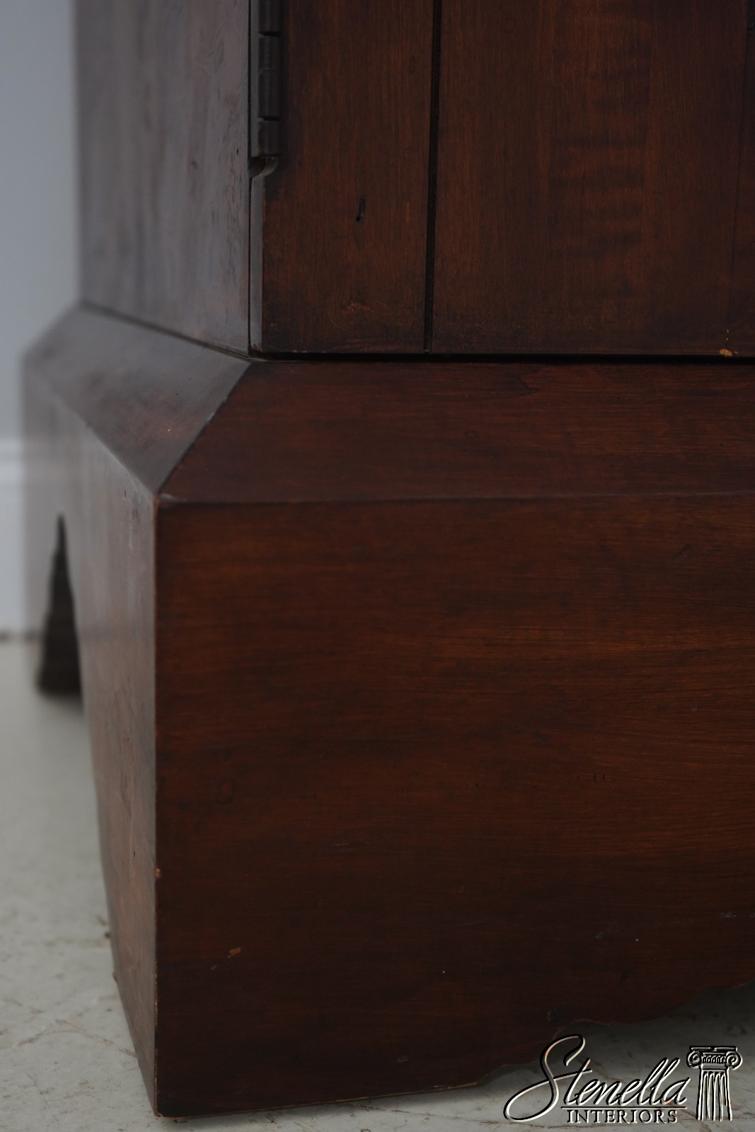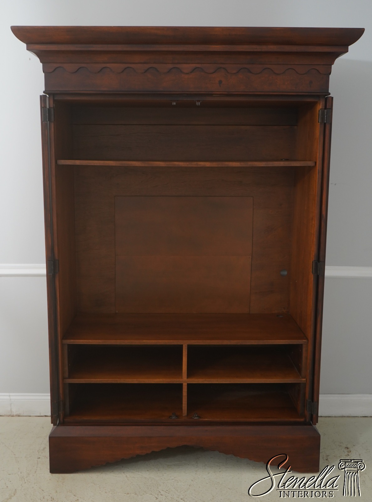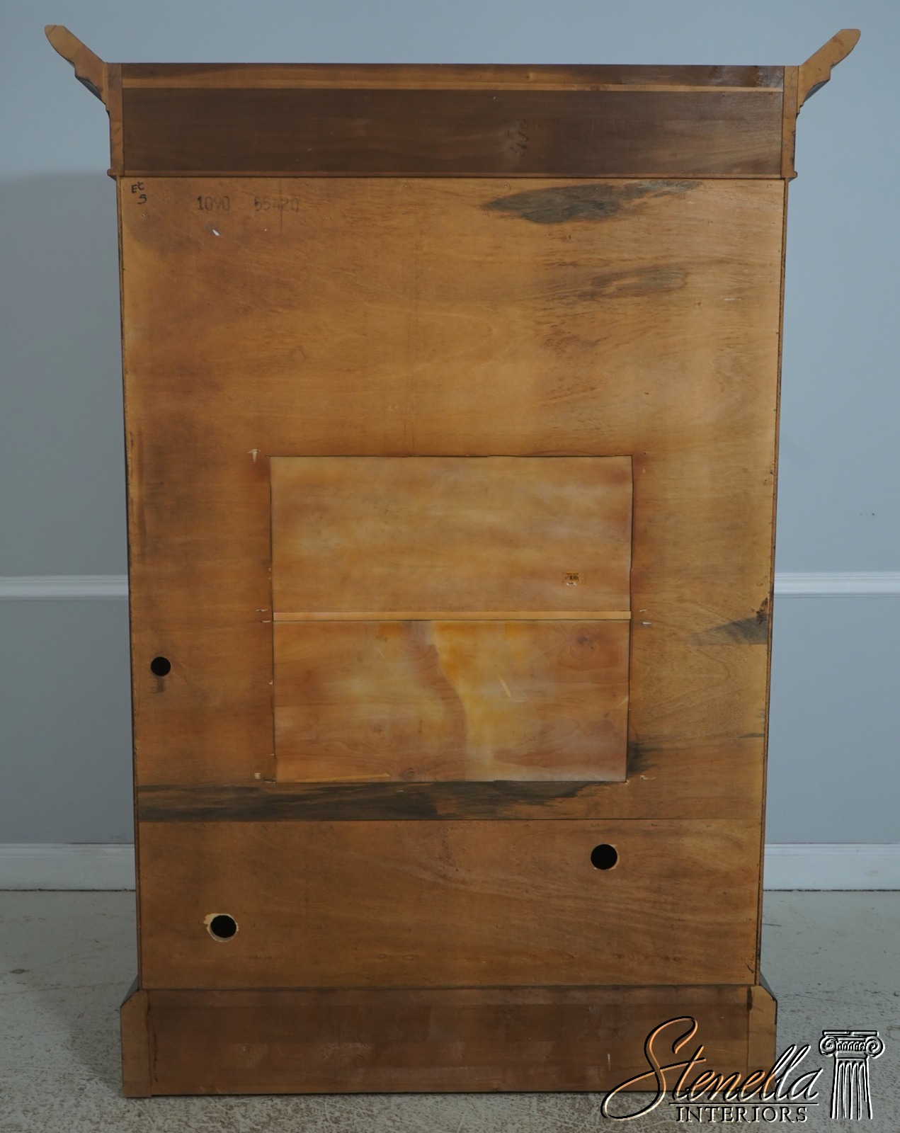 Details: Replaced Back Panel High Quality Construction Large Impressive Cabinet Gorgeous Burl Elm w. Walnut Finish American Empire Style Accommodates TV Up To 47.5 x 44
