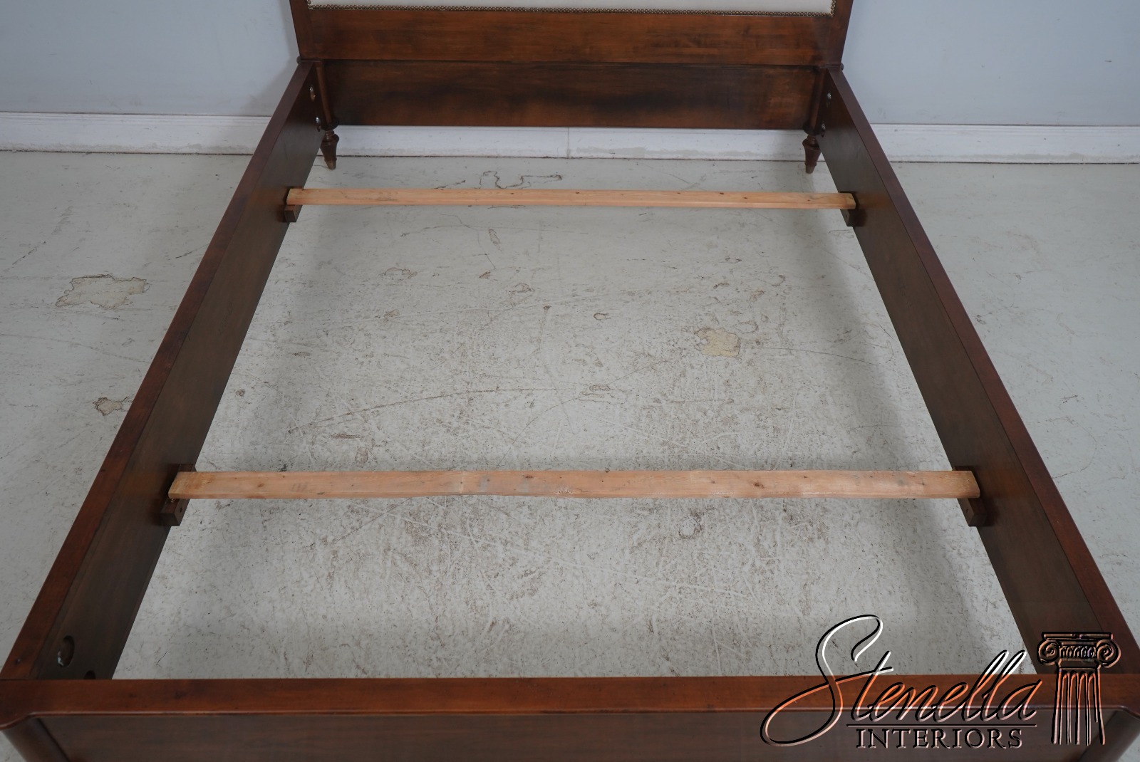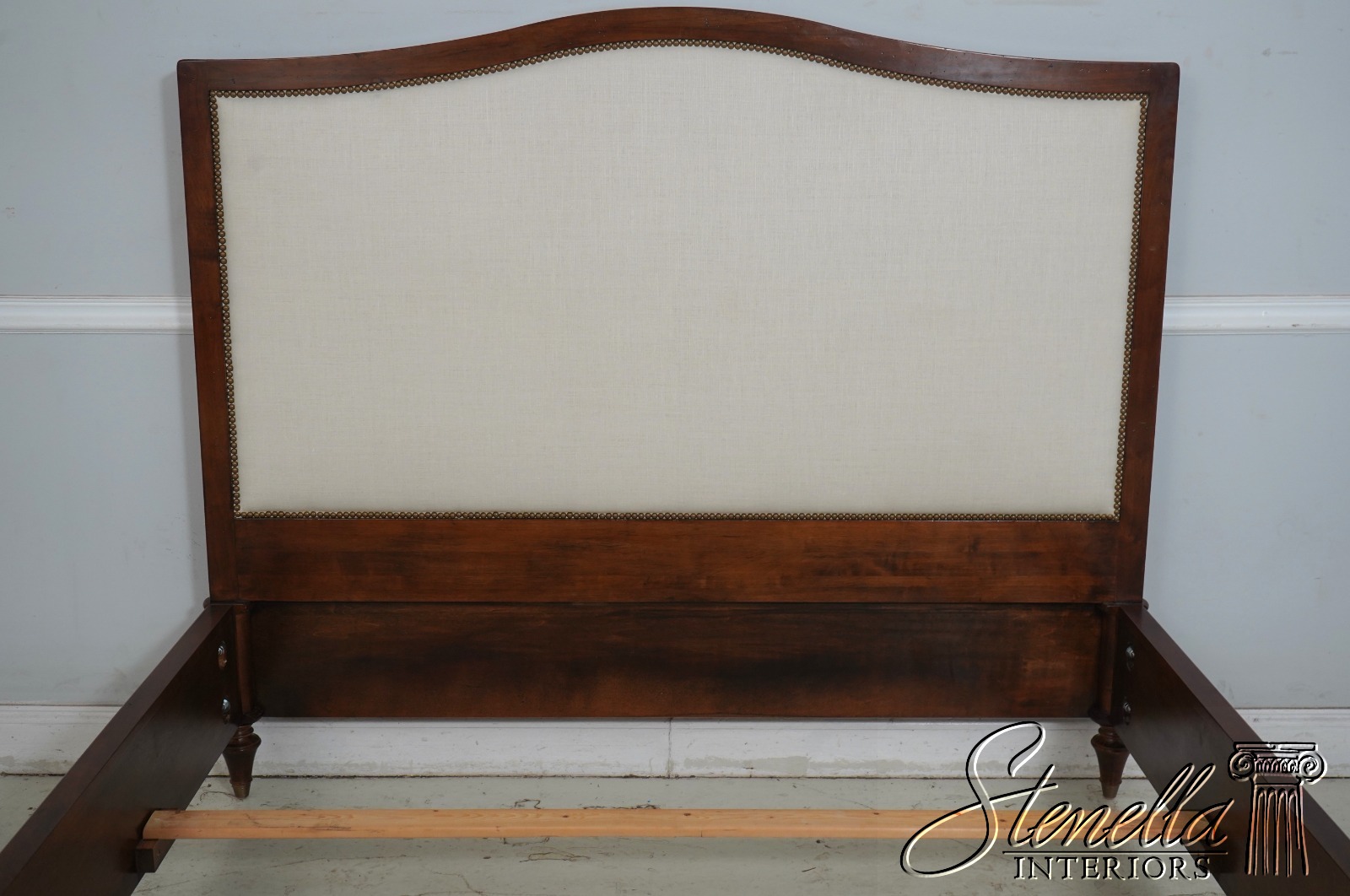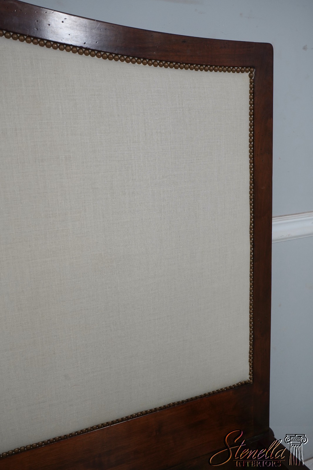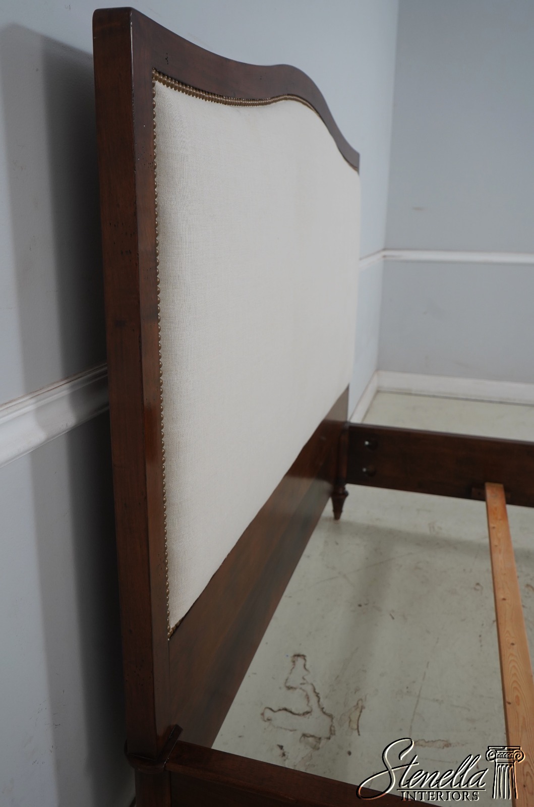 Details: Light Factory Distressing French Louis XVI Style High Quality Construction Cognac Finish Bolted Rail Construction Clean Off White Lined Upholstered Headboard Panel Un-Marked As to Manufacture - Comparable To Baker, Century Or Similar Manufacture