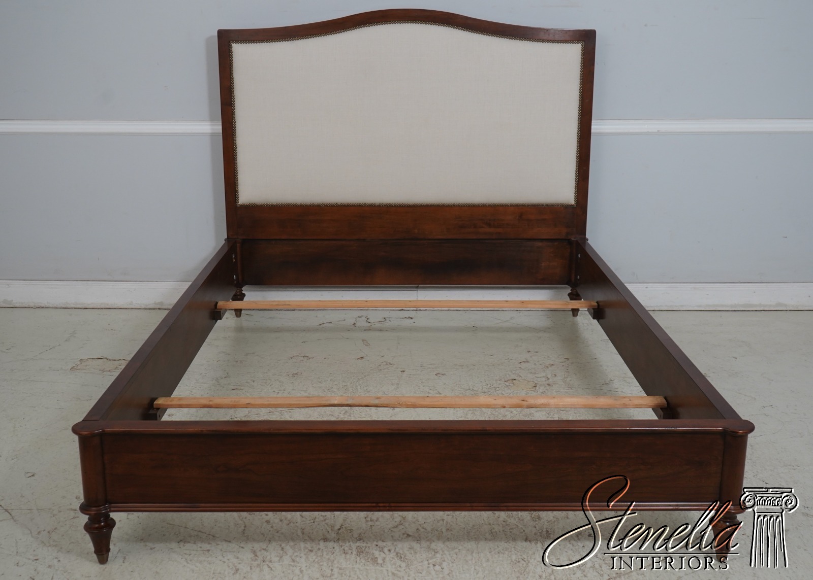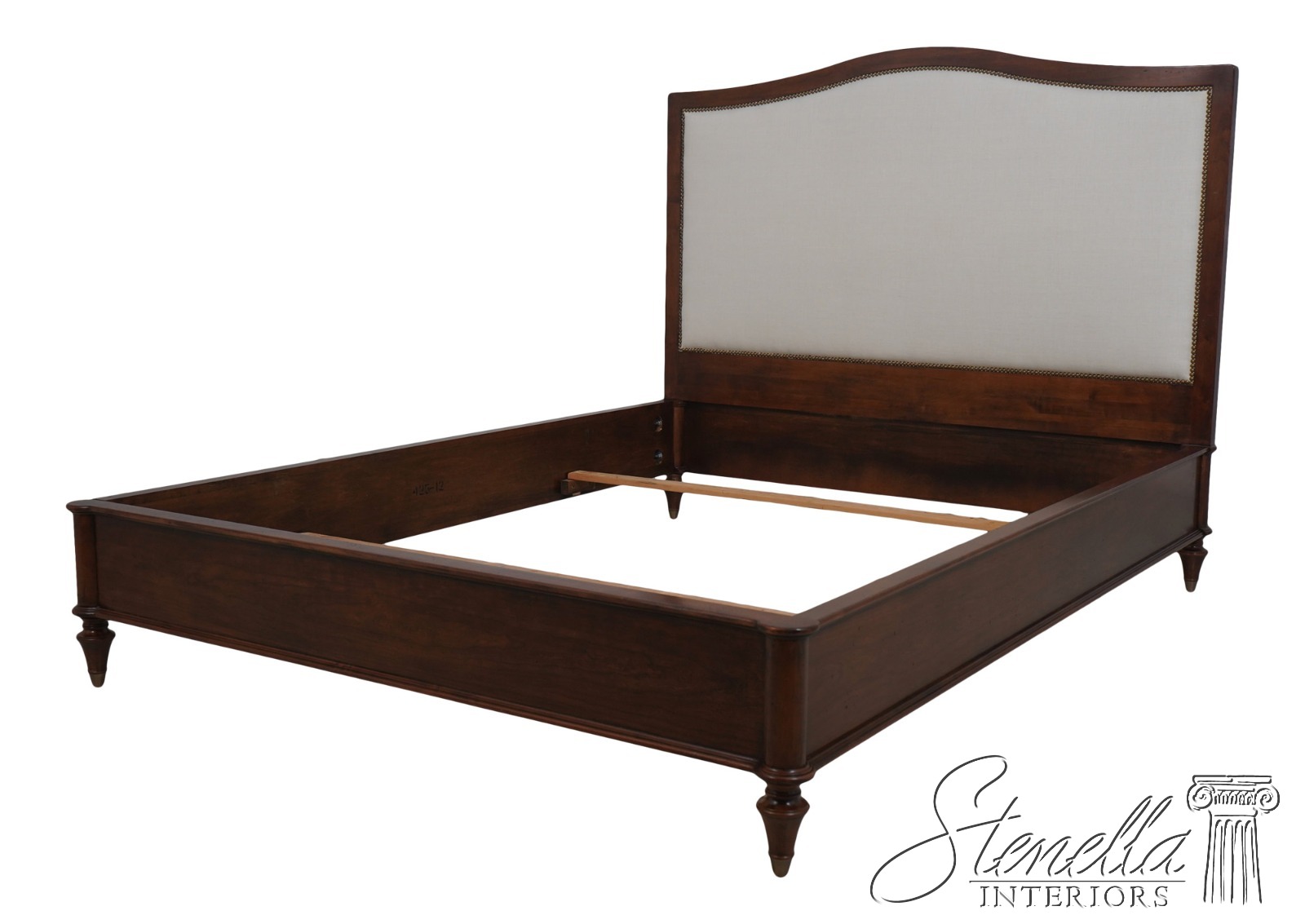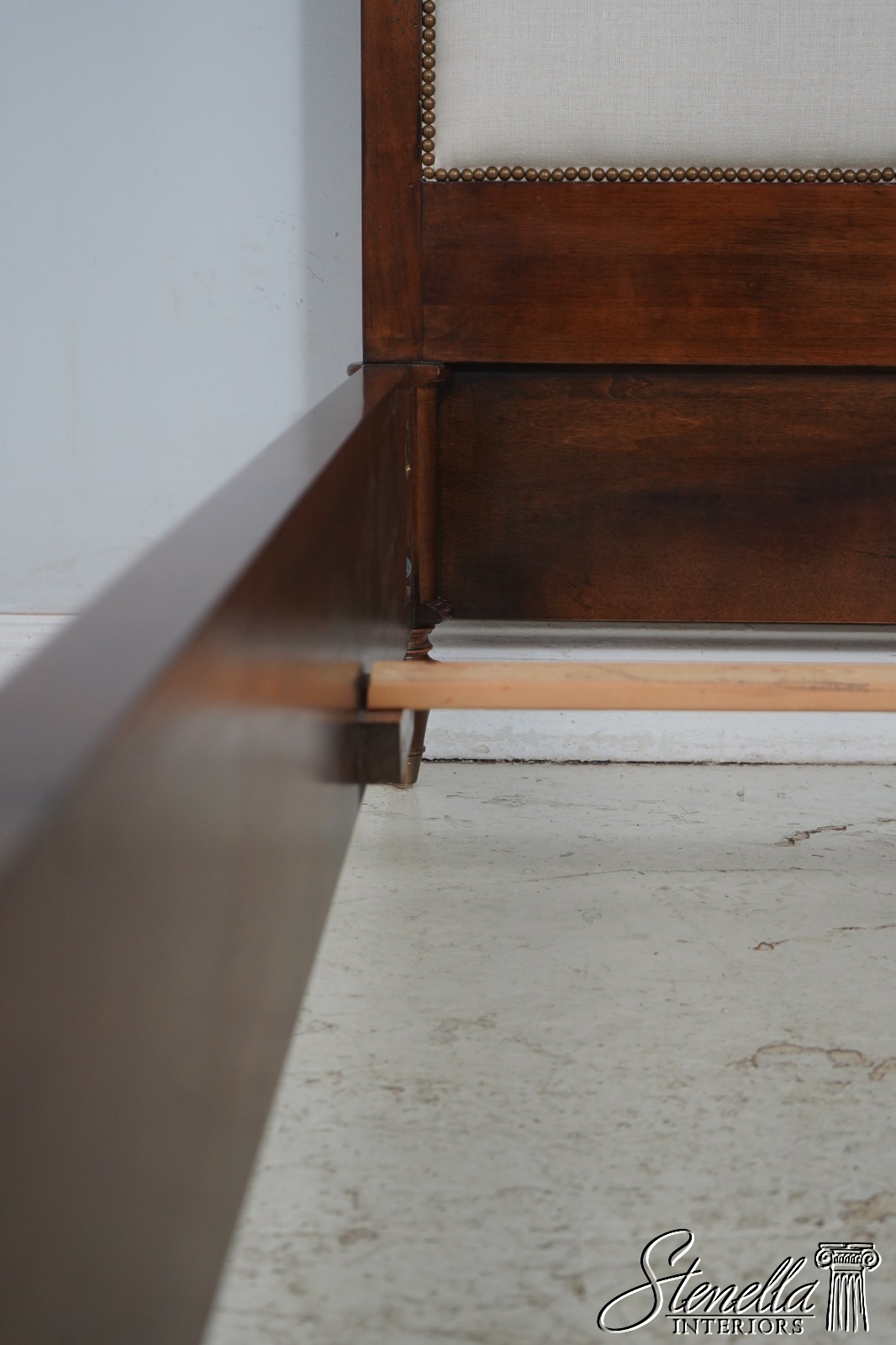 Details: Light Factory Distressing French Louis XVI Style High Quality Construction Cognac Finish Bolted Rail Construction Clean Off White Lined Upholstered Headboard Panel Un-Marked As to Manufacture - Comparable To Baker, Century Or Similar Manufacture