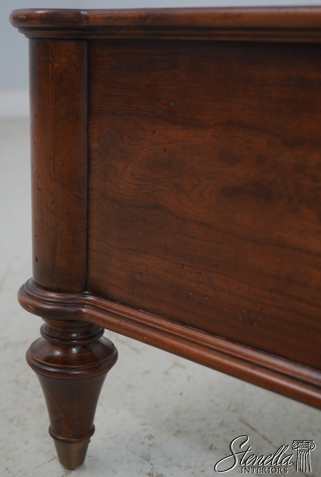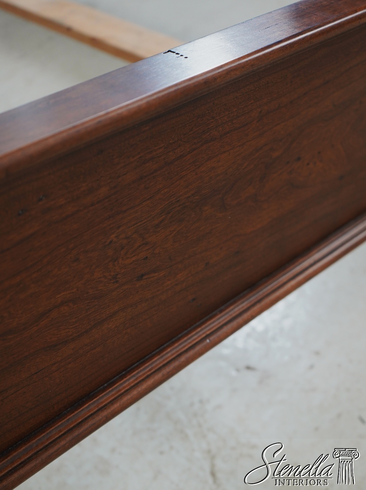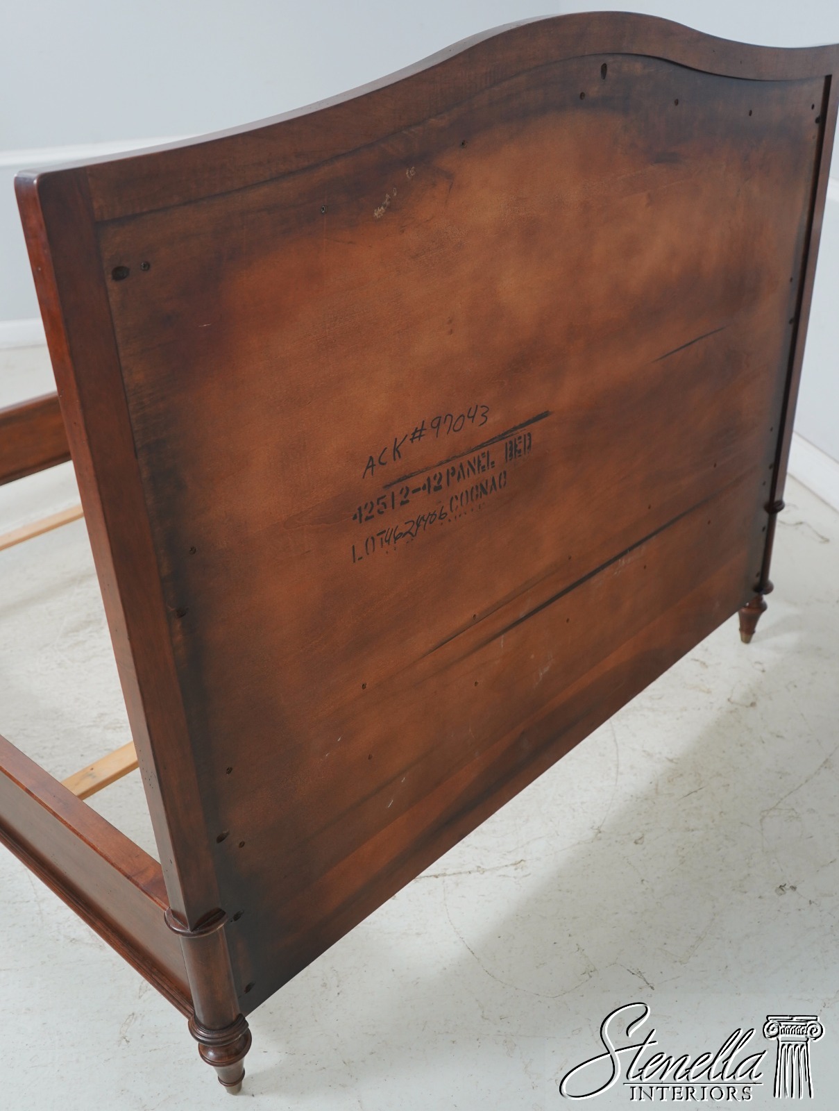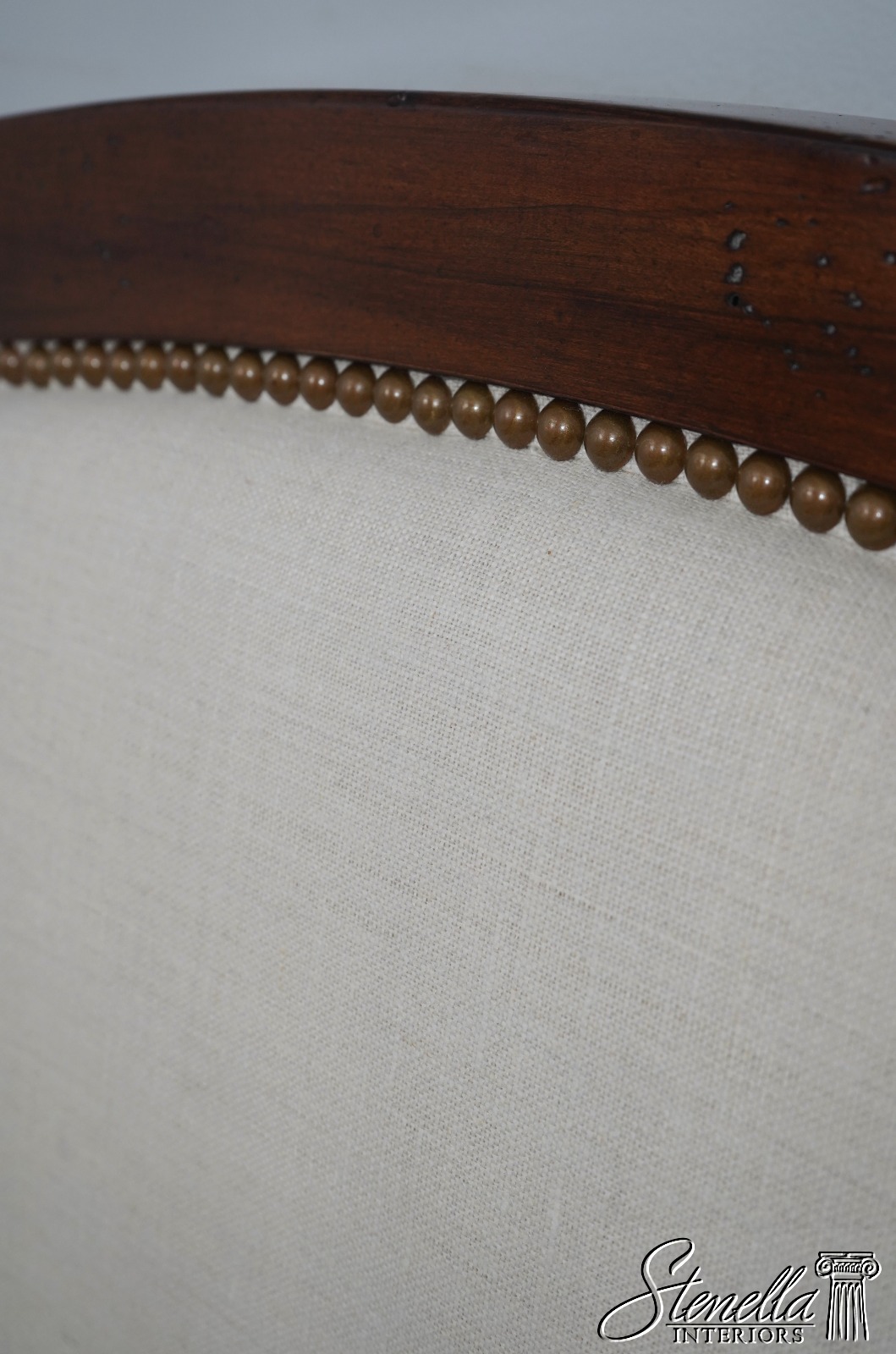 Details: Light Factory Distressing French Louis XVI Style High Quality Construction Cognac Finish Bolted Rail Construction Clean Off White Lined Upholstered Headboard Panel Un-Marked As to Manufacture - Comparable To Baker, Century Or Similar Manufacture