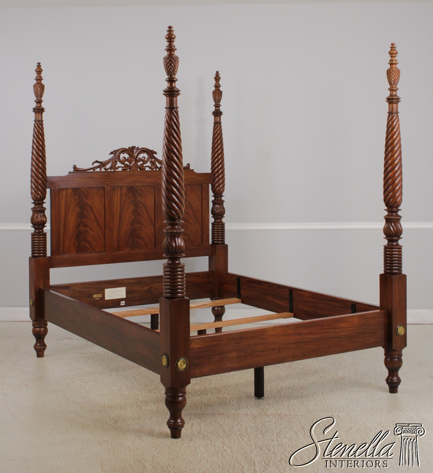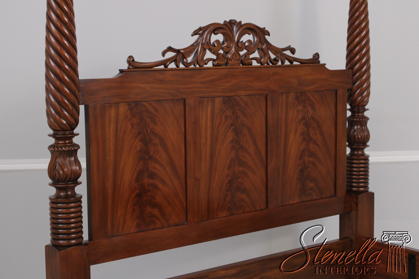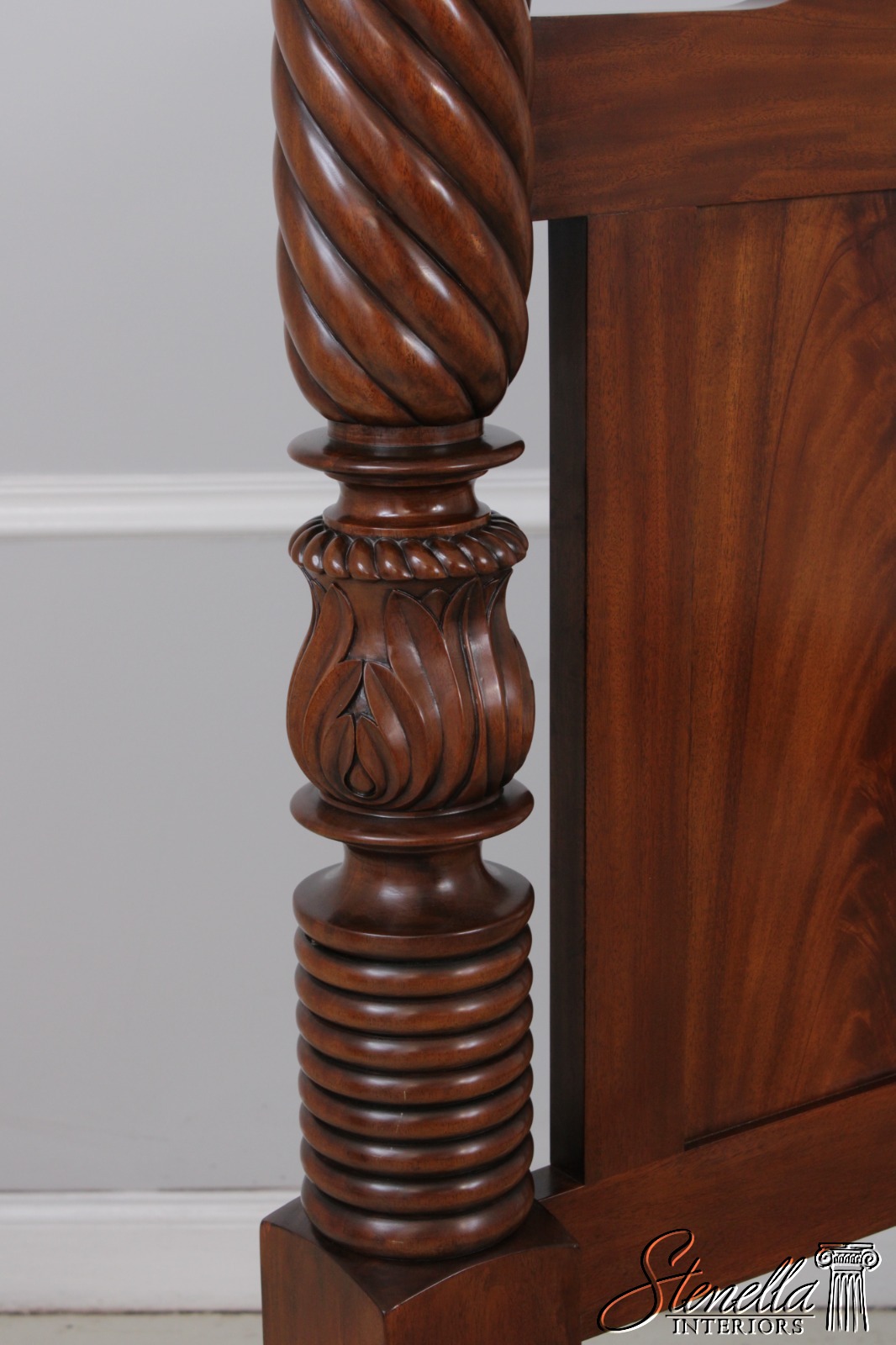 Details: Mahogany Fine Carved Details High Quality Construction Large Impressive Bed Figural Mahogany Headboard Twisted Posts Bolted Rail Construction Offered @ Fraction Original Retail Cost