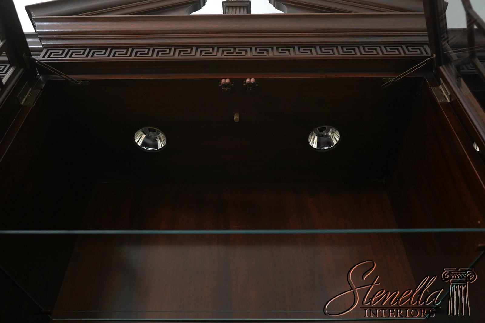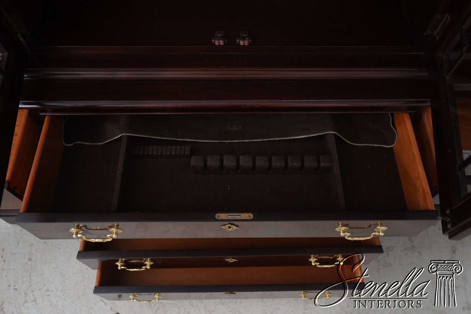Details: Dovetailed Drawer Construction 2 Piece Construction High Quality Construction Felt Lined Silverware Drawer 18 C. Design Chippendale Style Traditional Style Solid Brass Hardware Figural Mahogany Front Greek Key Molding Offered @ Fraction Original Retail Cost