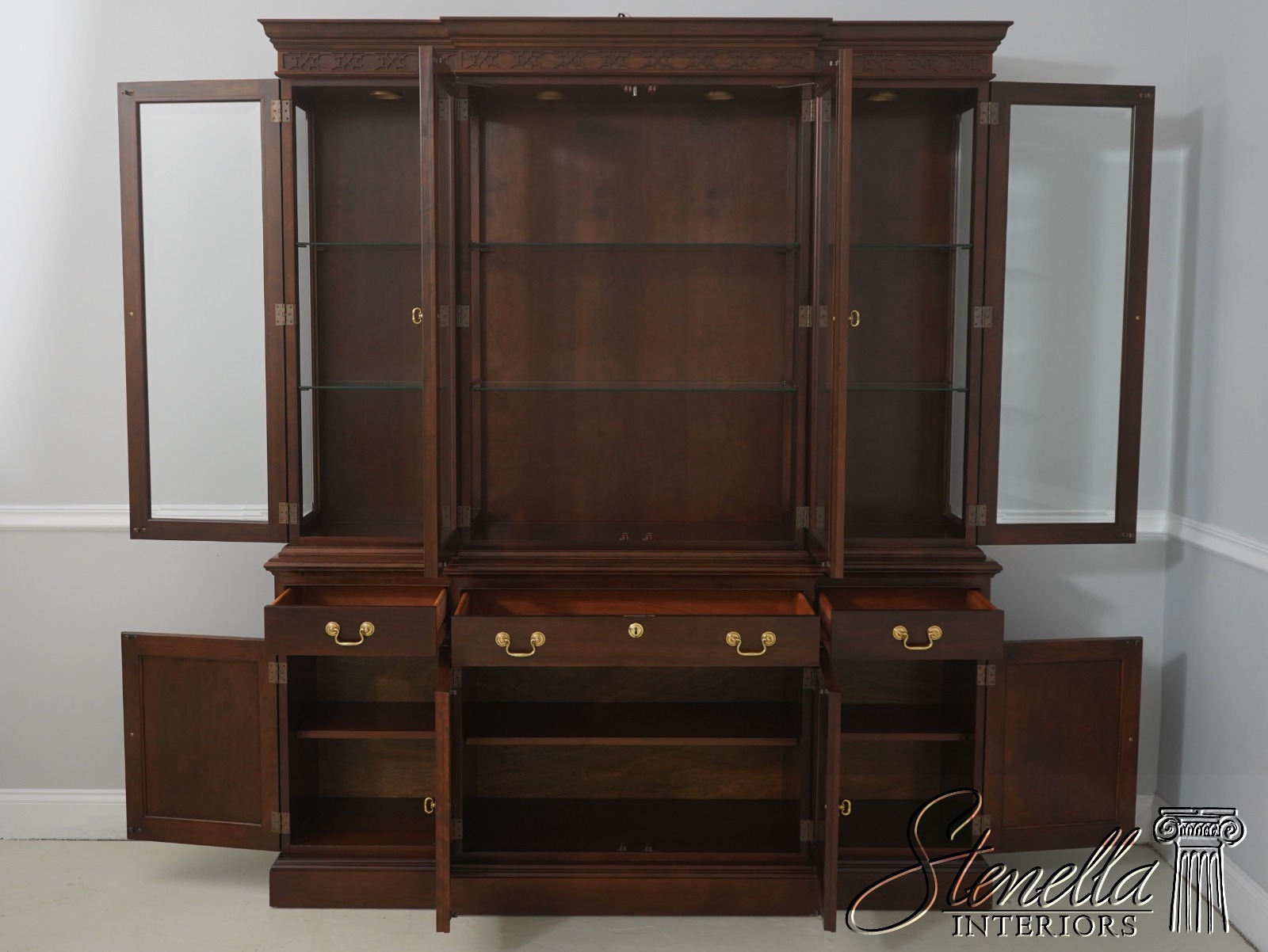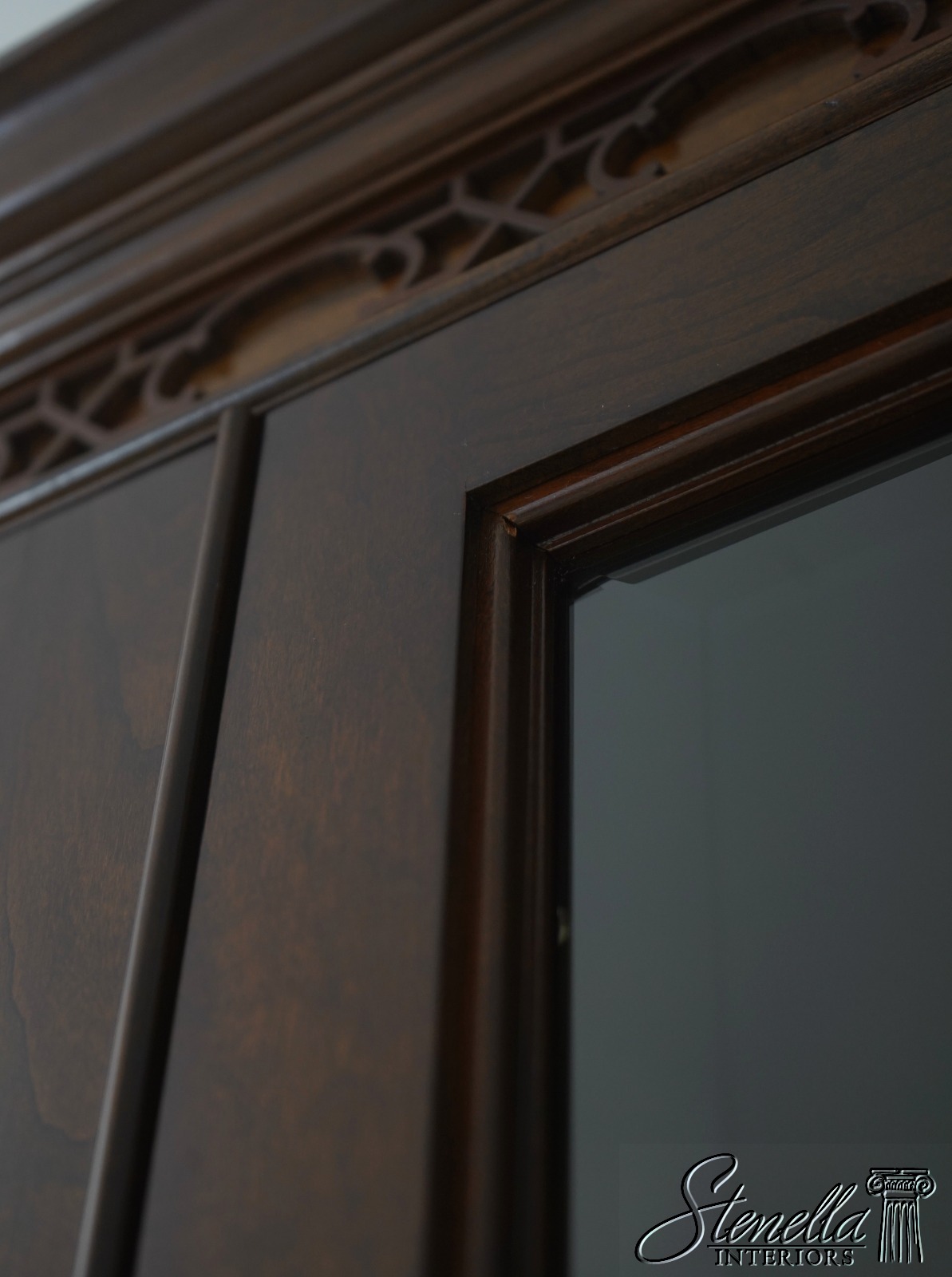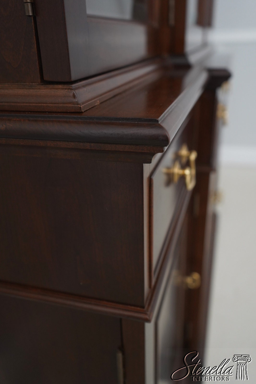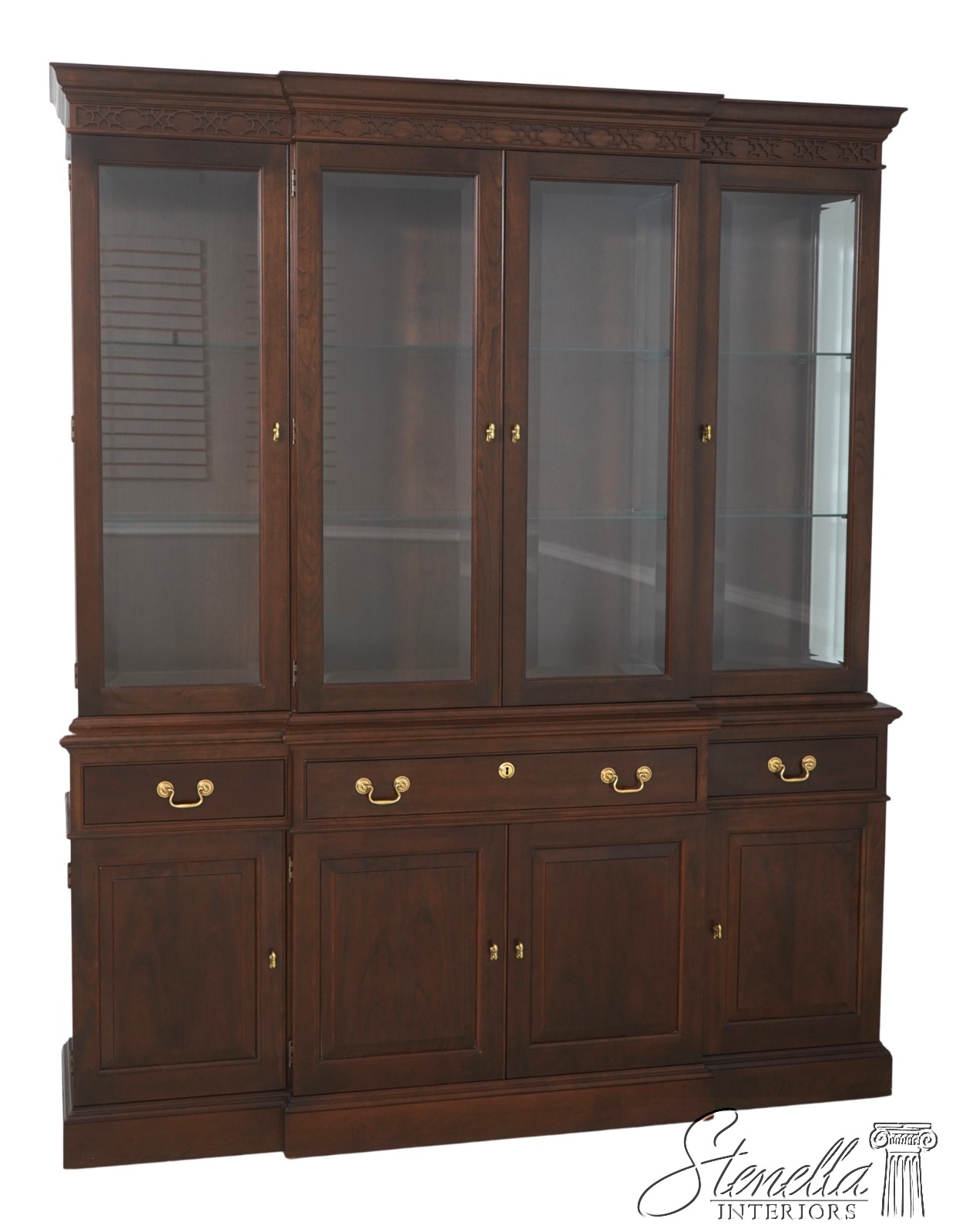 Details: Finish no.14 2 Piece Construction Adjustable Shelves Beveled Glass Dovetailed Drawer Construction High Quality Construction Raised Panel Doors Traditional Style Solid Brass Hardware Carved Lattice Crown Molding Offered @ Fraction Original Retail Cost