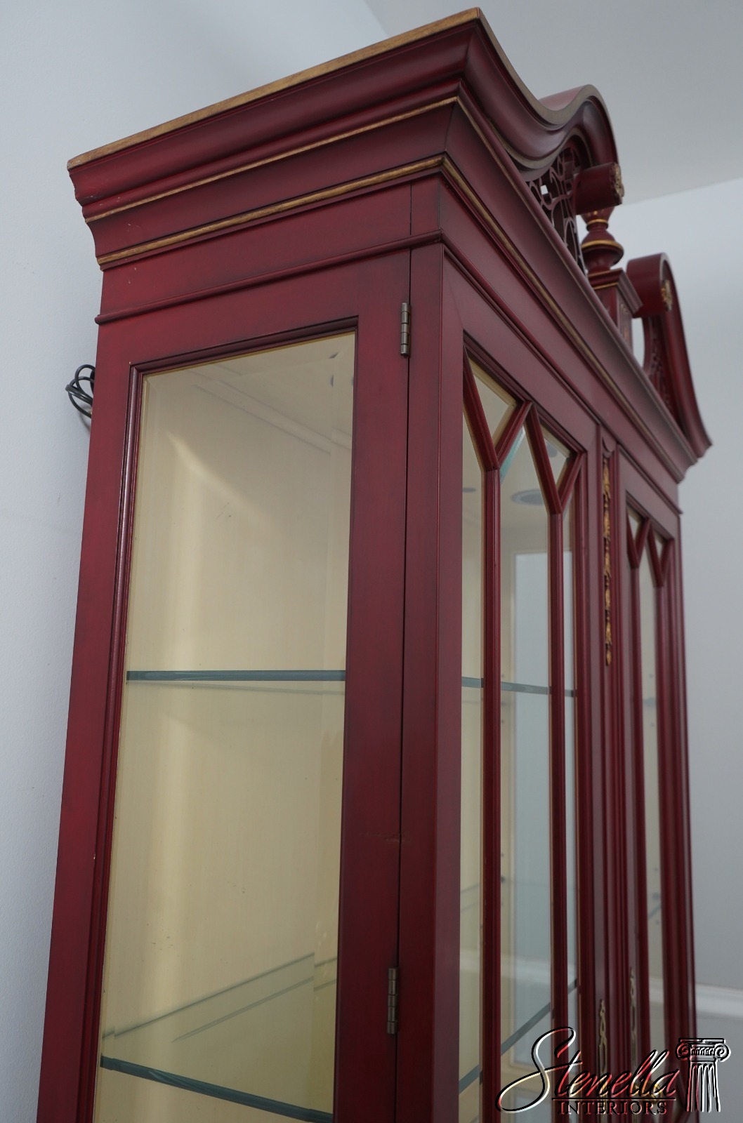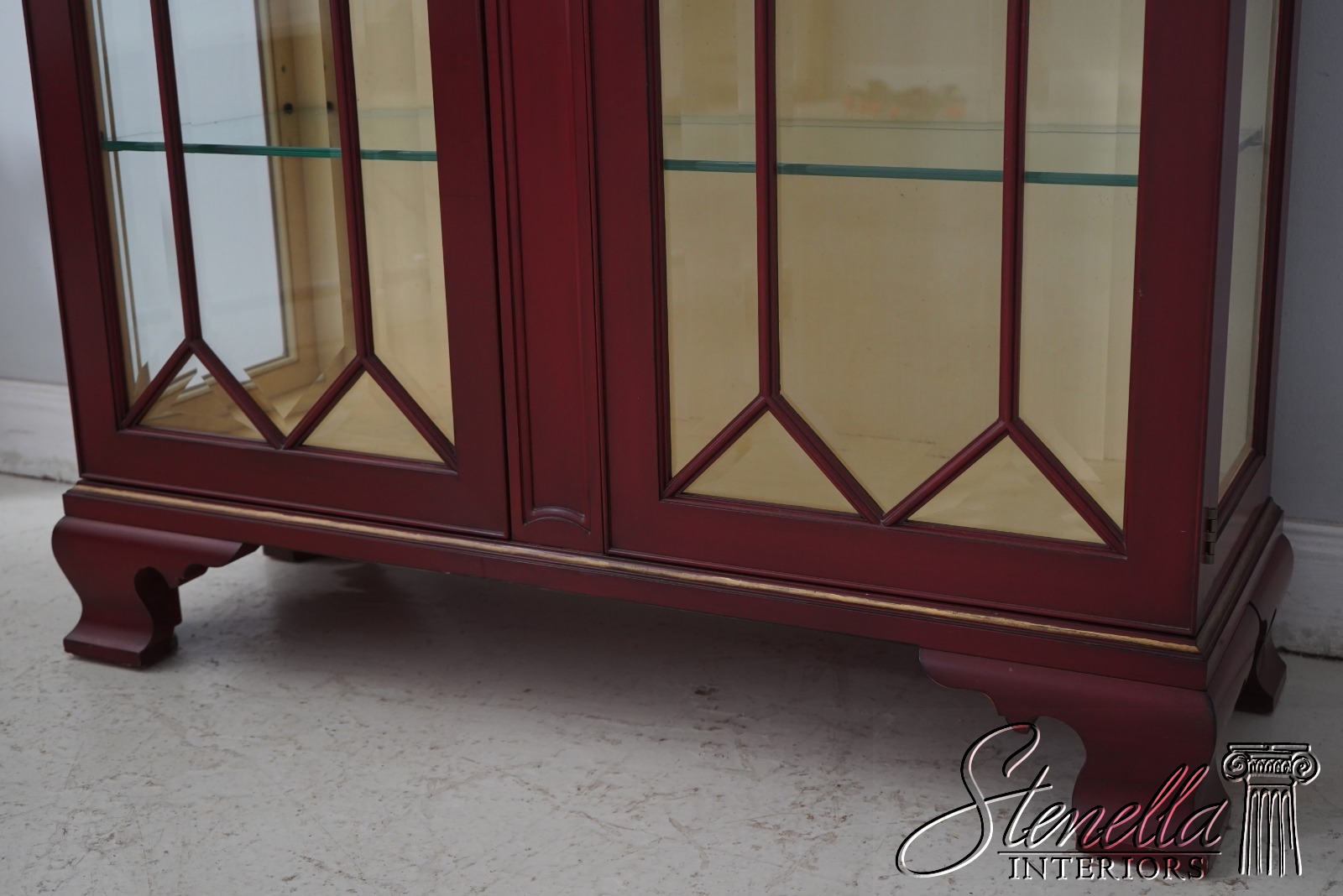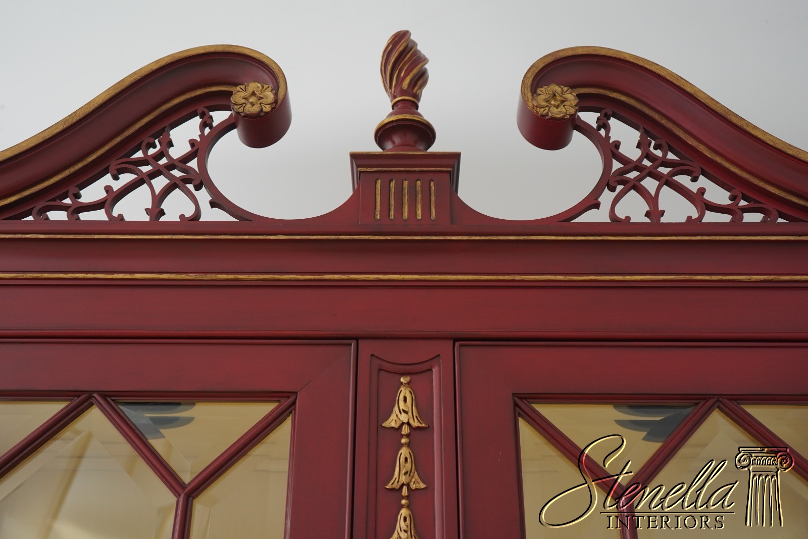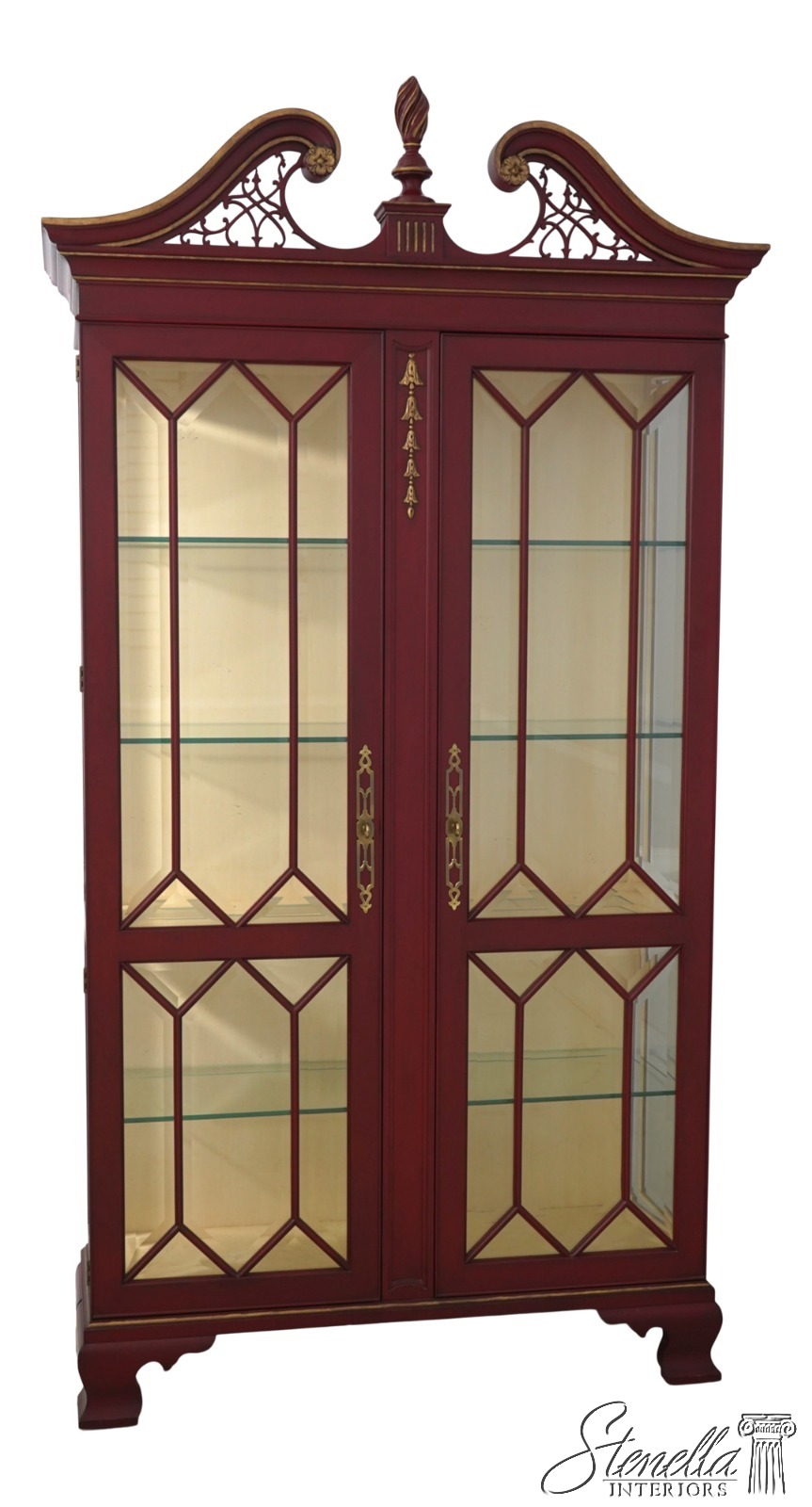 Details: Finish No.52 Model 2348 Beveled Glass Panel Doors Bracket Feet High Quality Construction Lighted Interior Pediment Top w. Finial 18 C. Design Chippendale Style Traditional Style Solid Brass Hardware Custom no.52 Red Painted Factory Finish Gold Highlights Offered @ Fraction Original Retail Cost