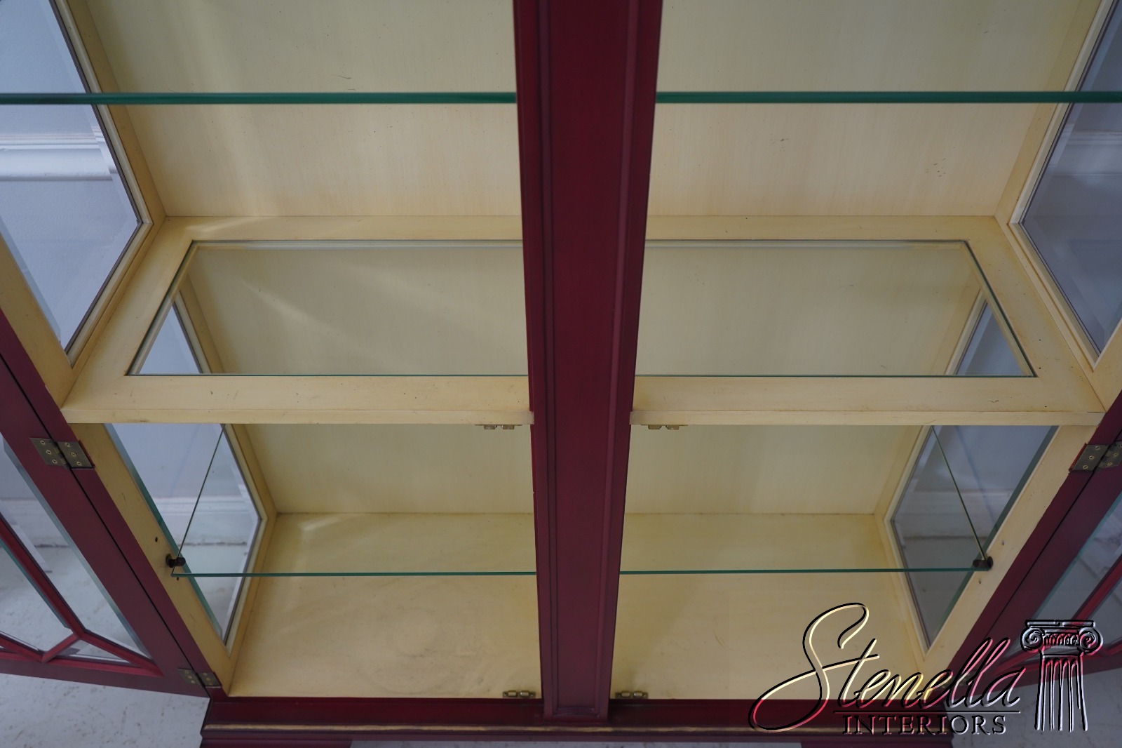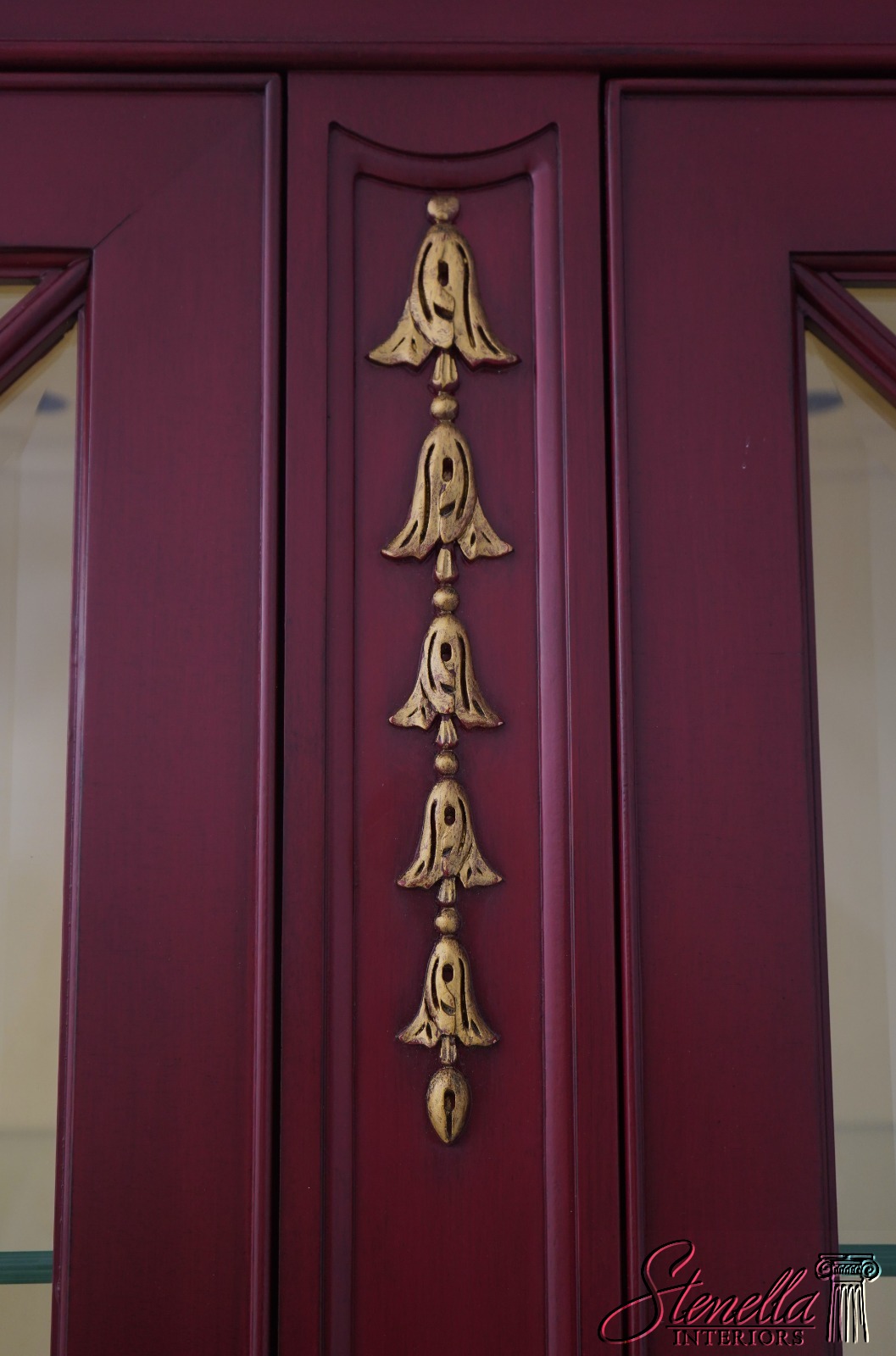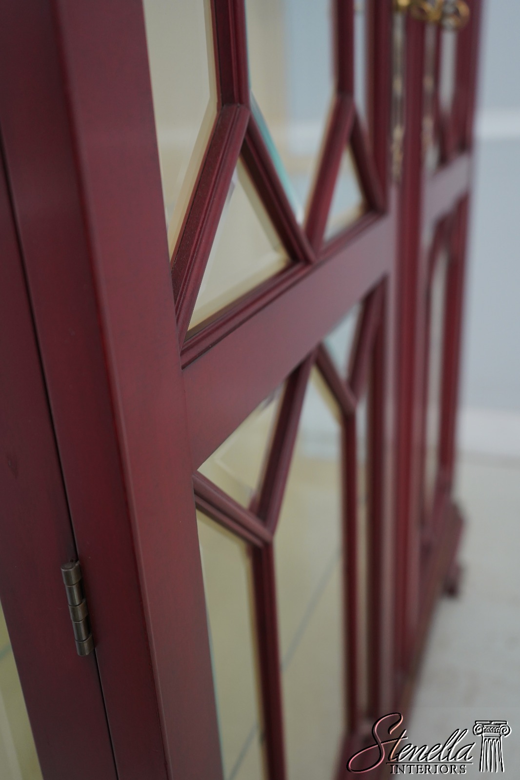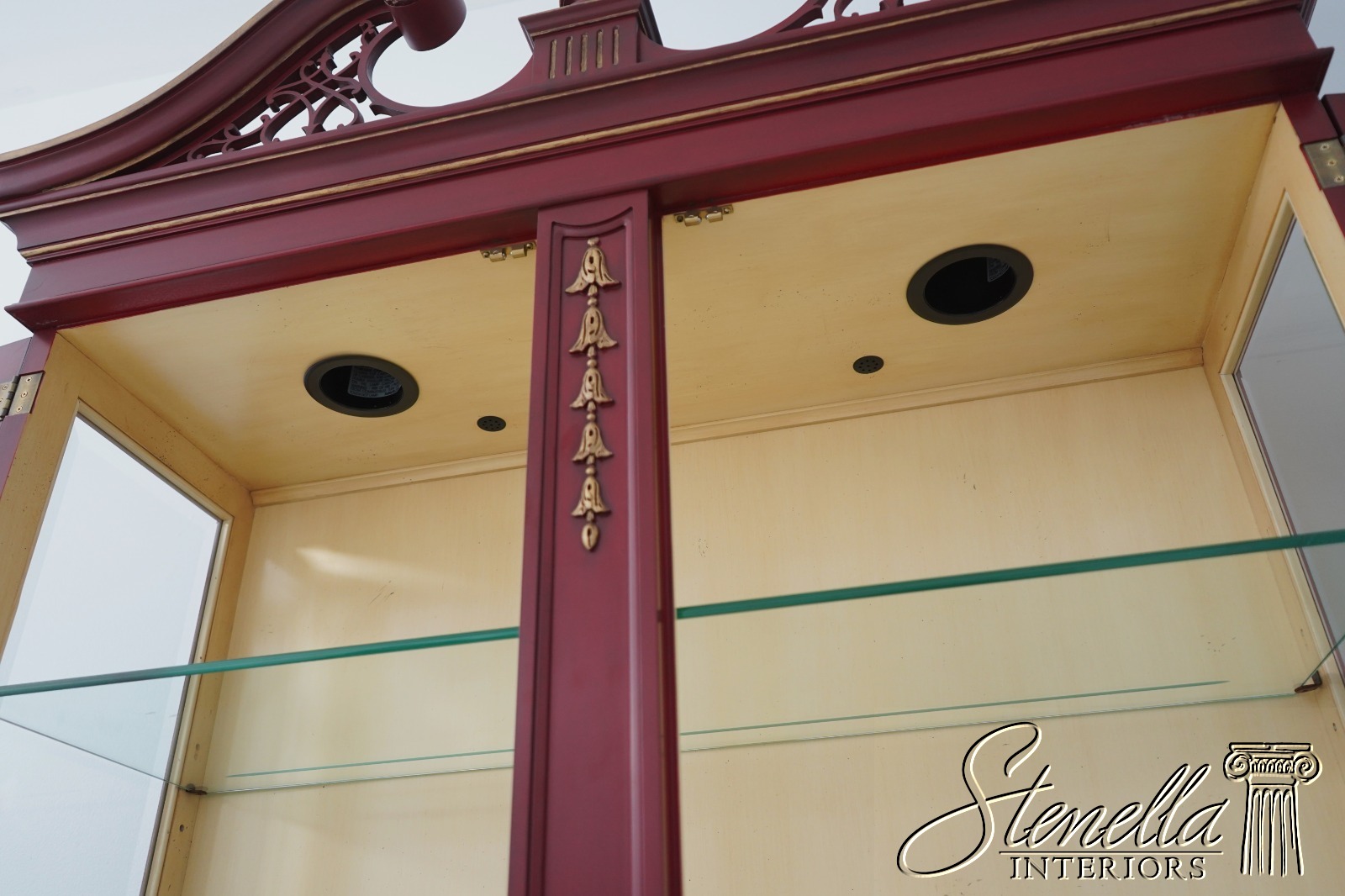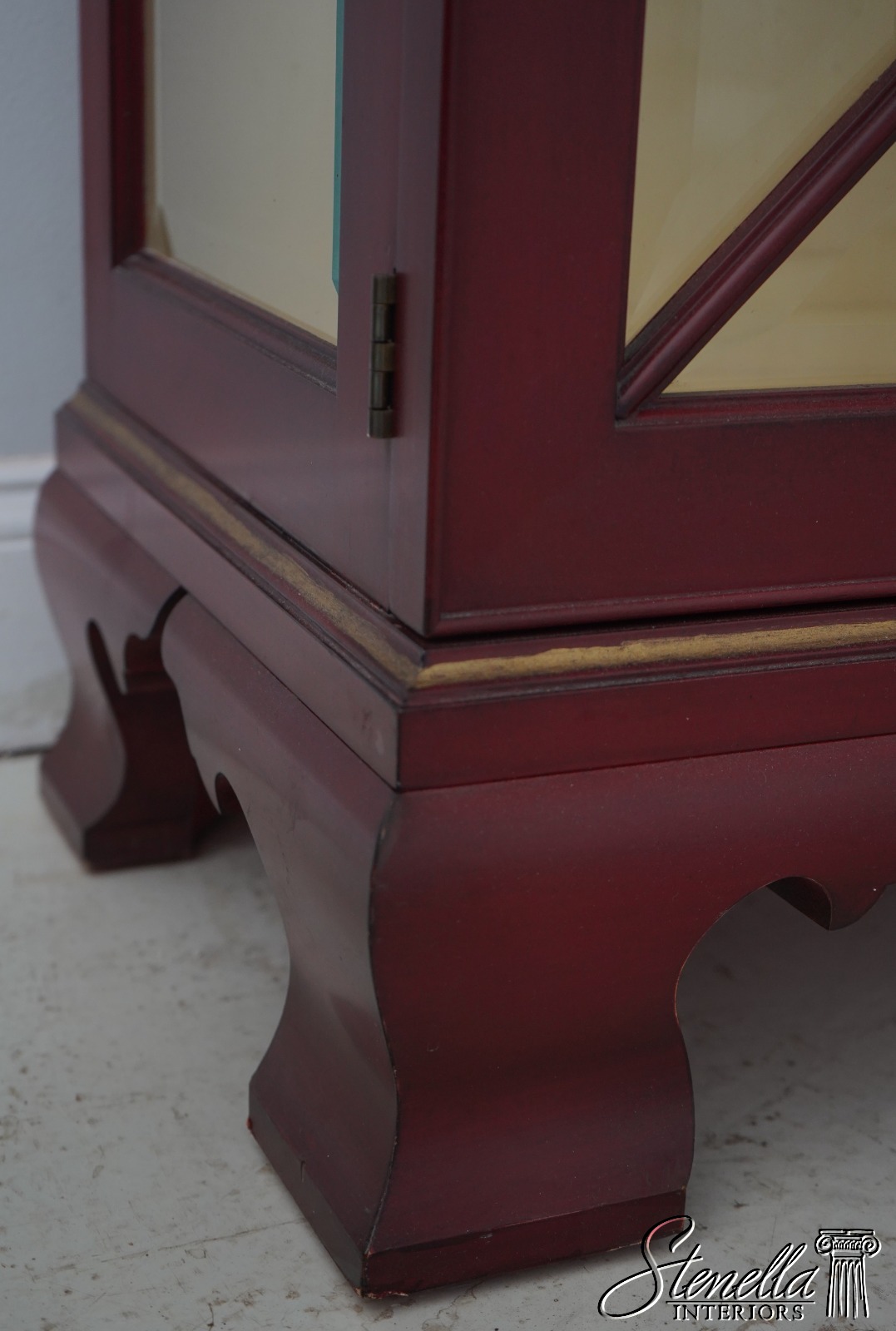 Details: Finish No.52 Model 2348 Beveled Glass Panel Doors Bracket Feet High Quality Construction Lighted Interior Pediment Top w. Finial 18 C. Design Chippendale Style Traditional Style Solid Brass Hardware Custom no.52 Red Painted Factory Finish Gold Highlights Offered @ Fraction Original Retail Cost