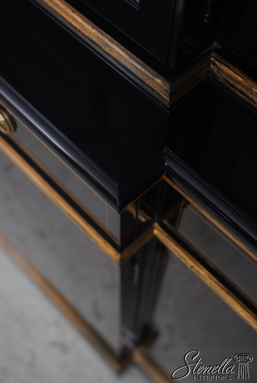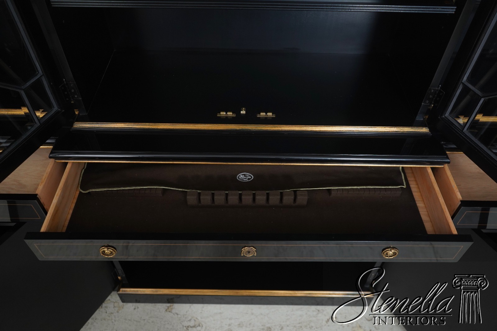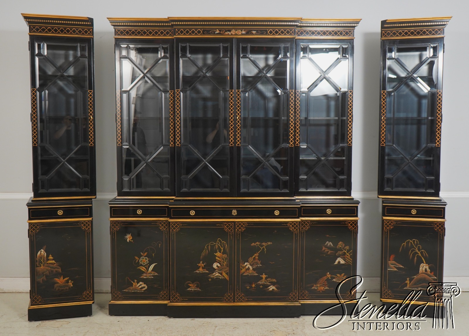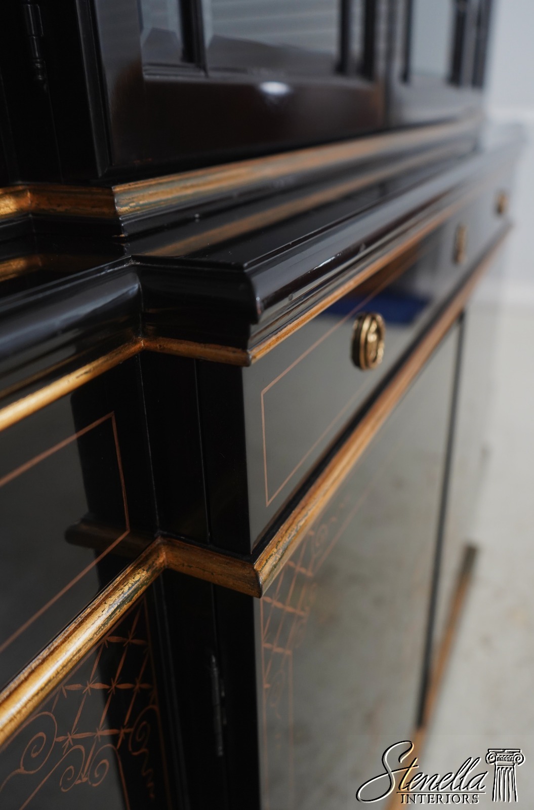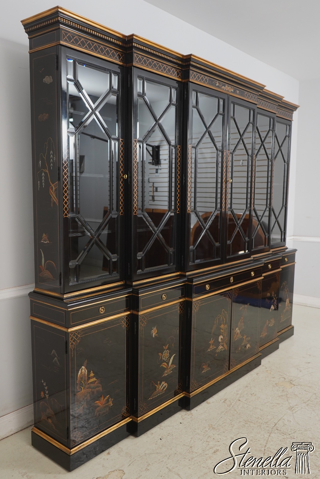 Details: Beveled Glass Doors Gold Highlights High Sheen Black Lacquer Finish Stunning Chinoiserie Paint Decorated High Quality Construction Felt Lined Silverware Drawer Large Impressive Cabinet Lighted Interior Hand Crafted By Karges Top Is In 3 Pieces & Base Is In 3 Pieces Solid Brass Hardware Dentil Crown Molding Offered @ Fraction Original Retail Cost - Over $90,000 New!!