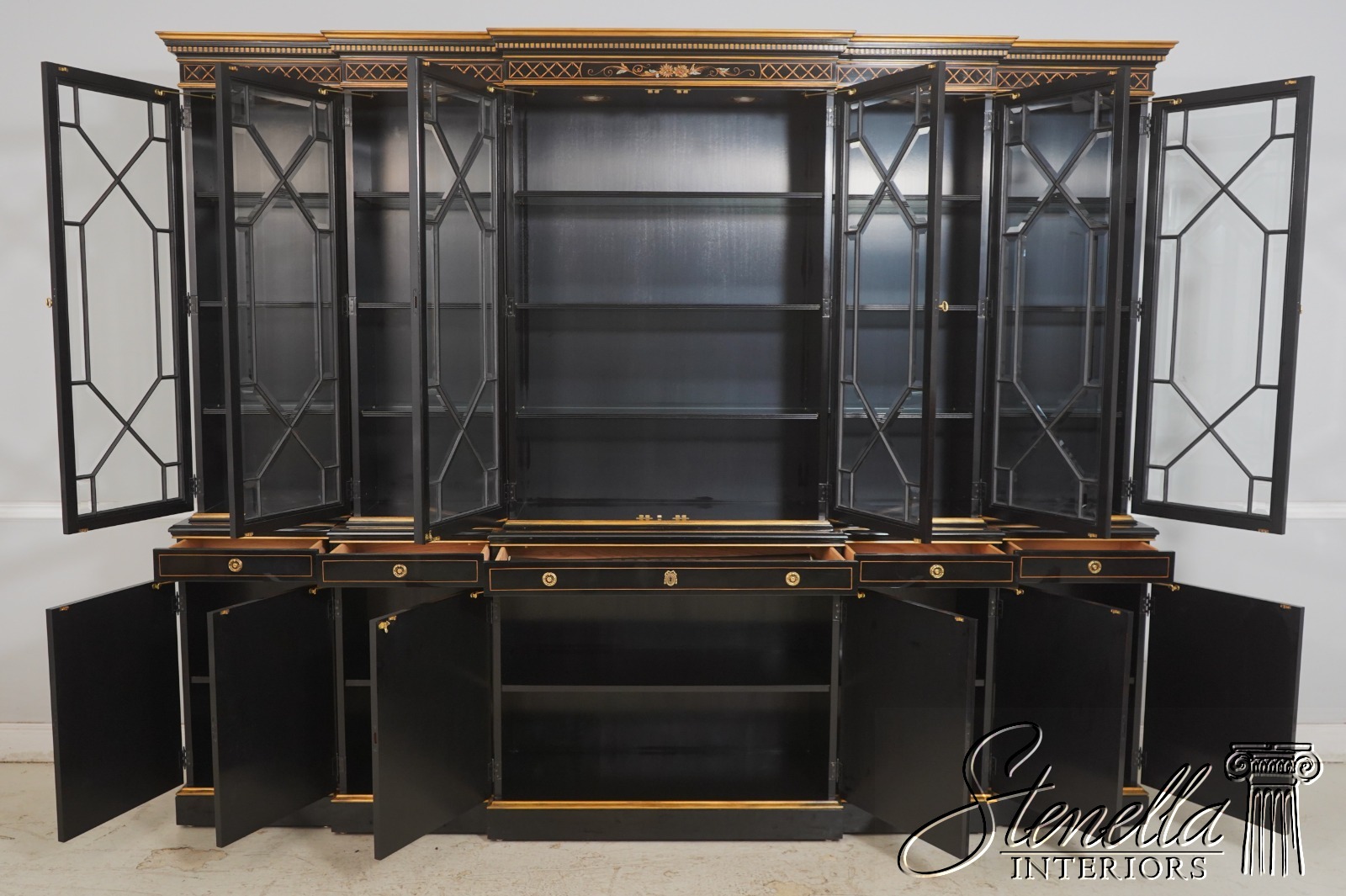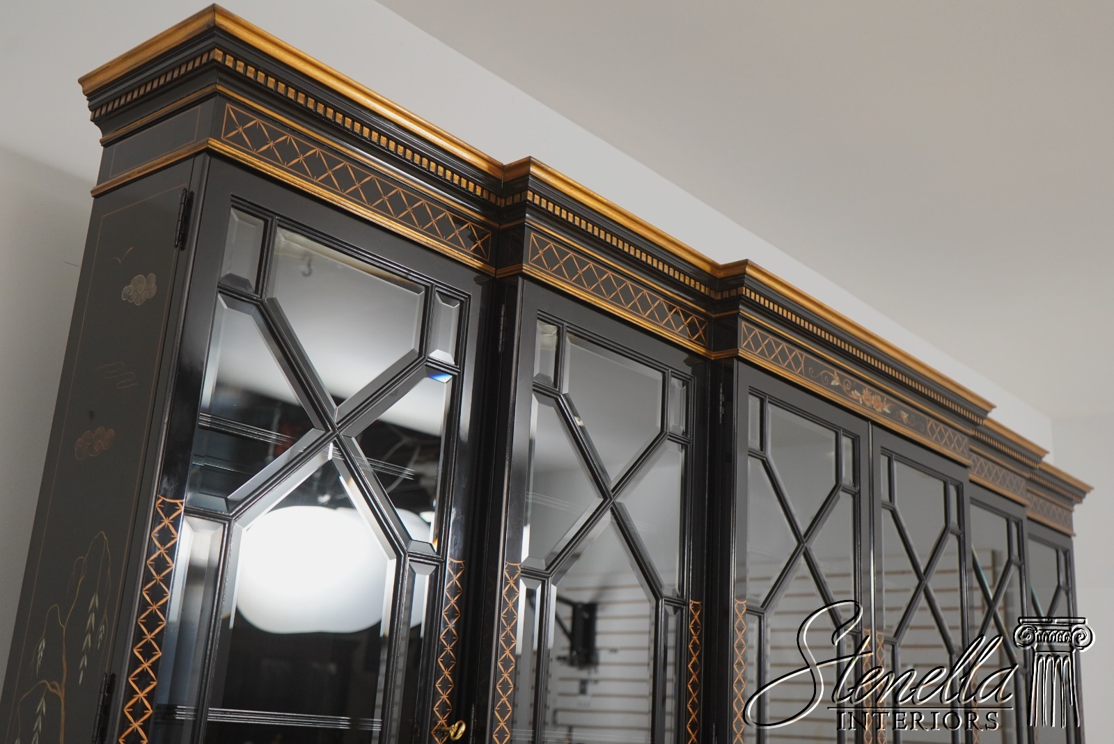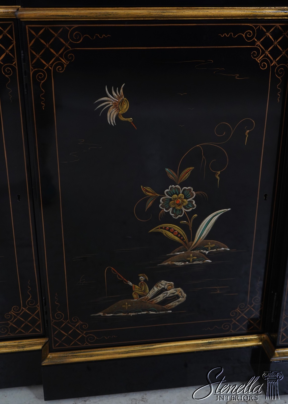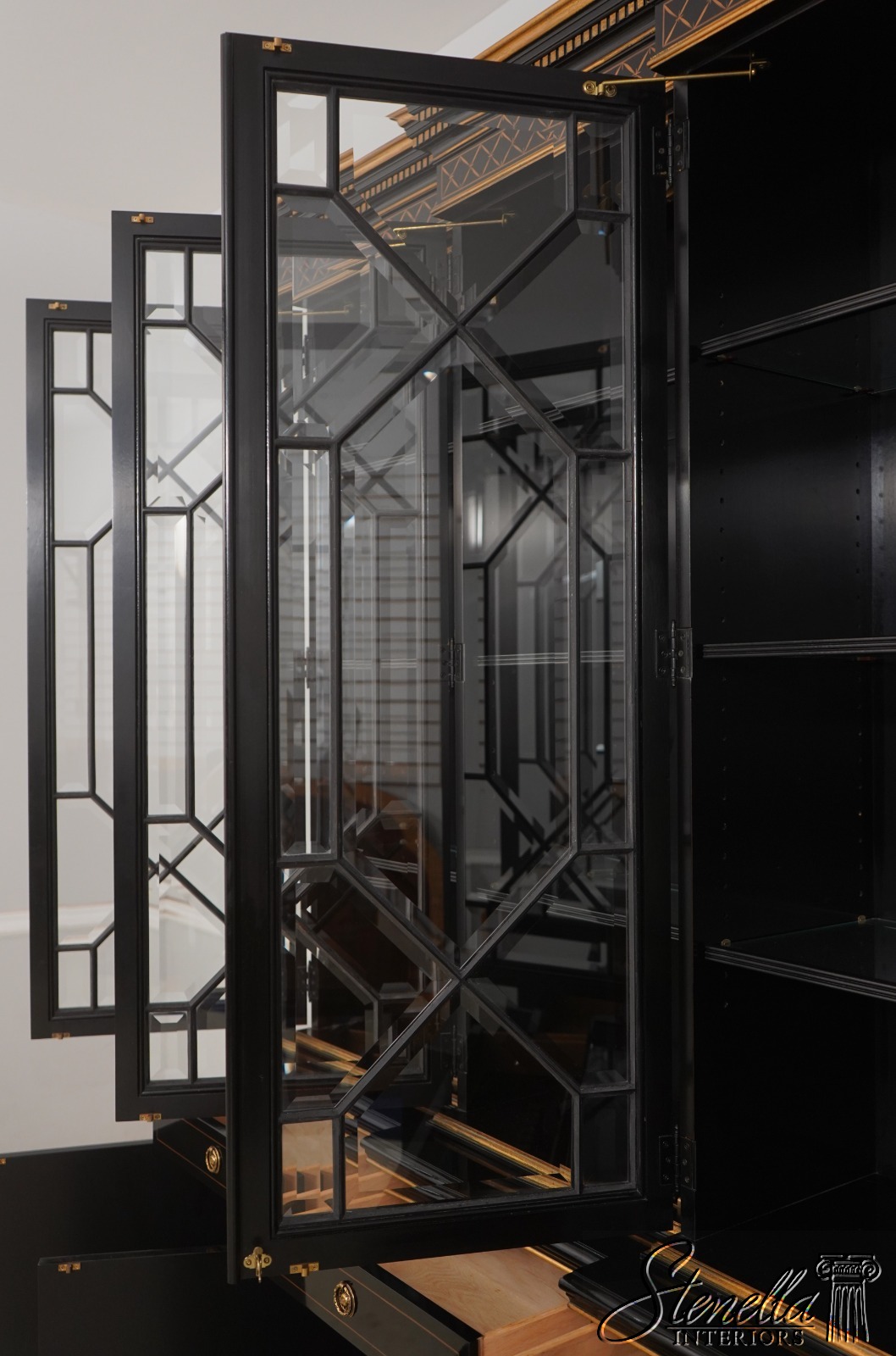 Details: Beveled Glass Doors Gold Highlights High Sheen Black Lacquer Finish Stunning Chinoiserie Paint Decorated High Quality Construction Felt Lined Silverware Drawer Large Impressive Cabinet Lighted Interior Hand Crafted By Karges Top Is In 3 Pieces & Base Is In 3 Pieces Solid Brass Hardware Dentil Crown Molding Offered @ Fraction Original Retail Cost - Over $90,000 New!!