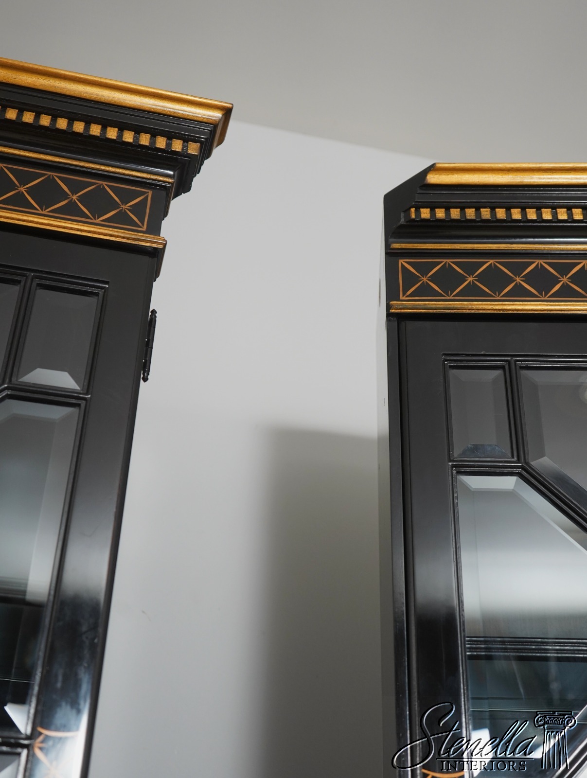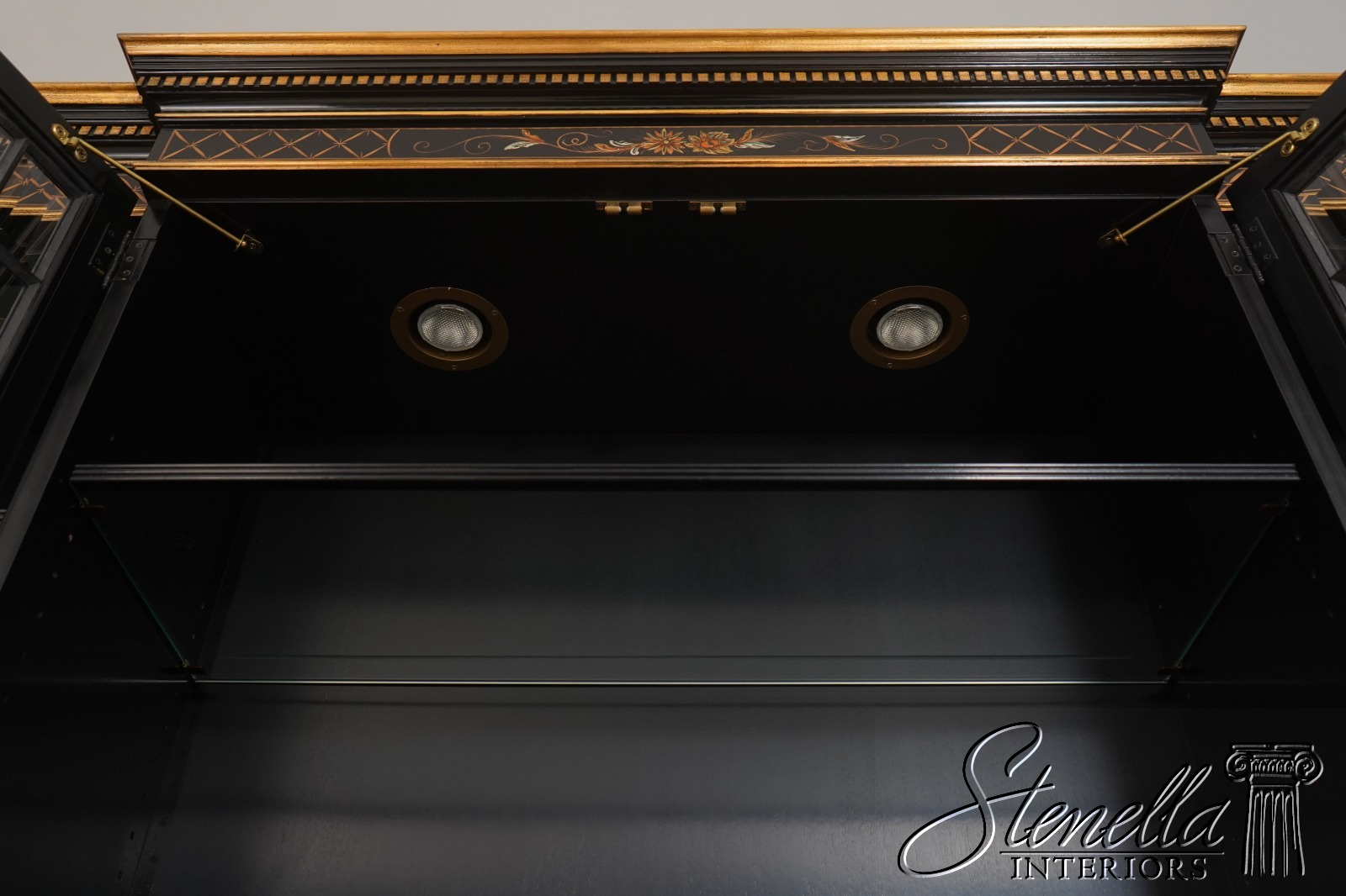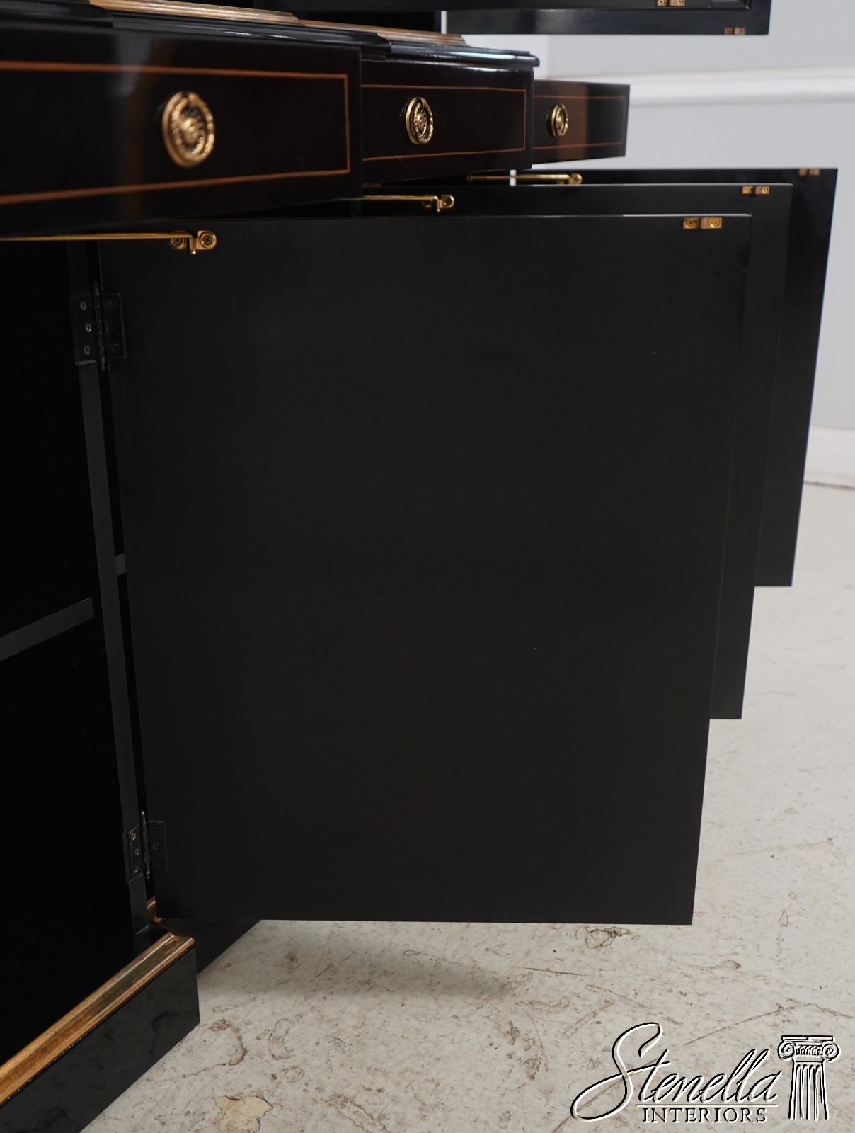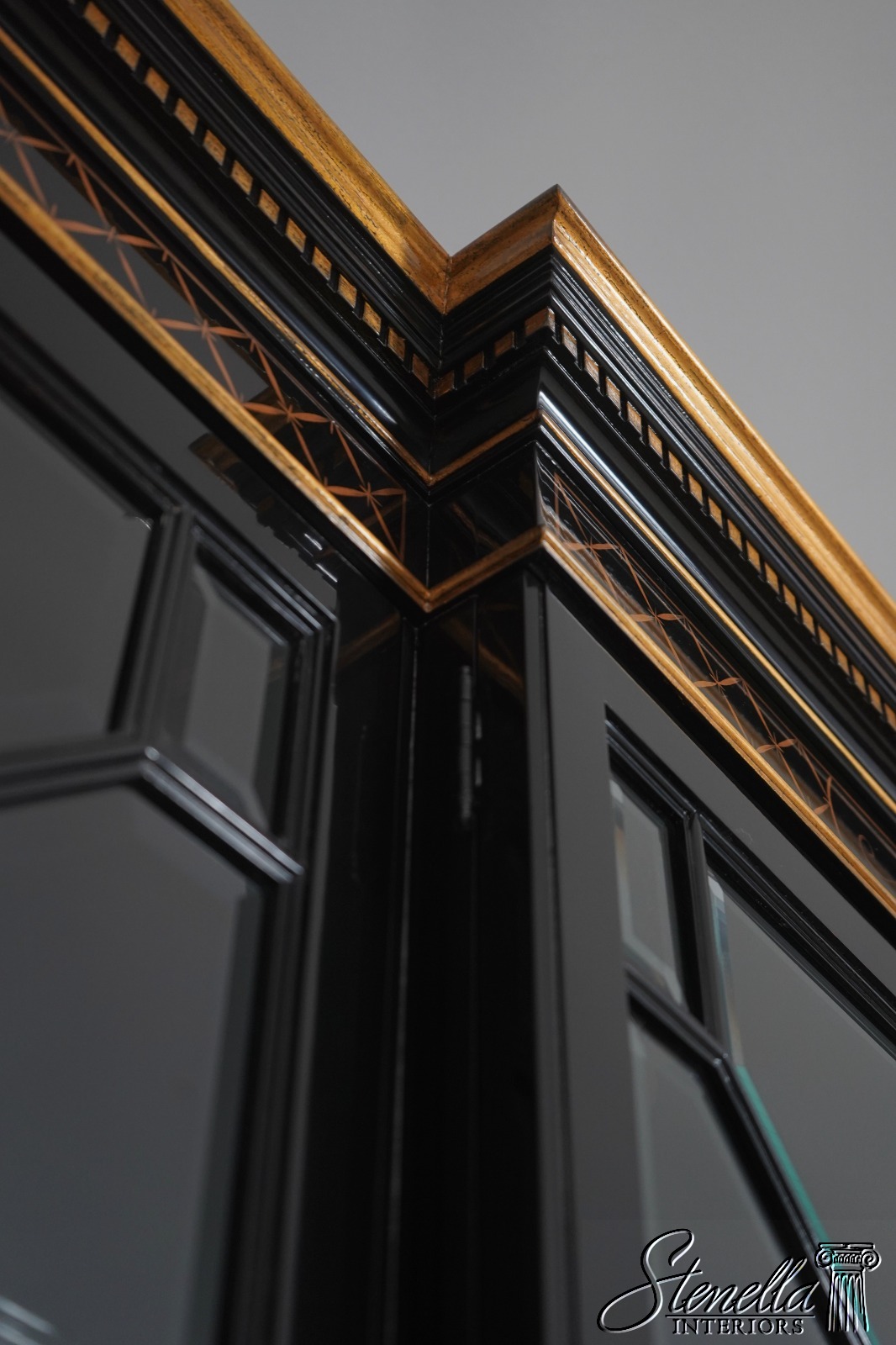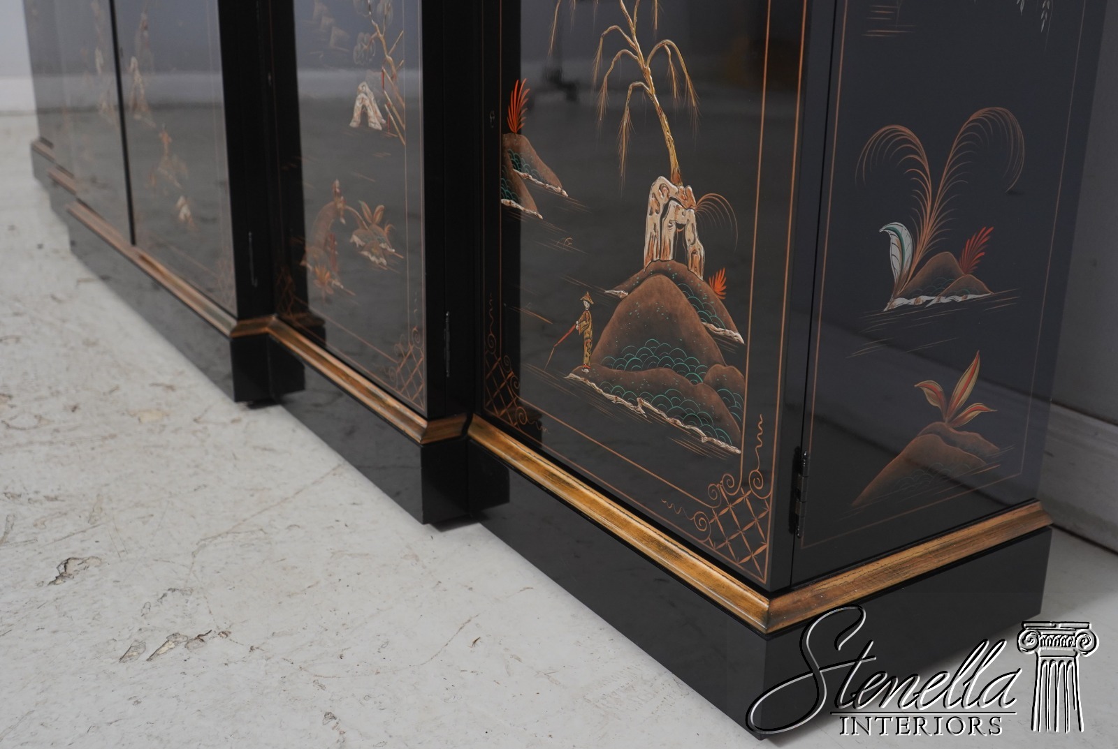 Details: Beveled Glass Doors Gold Highlights High Sheen Black Lacquer Finish Stunning Chinoiserie Paint Decorated High Quality Construction Felt Lined Silverware Drawer Large Impressive Cabinet Lighted Interior Hand Crafted By Karges Top Is In 3 Pieces & Base Is In 3 Pieces Solid Brass Hardware Dentil Crown Molding Offered @ Fraction Original Retail Cost - Over $90,000 New!!