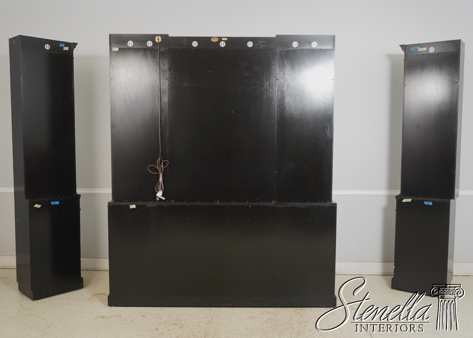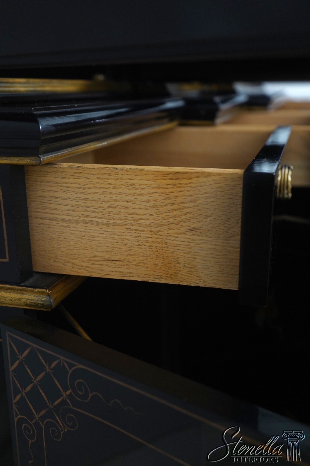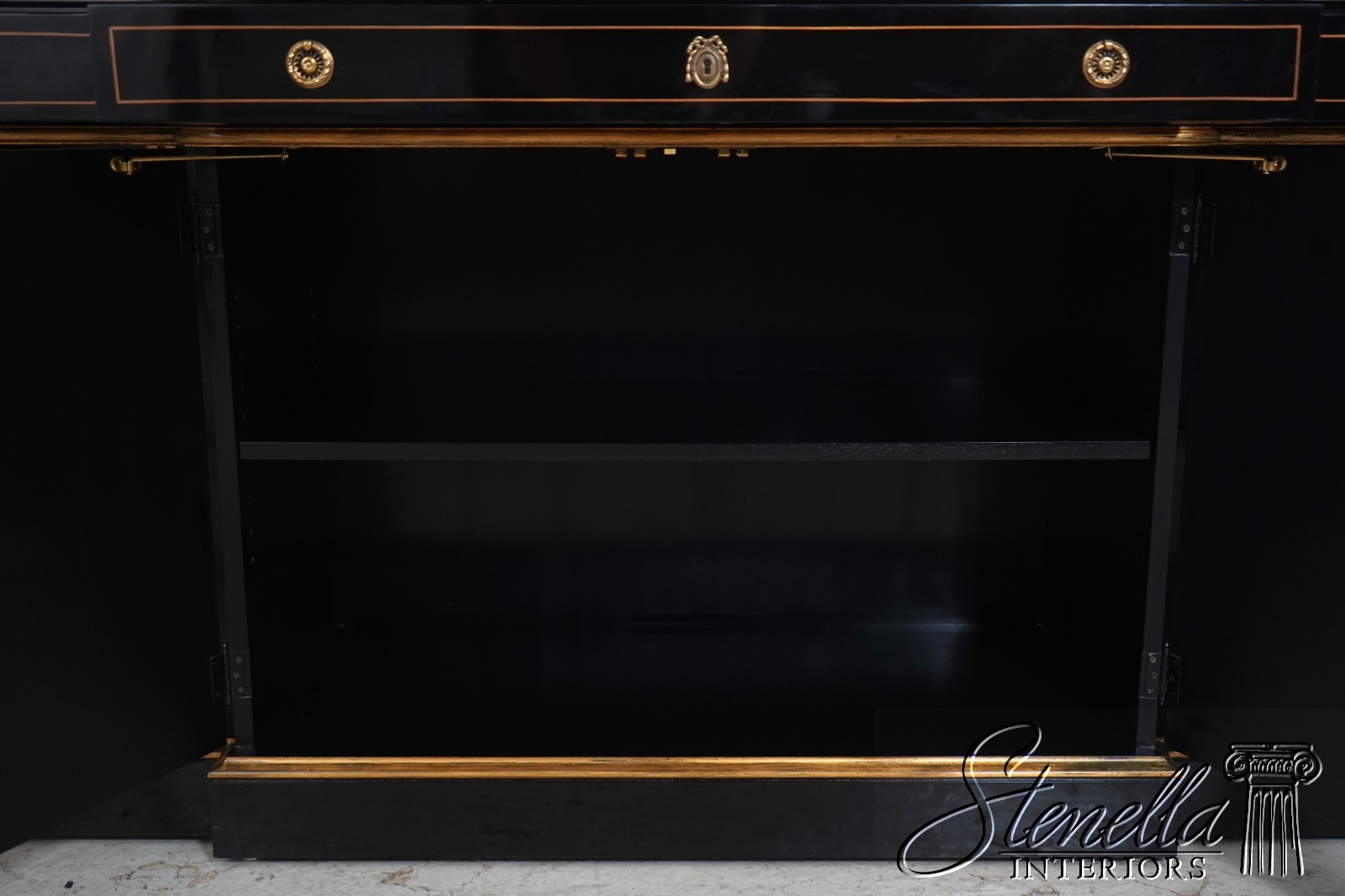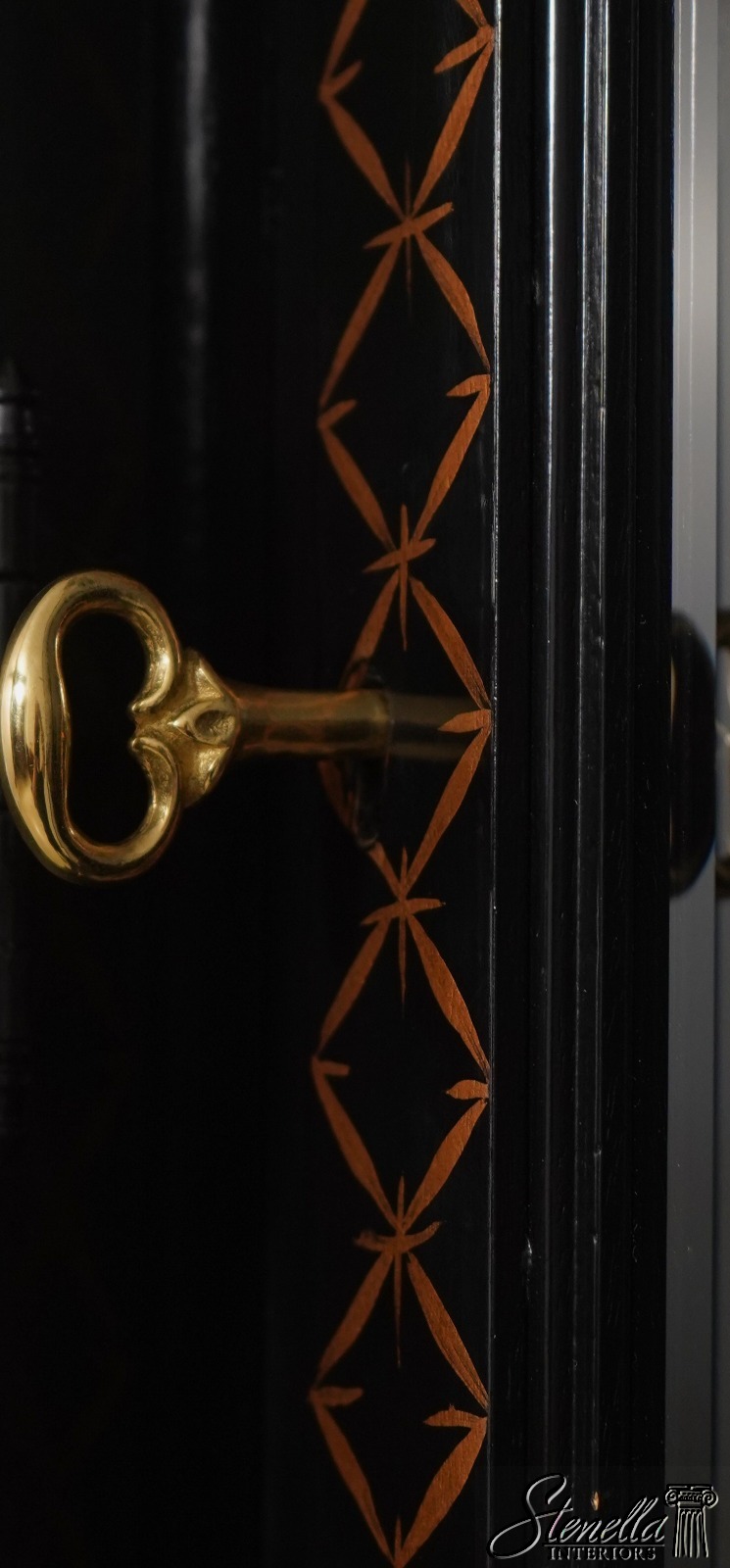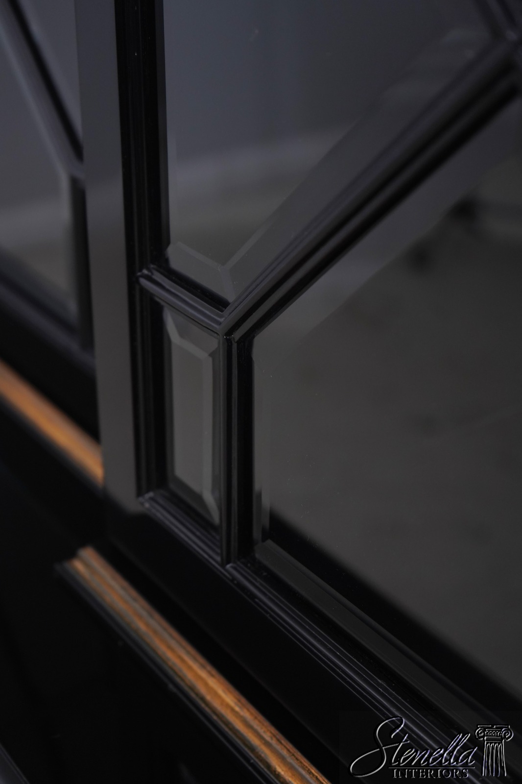 Details: Beveled Glass Doors Gold Highlights High Sheen Black Lacquer Finish Stunning Chinoiserie Paint Decorated High Quality Construction Felt Lined Silverware Drawer Large Impressive Cabinet Lighted Interior Hand Crafted By Karges Top Is In 3 Pieces & Base Is In 3 Pieces Solid Brass Hardware Dentil Crown Molding Offered @ Fraction Original Retail Cost - Over $90,000 New!!