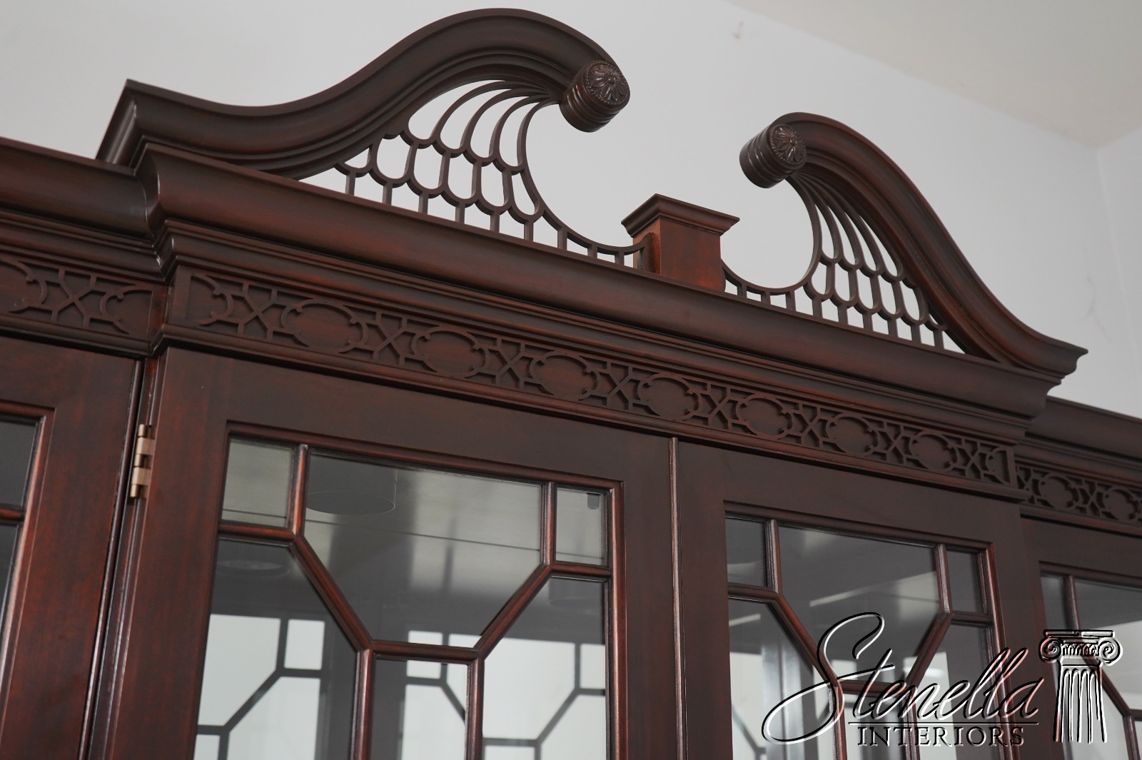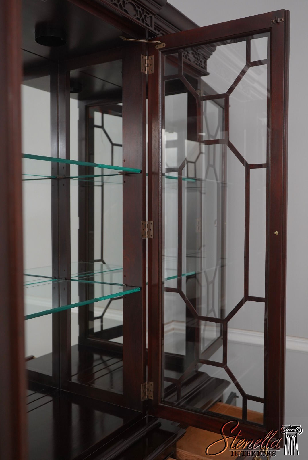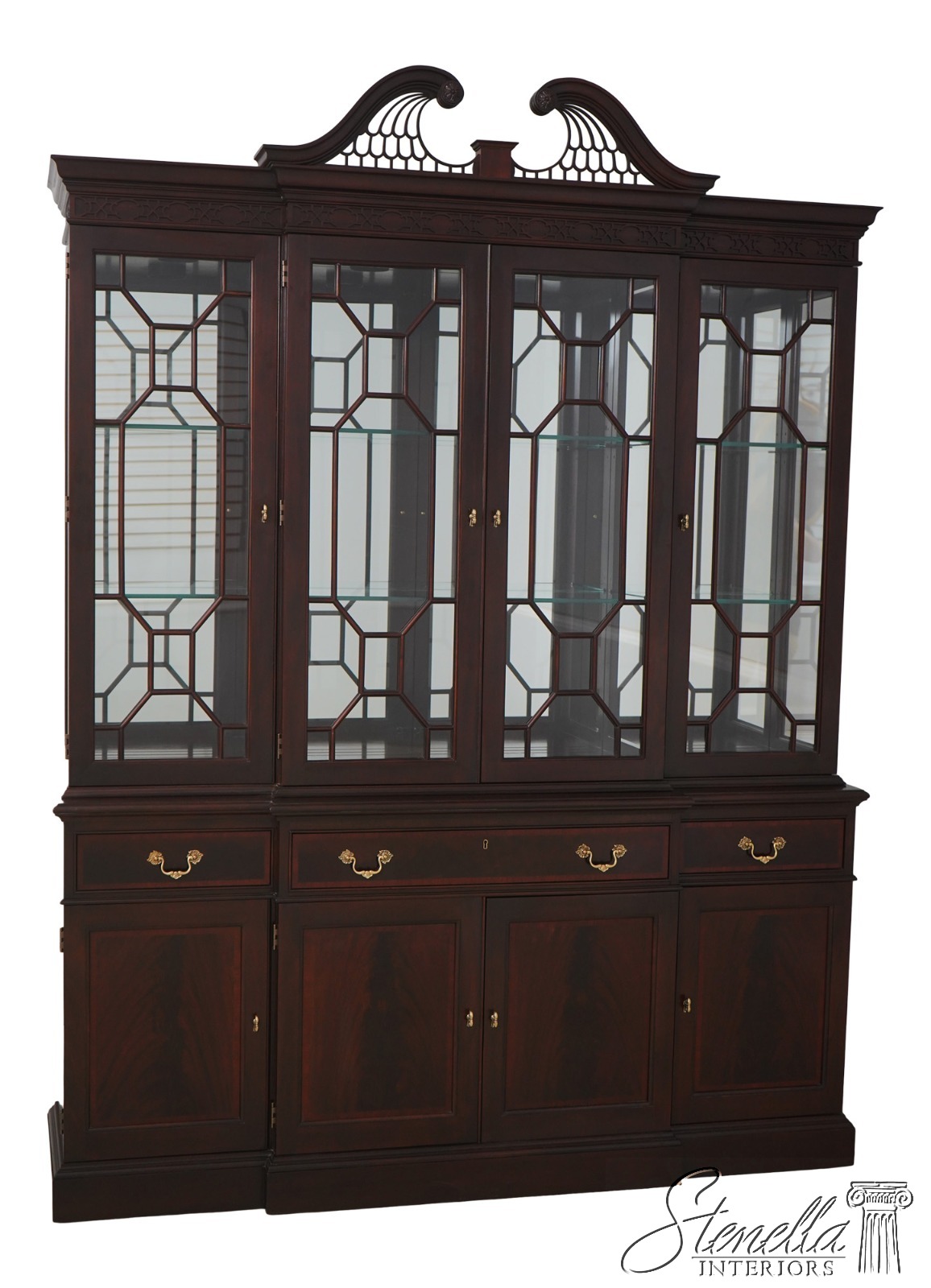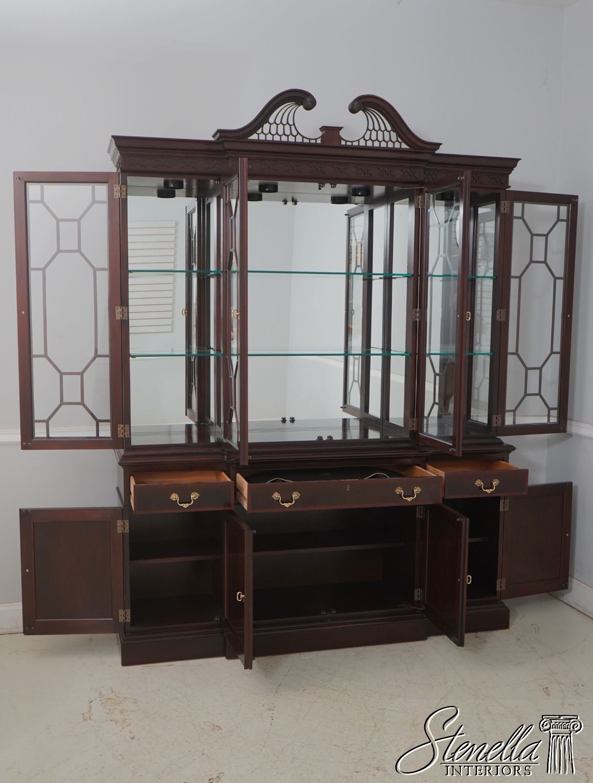Details: Finish No.1 Mahogany Adjustable Shelves Dovetailed Drawer Construction Fine Carved Details High Quality Construction Large Impressive Cabinet Lighted Interior Mirrored Back Nice Inlay Work Throughout Pediment Top Raised Panel Doors Individual Pane Glass Doors Rich High Sheen Finish 18 C. Design Traditional Style Solid Brass Hardware Figural Mahogany Cabinet Doors 2 Piece Construction Felt Lined Drawer Key Locking w. Key Offered @ Fraction Original Retail Cost