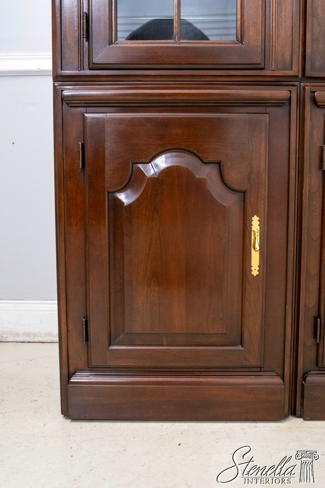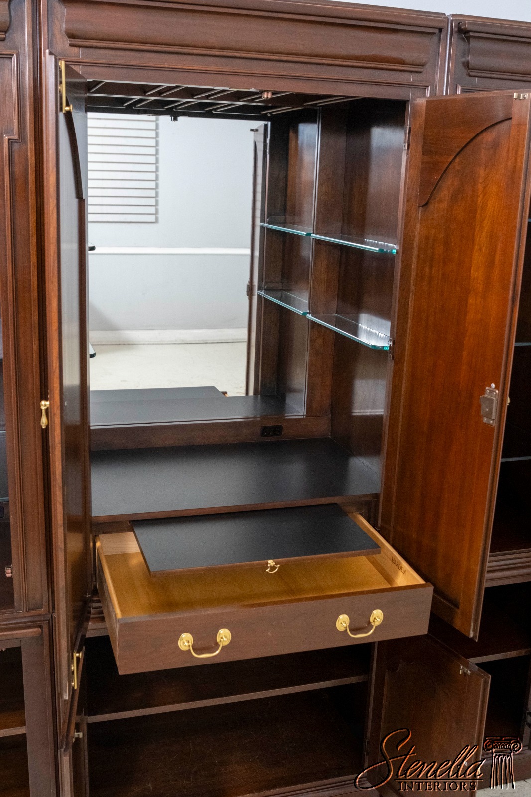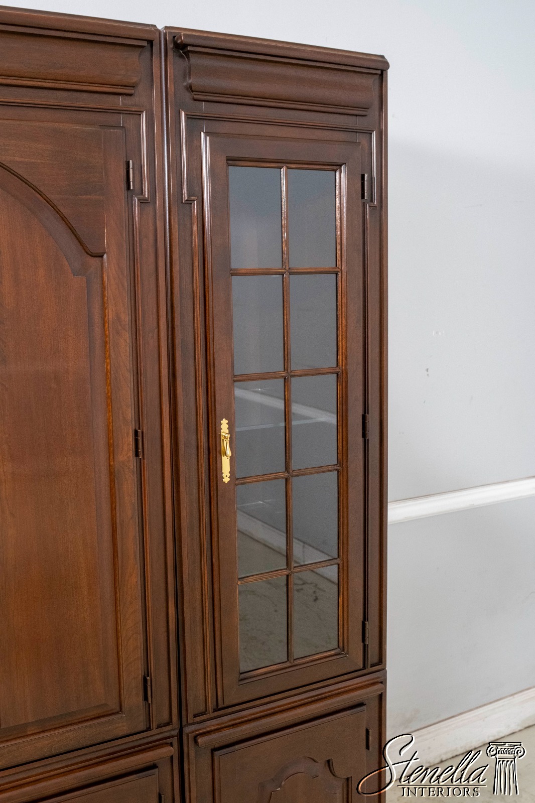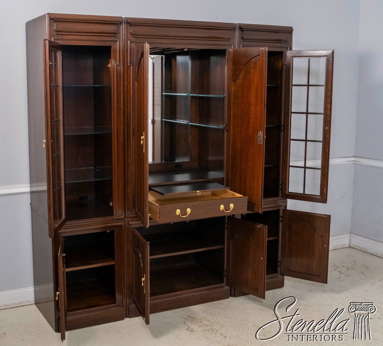 Details: Cherry Dovetailed Drawer Construction Adjustable Shelves High Quality Construction Large Impressive Cabinet Lighted Interior Mirrored Back Interior Center Raised Panel Doors Individual Pane Glass Doors Solid Brass Hardware Wired Outlet Inside Key Locking w. Key Pull Out Surface