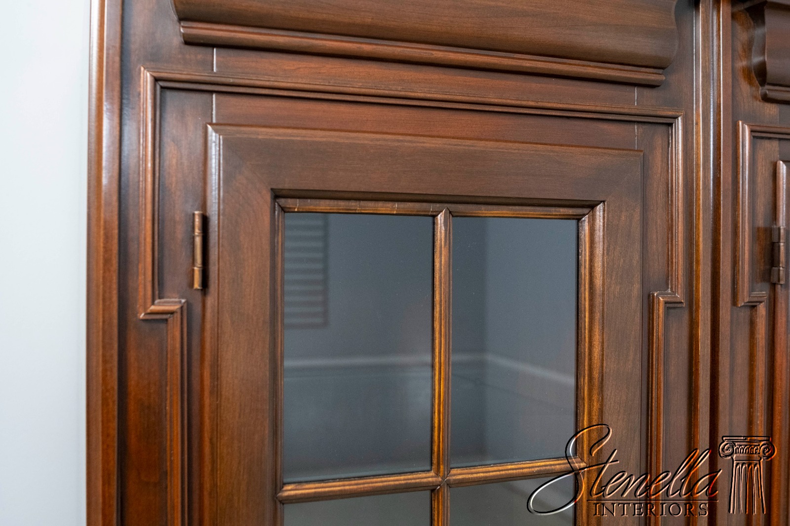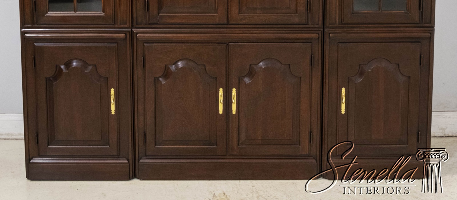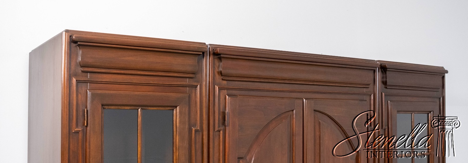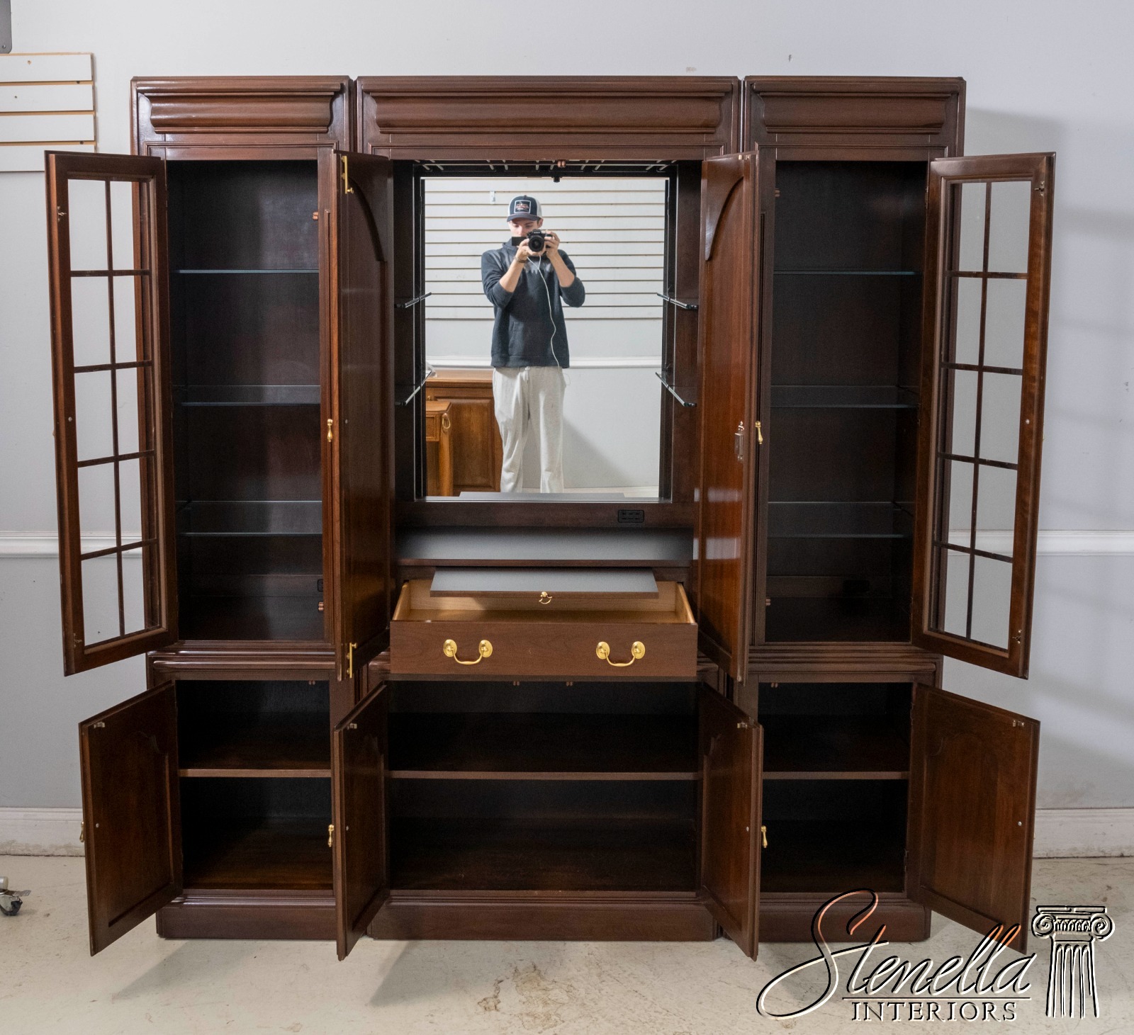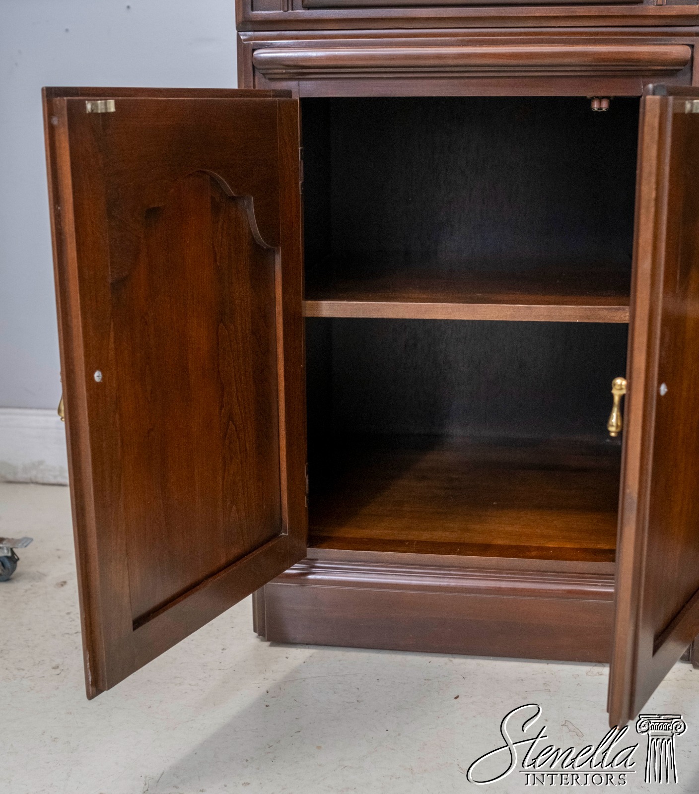Details: Cherry Dovetailed Drawer Construction Adjustable Shelves High Quality Construction Large Impressive Cabinet Lighted Interior Mirrored Back Interior Center Raised Panel Doors Individual Pane Glass Doors Solid Brass Hardware Wired Outlet Inside Key Locking w. Key Pull Out Surface