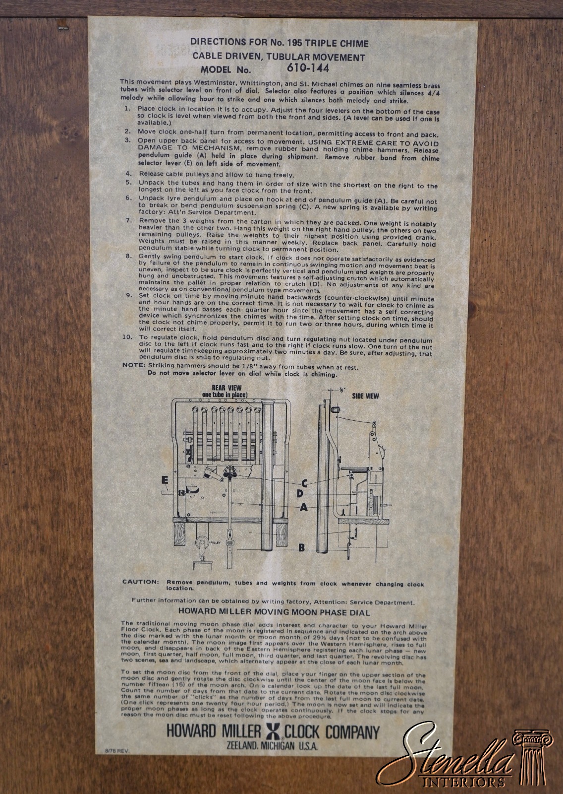Stenella Antiques always recommends having a clock setup, tuned and adjusted by a professional after being moved. Most clock movement manufacturers recommend having a clock tuned or adjusted every two years or so, and now would be a good time to have that done. We are not clock experts, but feel free to email us any questions and we will gladly try to answer them for you. This clock is setup at our location to ensure it is in working order. We make sure all parts are here and in basic functioning order. We do not inspect or guarantee timing, wear to bushings or moving parts etc. Normal age appropriate wear should be expected. Be sure to view our additional offerings for additional quality furniture items for your home. Feel free to message any questions.