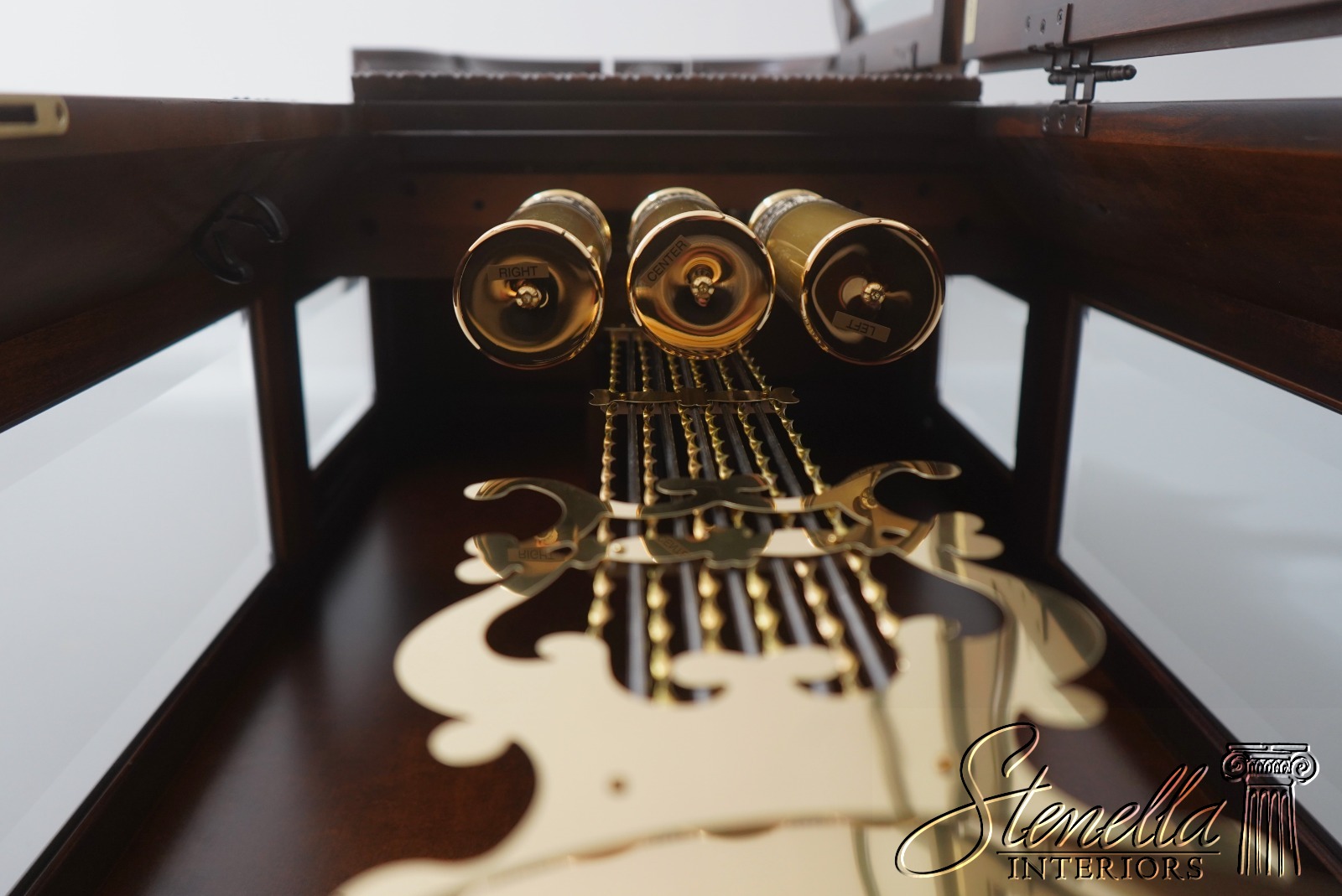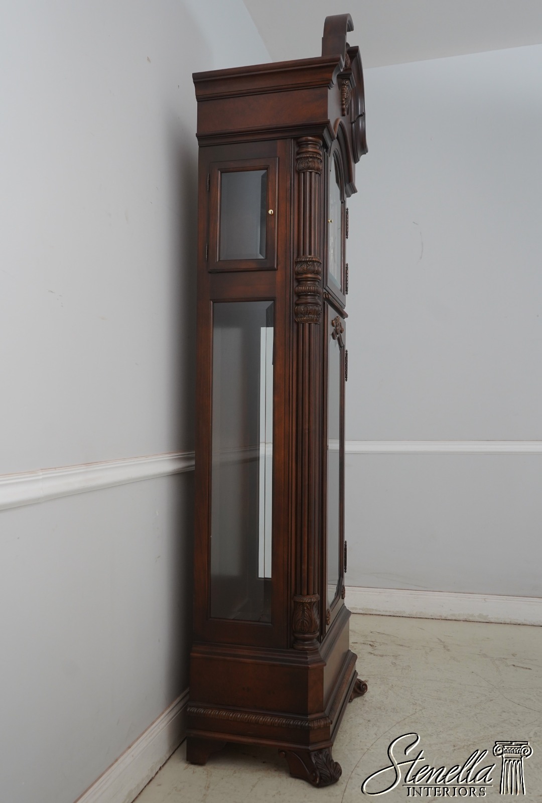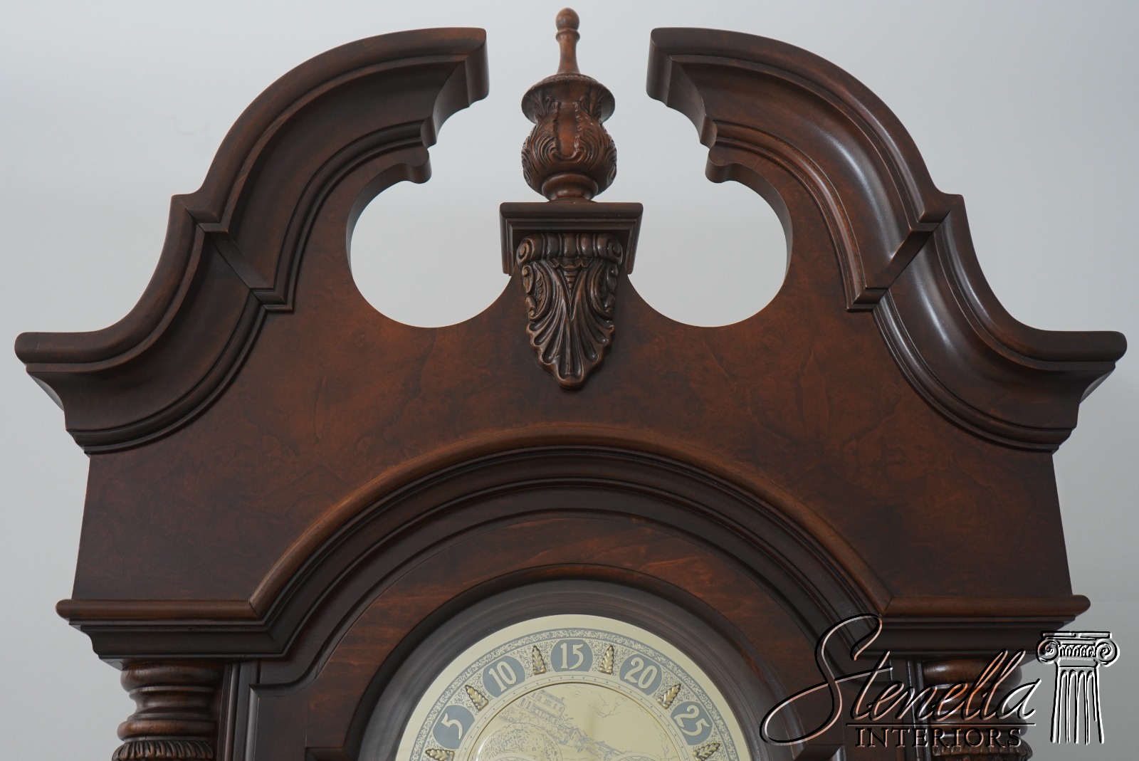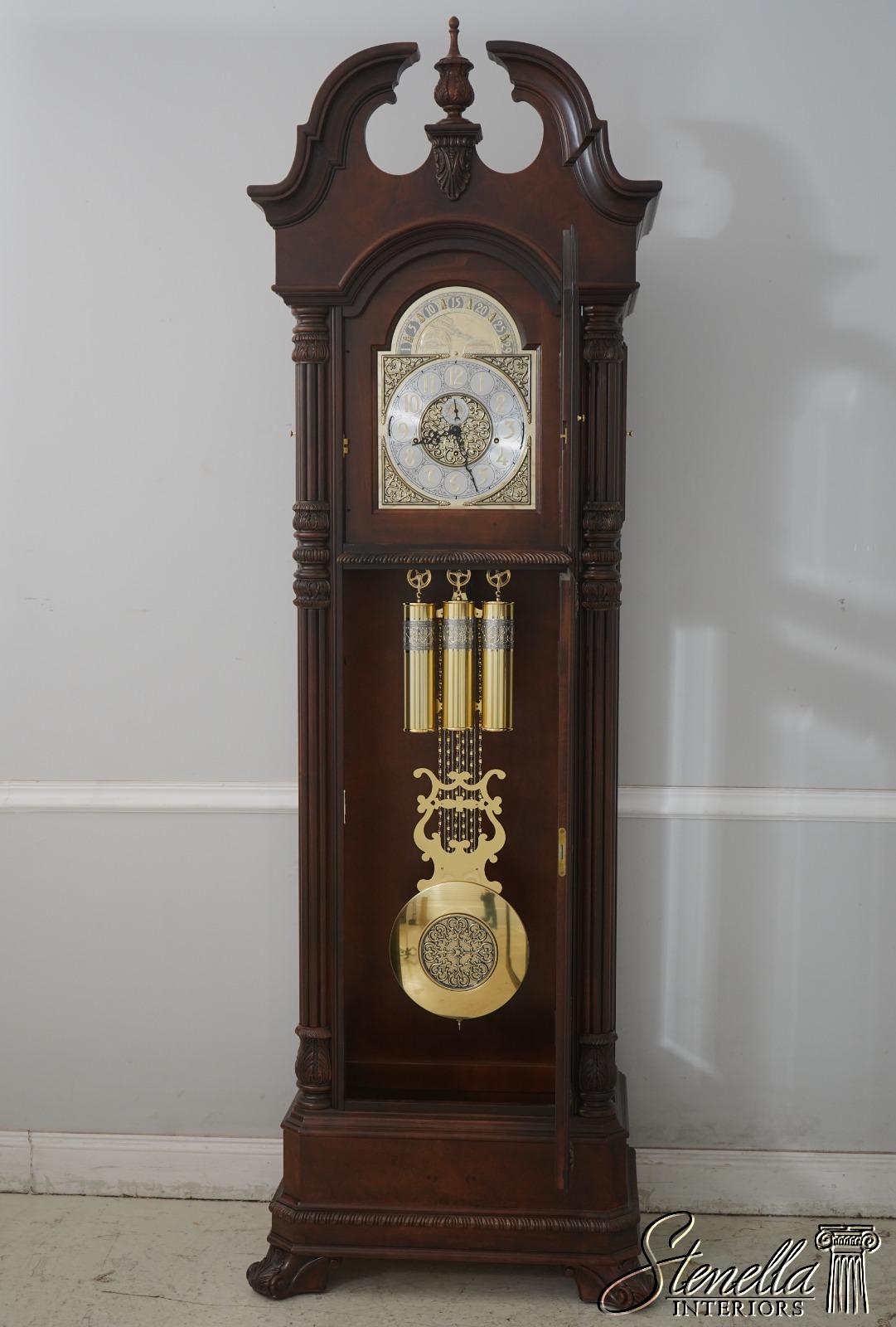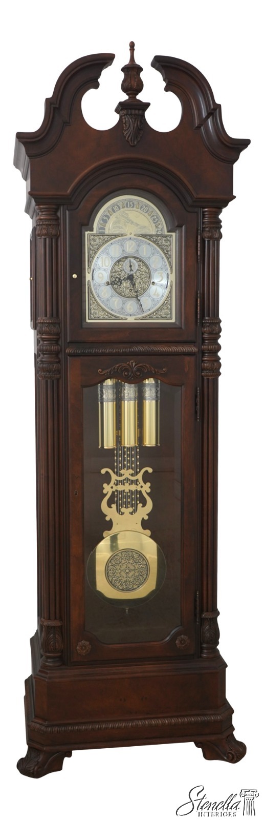 Details: Beveled Glass Multi Chime Setting Quality Construction Large Impressive Clock Pediment Top w. Finial Brand New Old Dealer Stock We Unboxed Weights & Pendulum On Order To Picture Brown Cherry Finish w. Burl Walnut Top Offered @ Fraction Original Retail Cost