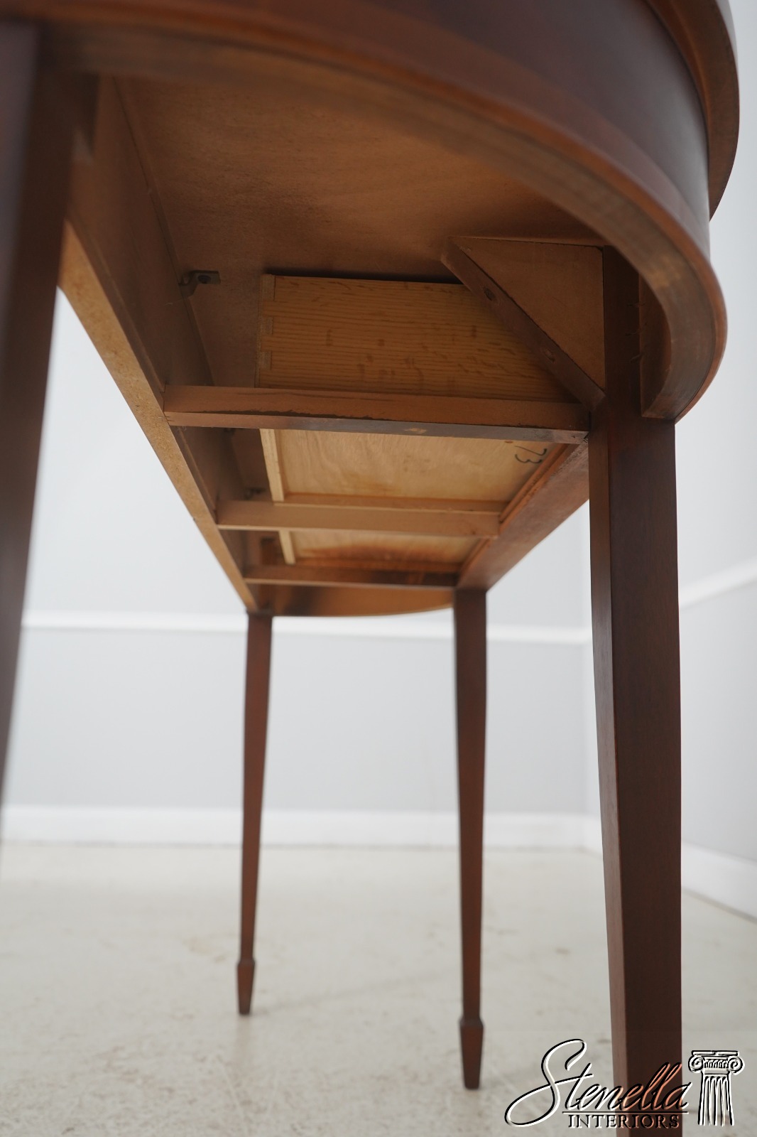 Details: Copley Place Gorgeous Figural Mahogany Wood Gallery Top Dovetailed Drawer Construction High Quality Construction Nice Inlay Work Solid Brass Hardware Spade Feet Offered @ Fraction Original Retail Cost