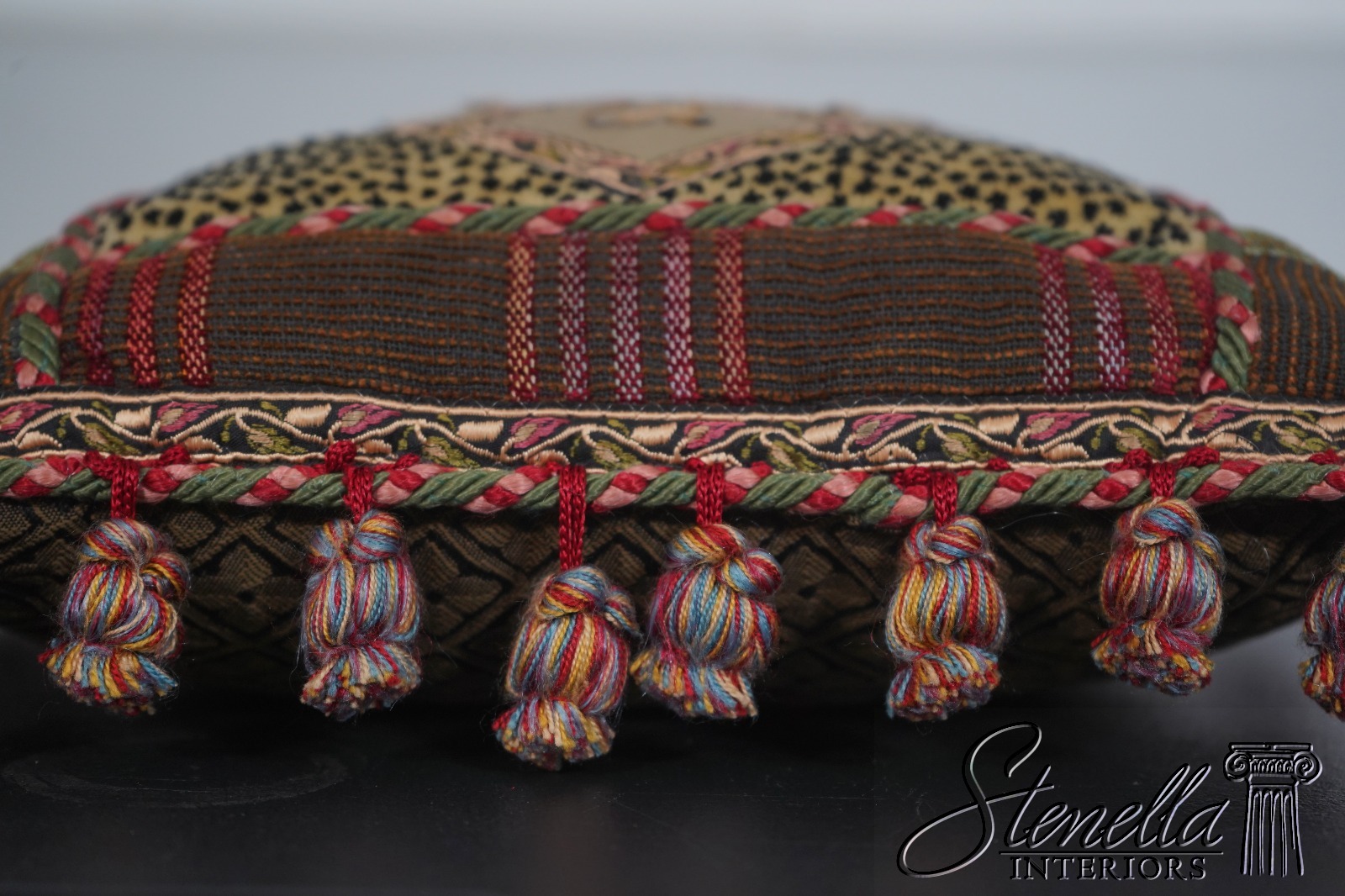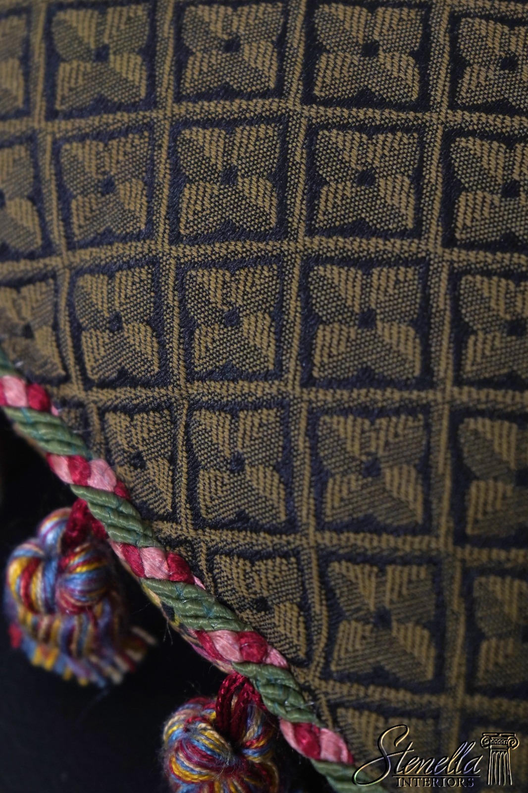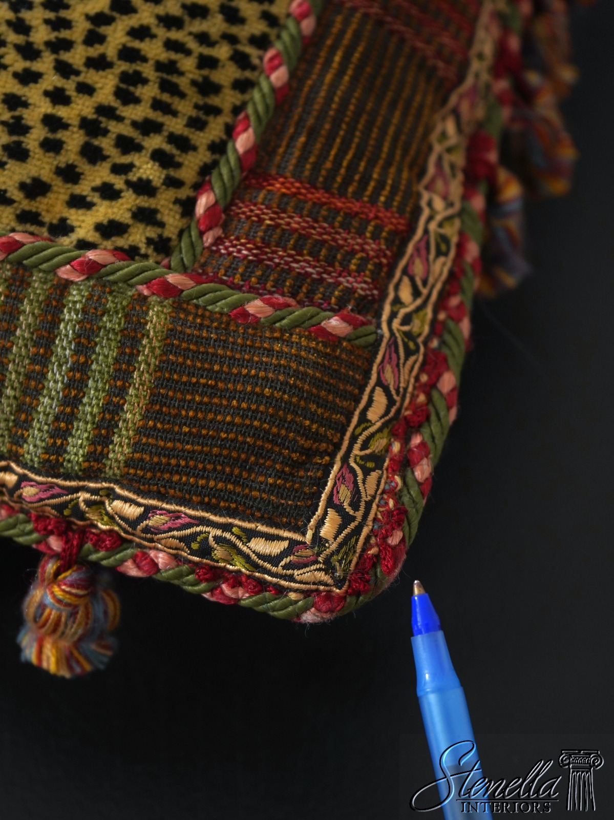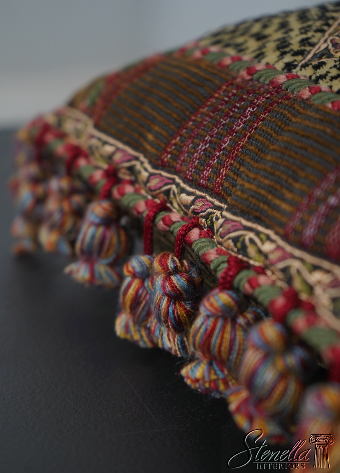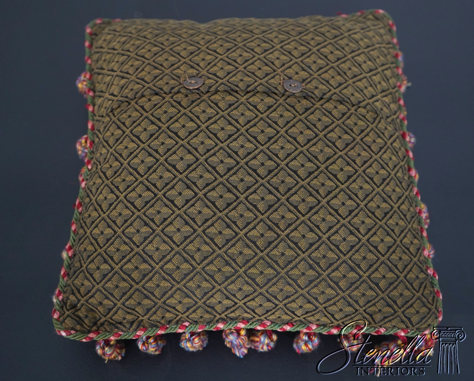Details: High Quality Construction Floor Model From Designer Home Striped Fabric w. Fringe Button Closure On Back Offered @ Fraction Original Retail Cost