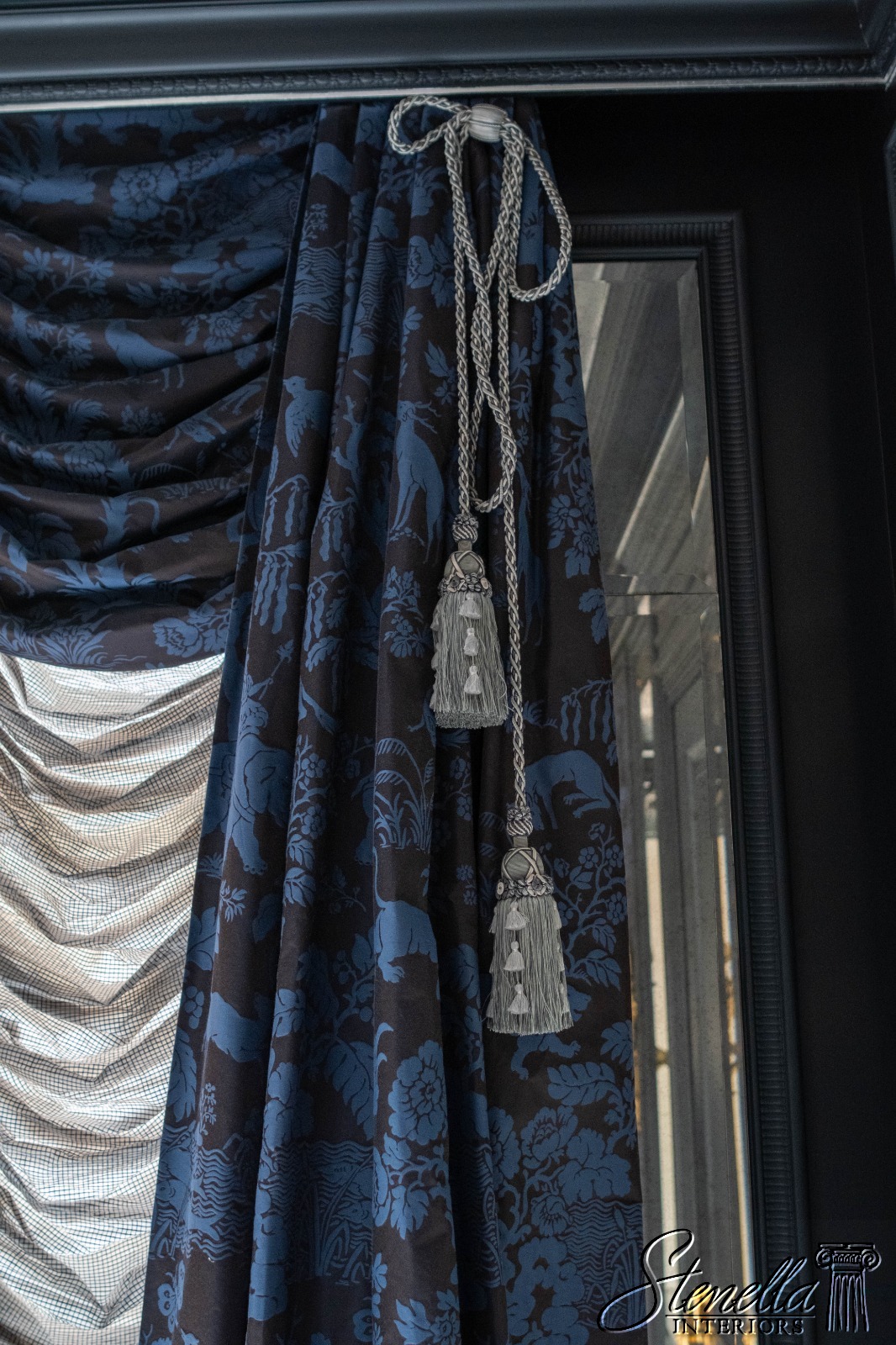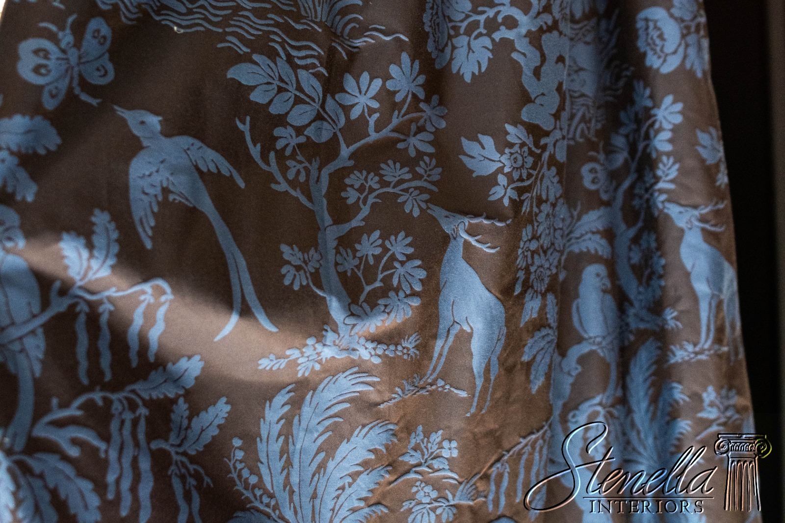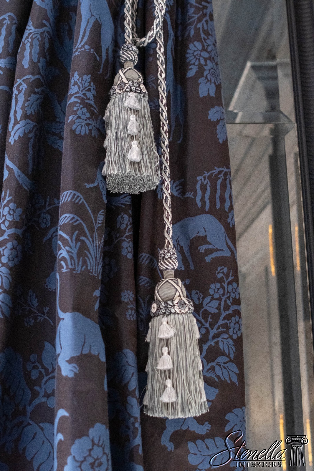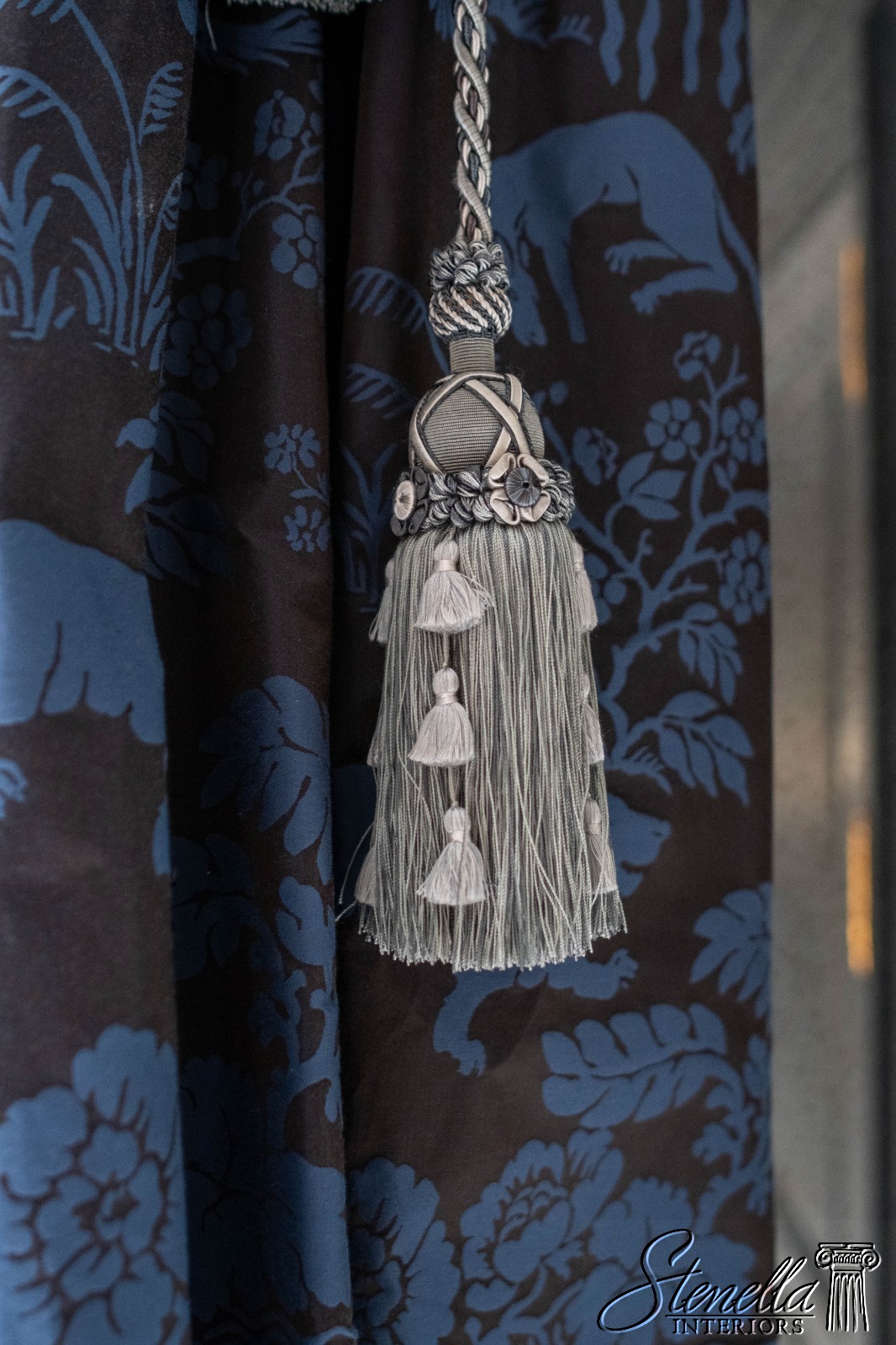 Details: Custom drapes done in high quality Scalamandré fabric (unmarked or labeled as to maker) Includes tassels as shown Professionally done by decorator approx. 20 years ago Will come folded in box so buyer can alter to their specs Offered at a fraction of original cost of nearly $18,000 to have done