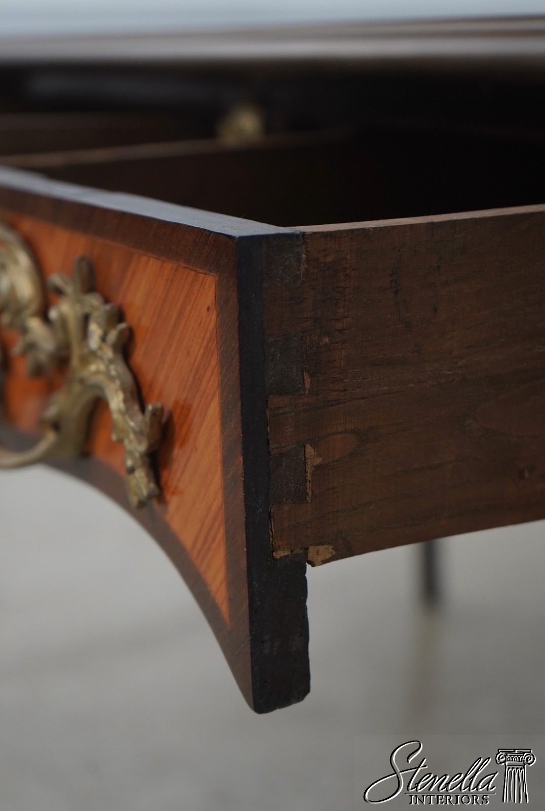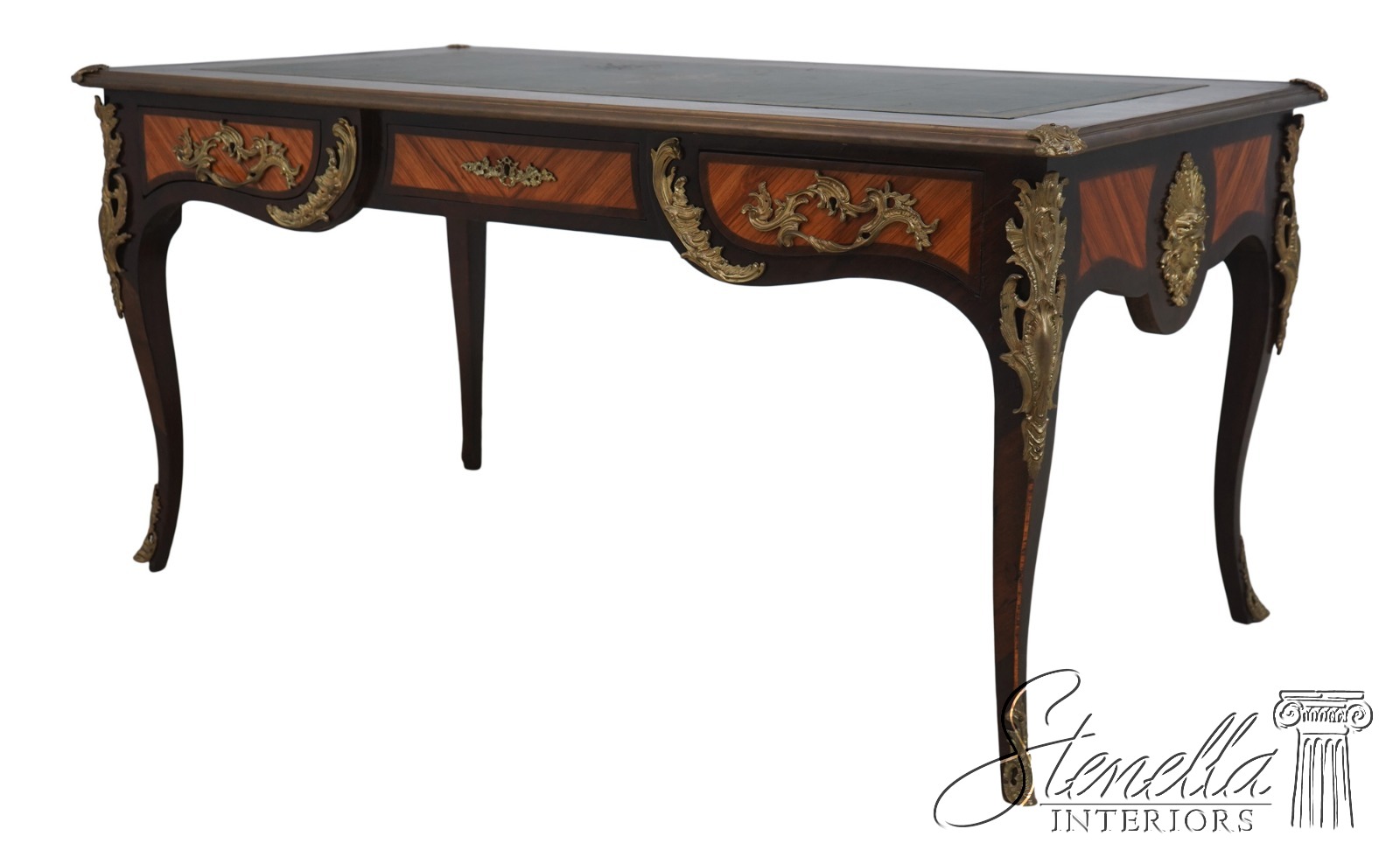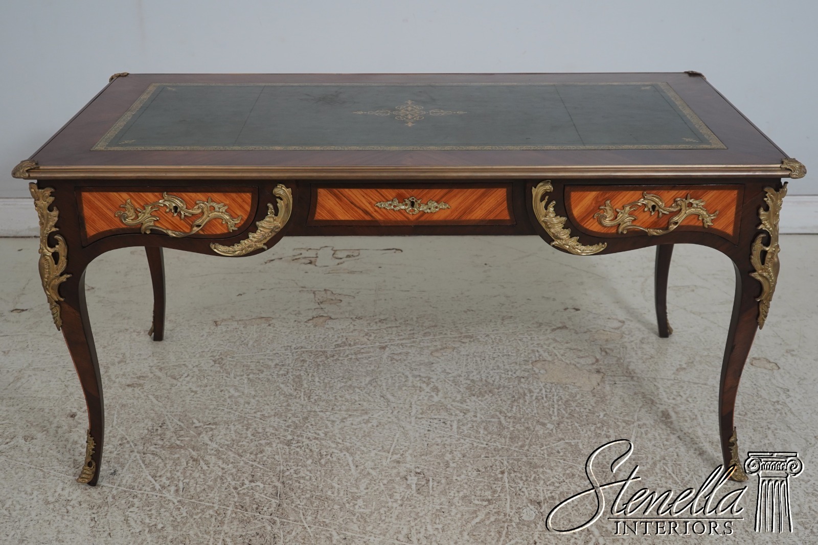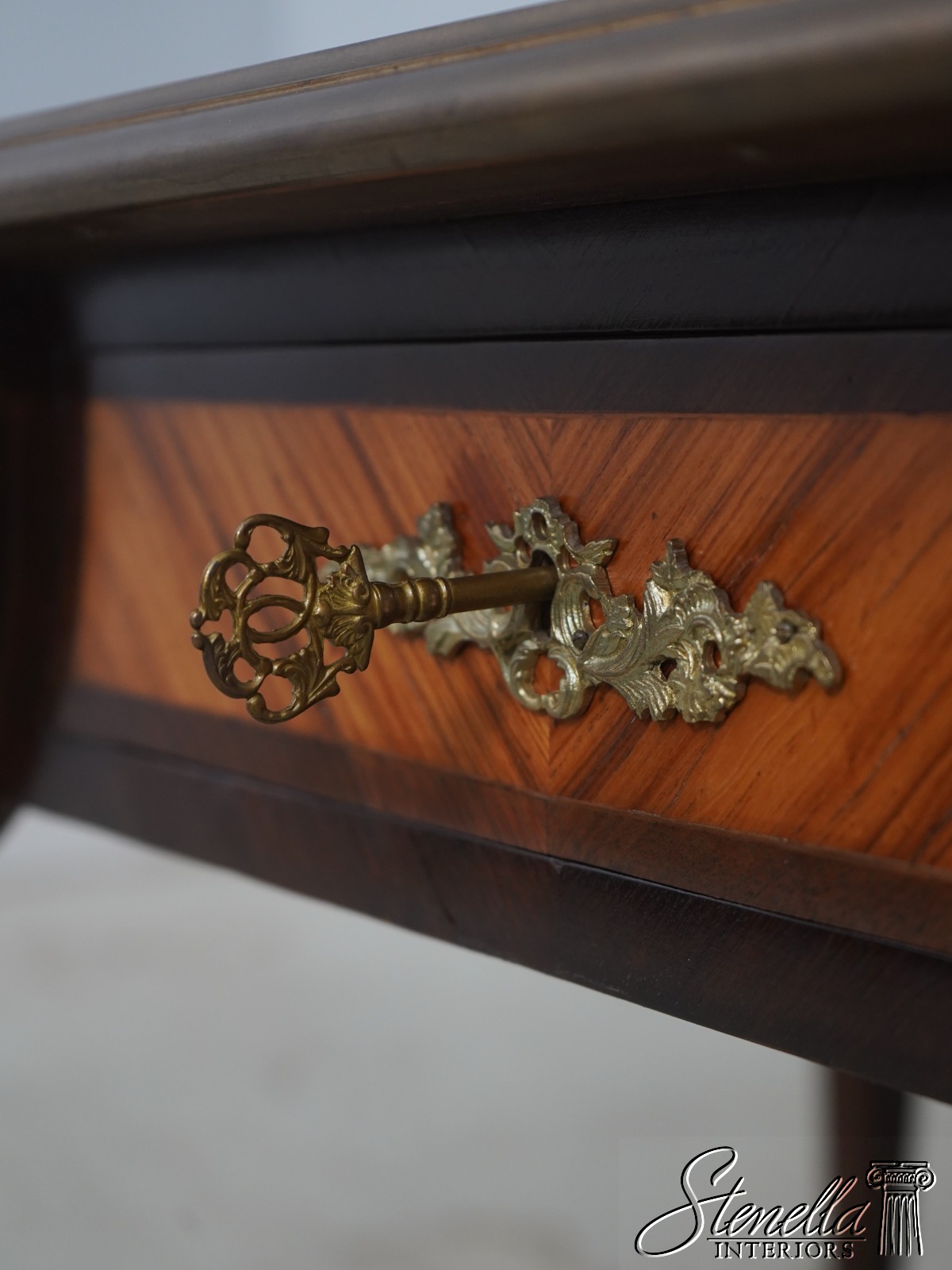 Details: Appears To Be French Made Brass Capped Feet Dovetailed Drawer Construction High Quality Construction Fine Carved Details Nice Inlay Work Throughout Nice Tooled Leather Top Queen Anne Legs & Pad Feet French Style Outstanding Bronze Ormolu Mounts Gold Embossed Leather Top Key Locking w. Key Marquetry Inlays Bronze Ormolu Mounts Offered @ Fraction Original Retail Cost
