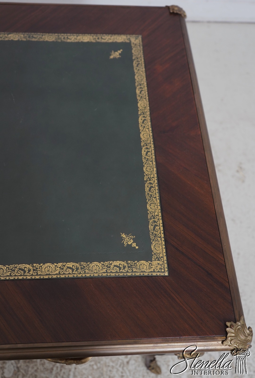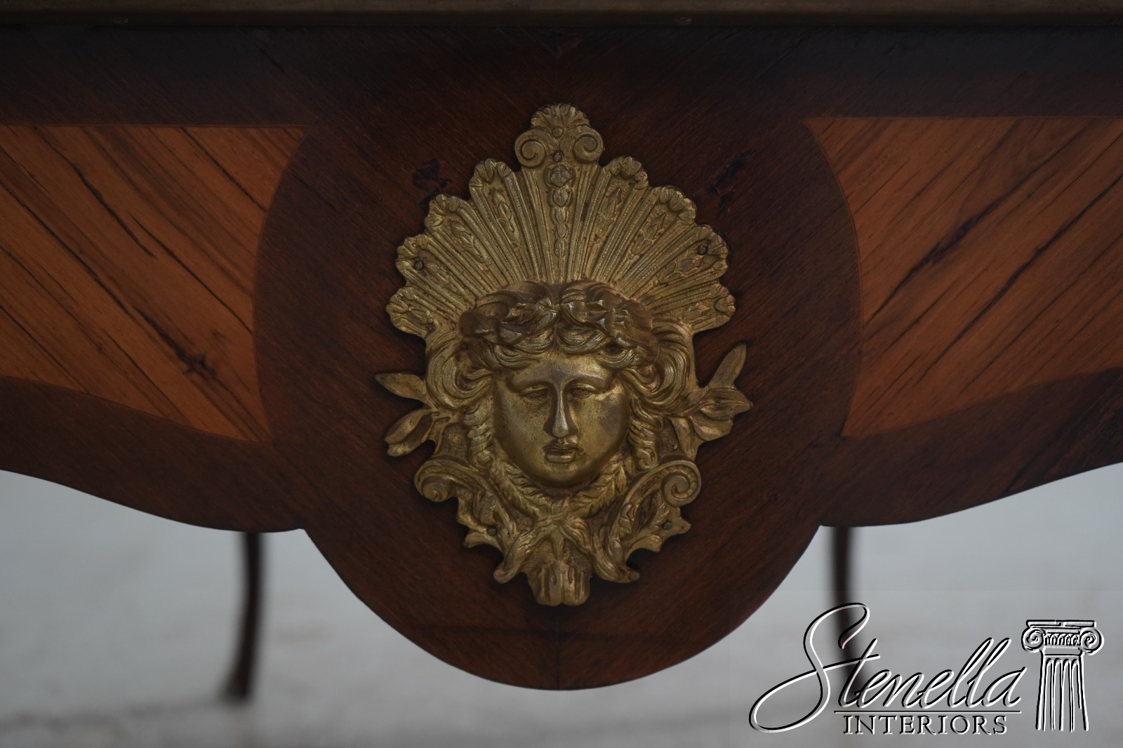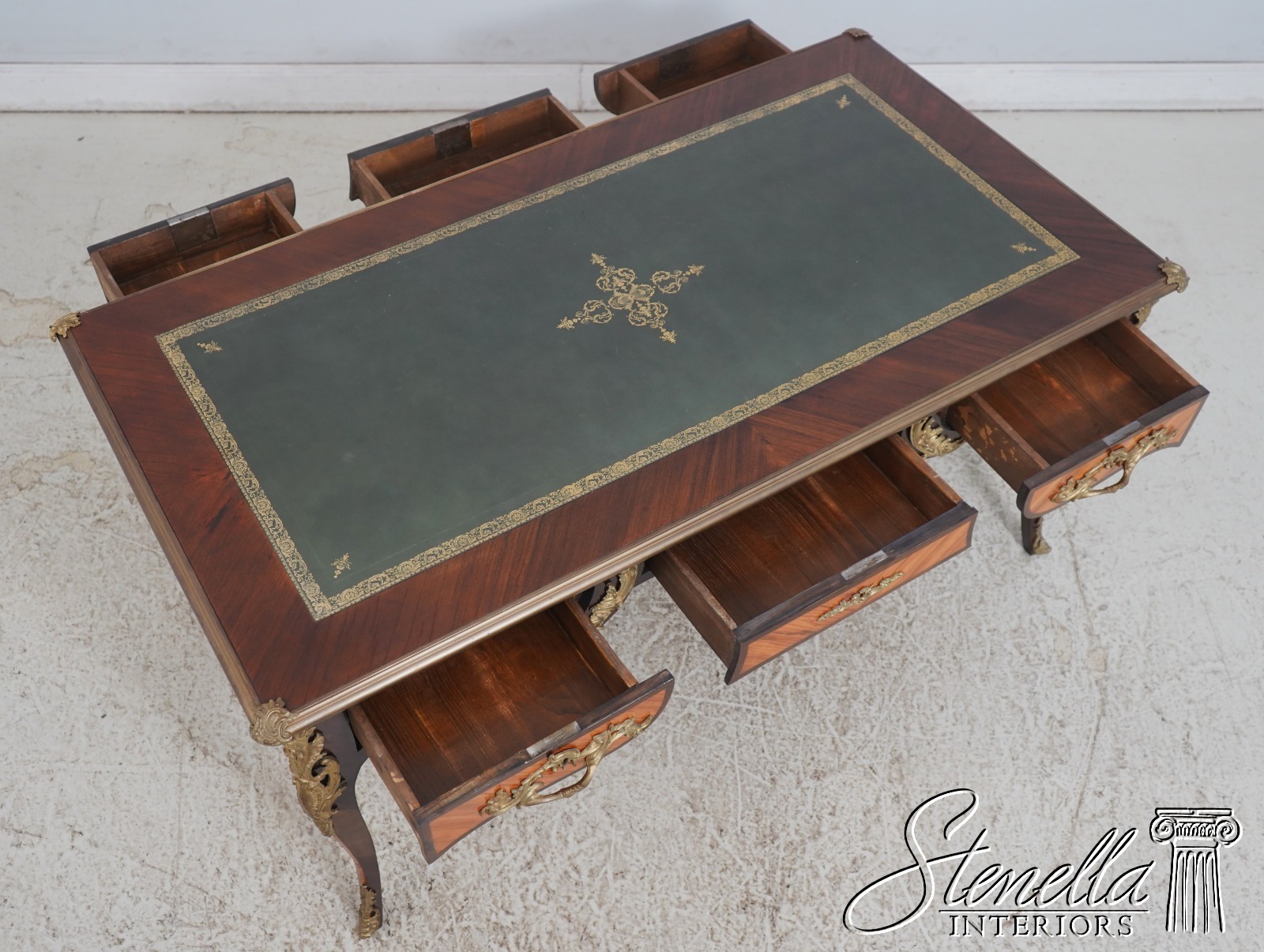 Details: Appears To Be French Made Brass Capped Feet Dovetailed Drawer Construction High Quality Construction Fine Carved Details Nice Inlay Work Throughout Nice Tooled Leather Top Queen Anne Legs & Pad Feet French Style Outstanding Bronze Ormolu Mounts Gold Embossed Leather Top Key Locking w. Key Marquetry Inlays Bronze Ormolu Mounts Offered @ Fraction Original Retail Cost