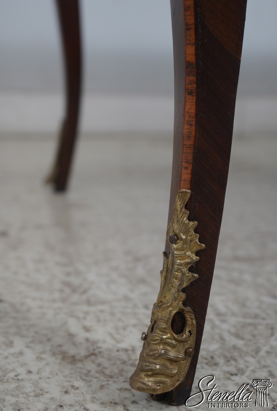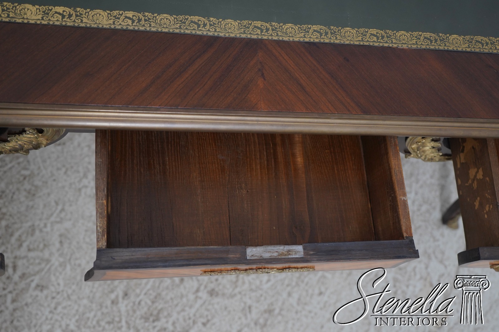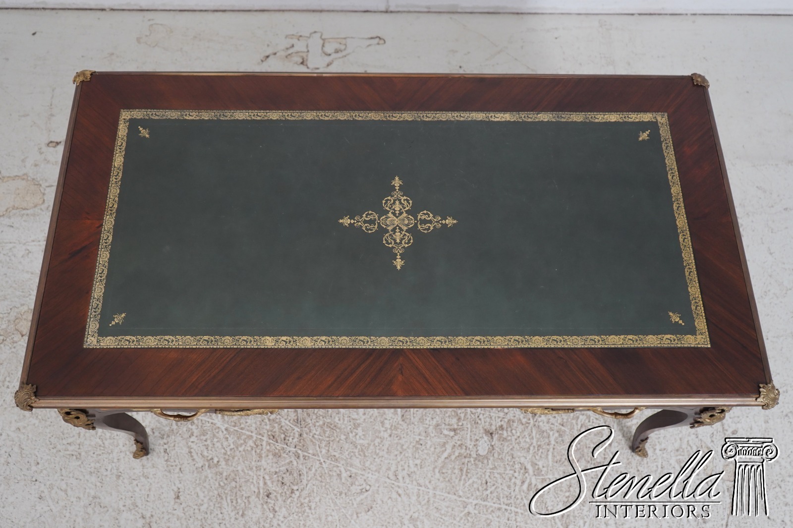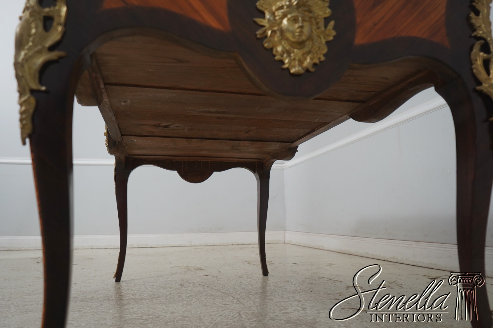 Details: Appears To Be French Made Brass Capped Feet Dovetailed Drawer Construction High Quality Construction Fine Carved Details Nice Inlay Work Throughout Nice Tooled Leather Top Queen Anne Legs & Pad Feet French Style Outstanding Bronze Ormolu Mounts Gold Embossed Leather Top Key Locking w. Key Marquetry Inlays Bronze Ormolu Mounts Offered @ Fraction Original Retail Cost