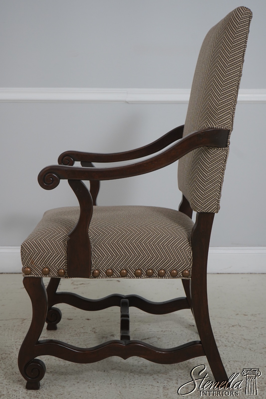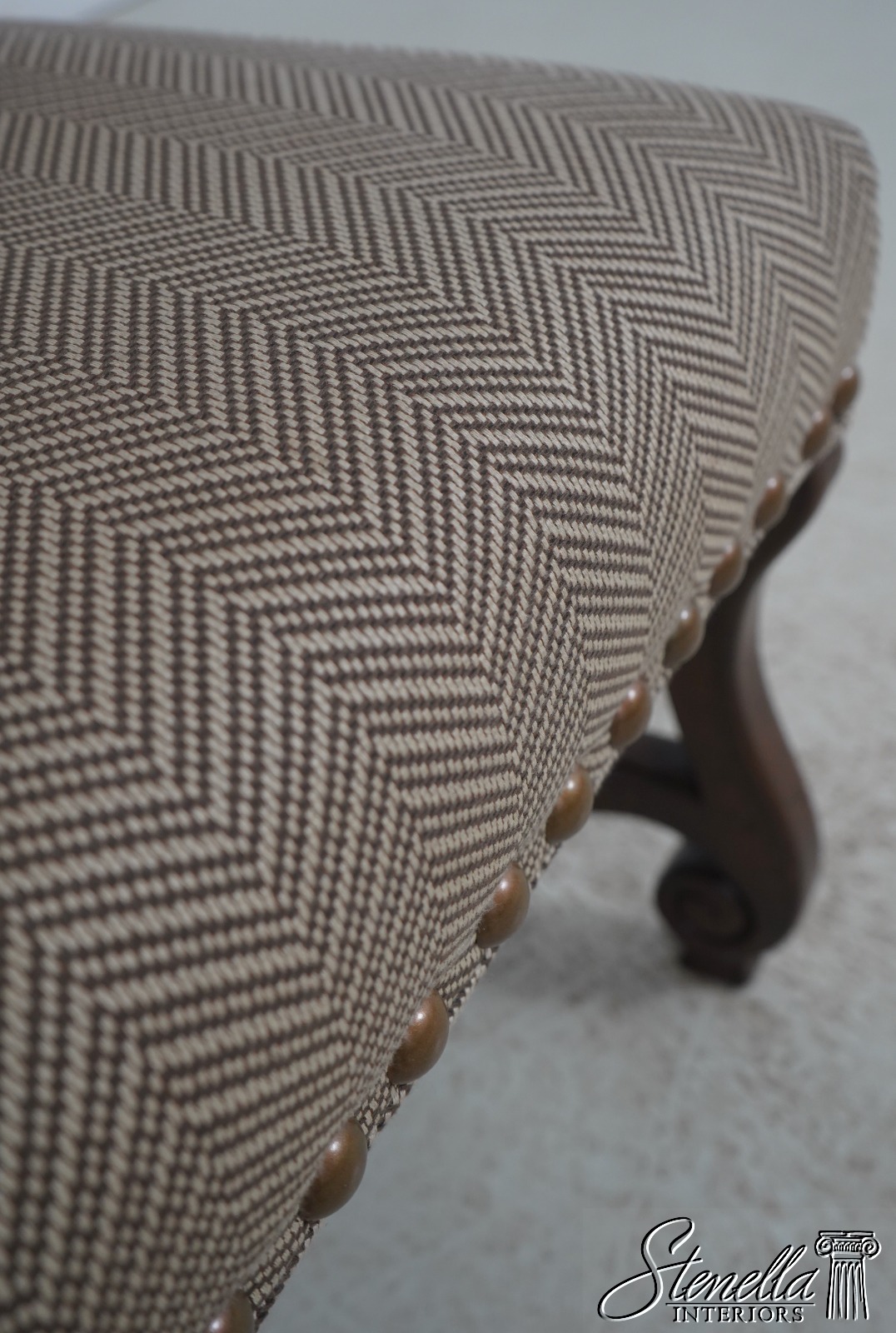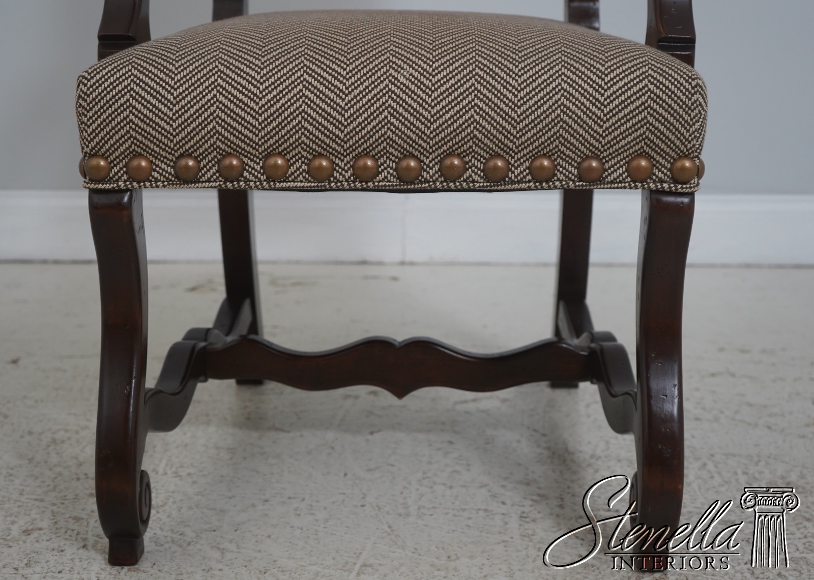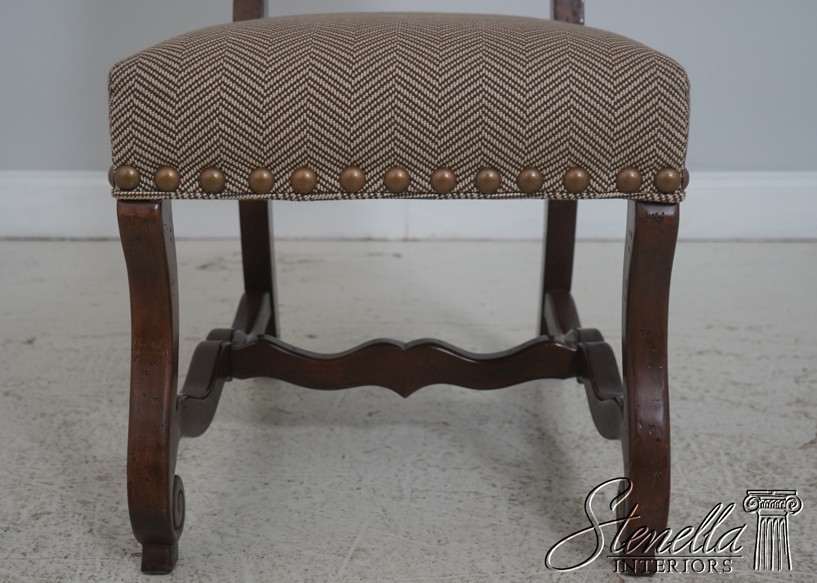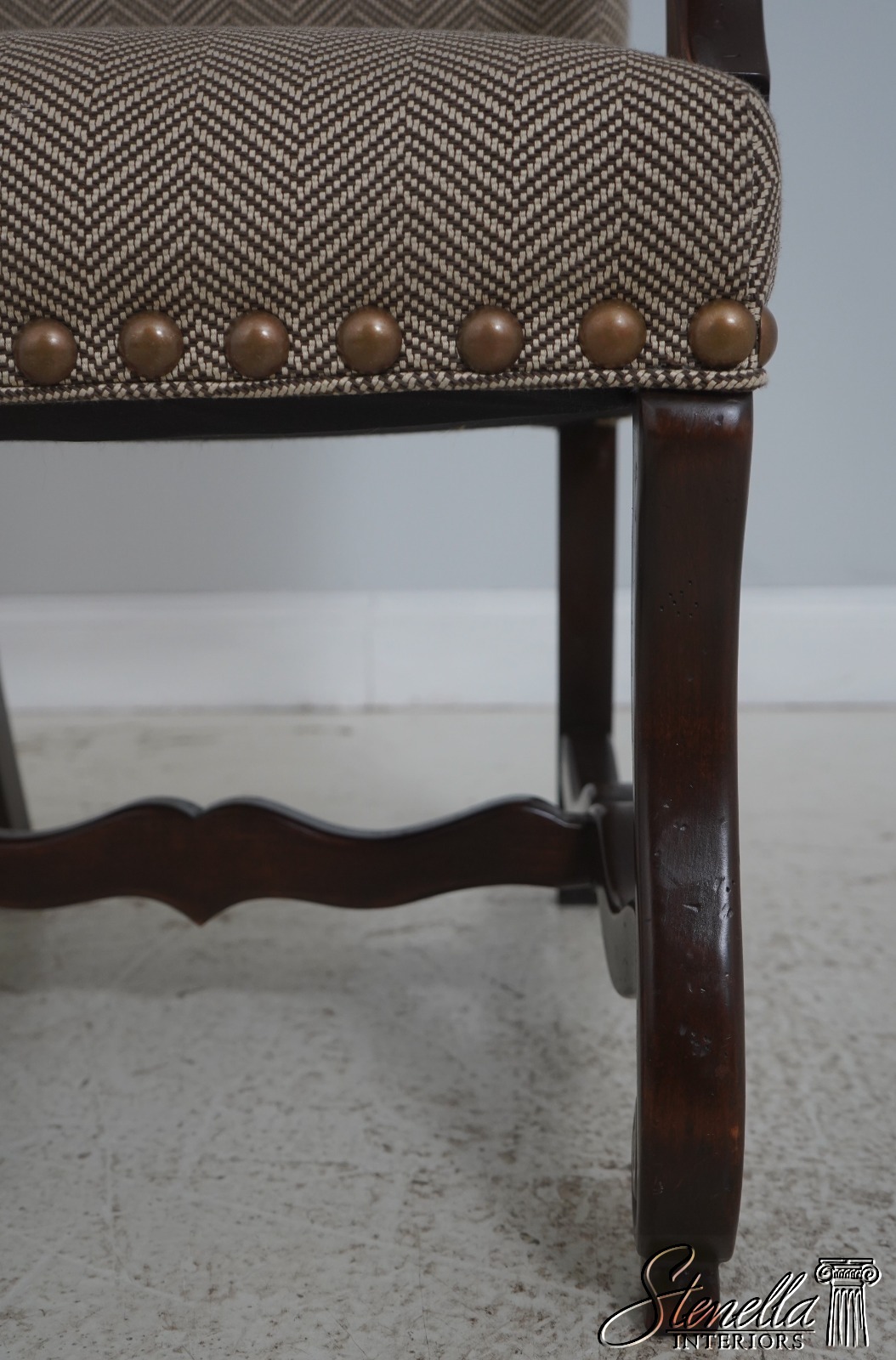 Details: High Quality Construction Hand Carved Legs French Style Walnut finish Stretcher Base Frame Tack Head Trim Large Nail Head Trim Scroll Arms Factory Distressed Frames See other offering for matching farmhouse table Un-Marked As To Manufacture Overall clean well cared for upholstery Offered @ Fraction Original Retail Cost