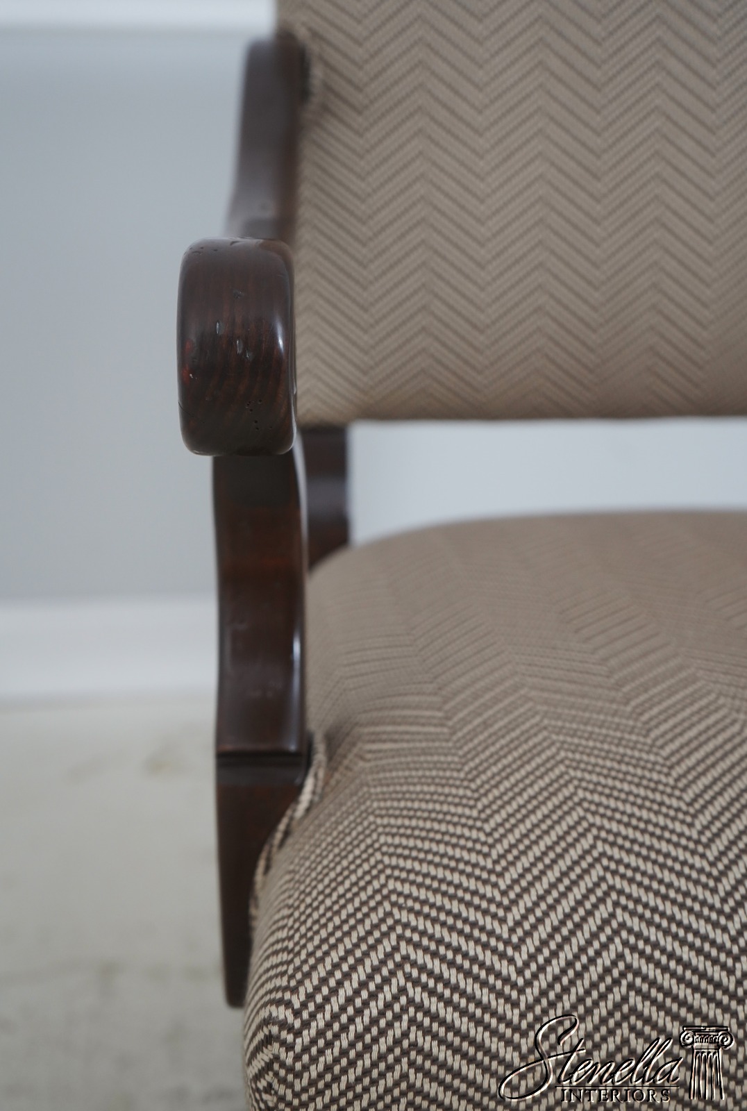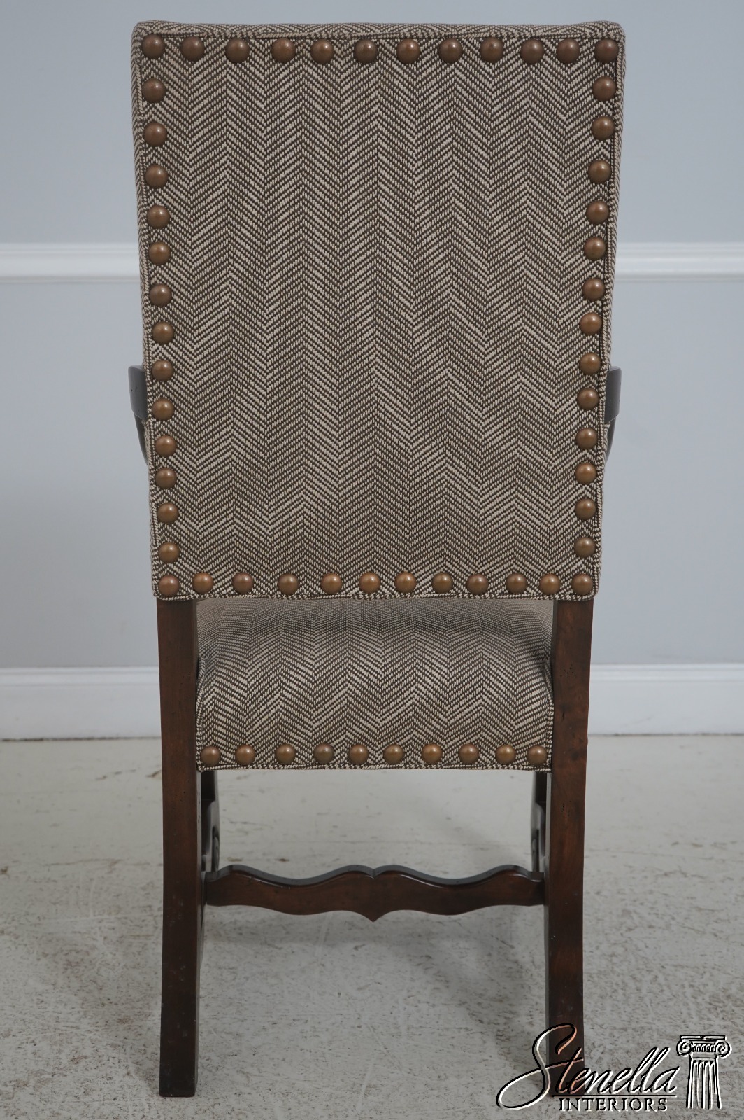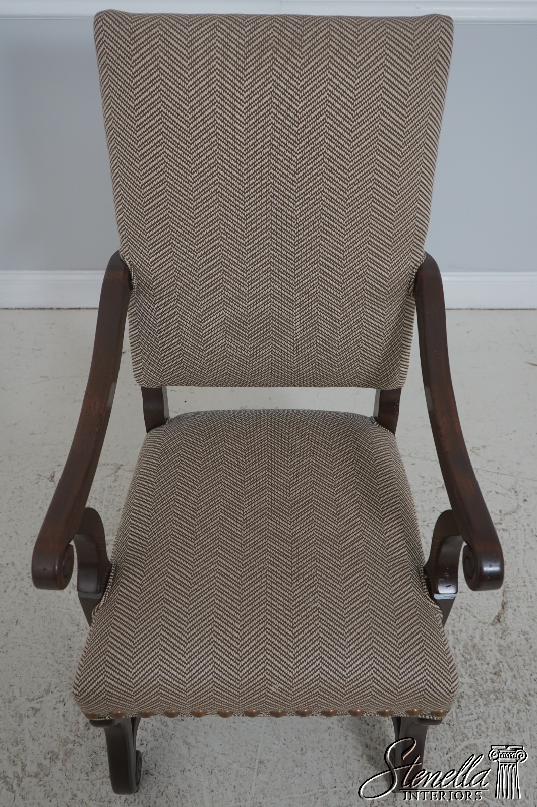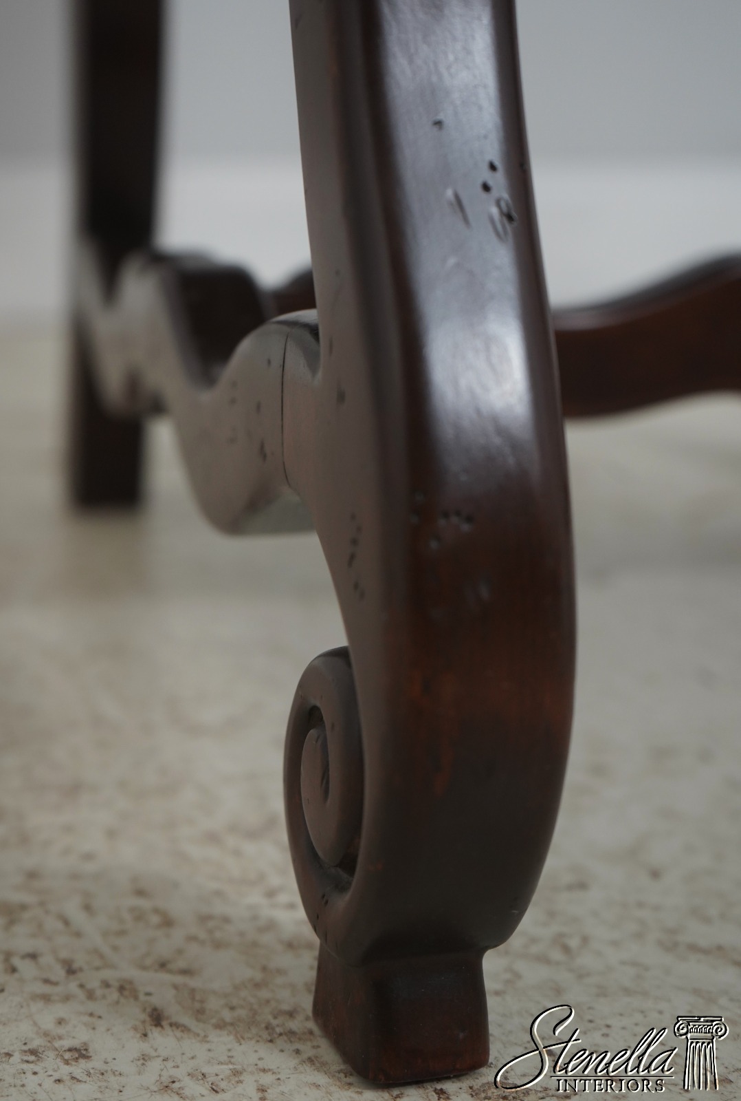 Details: High Quality Construction Hand Carved Legs French Style Walnut finish Stretcher Base Frame Tack Head Trim Large Nail Head Trim Scroll Arms Factory Distressed Frames See other offering for matching farmhouse table Un-Marked As To Manufacture Overall clean well cared for upholstery Offered @ Fraction Original Retail Cost