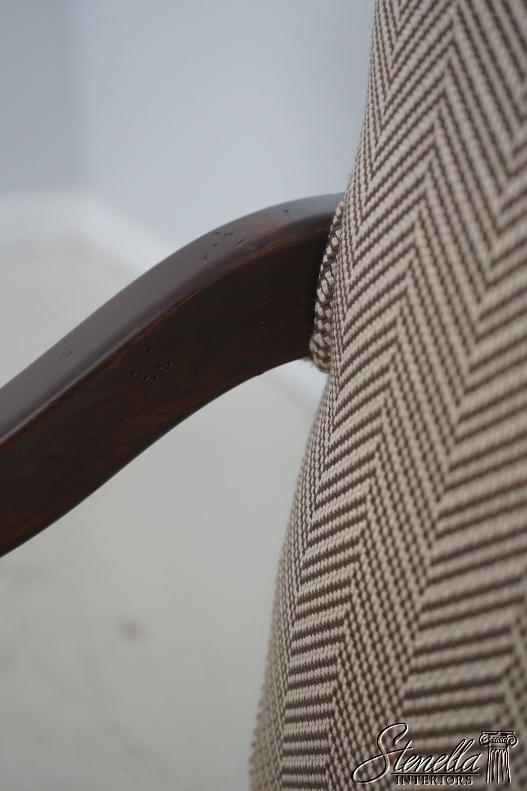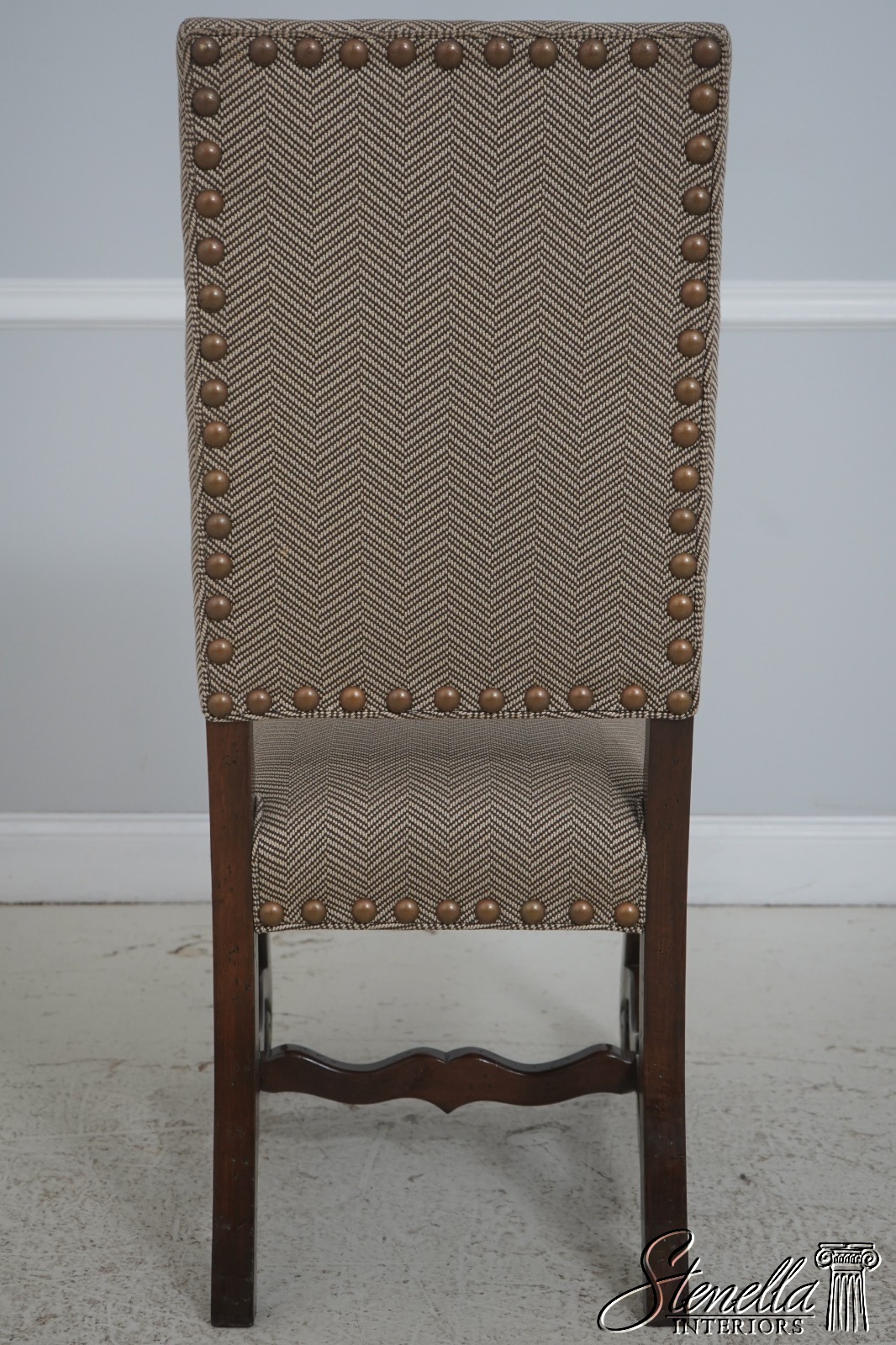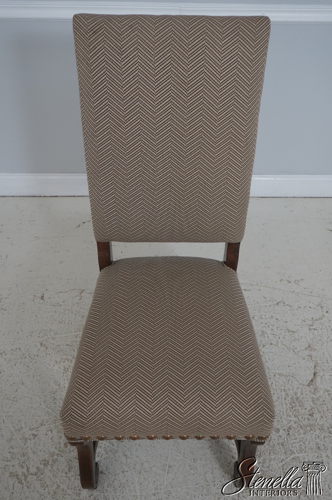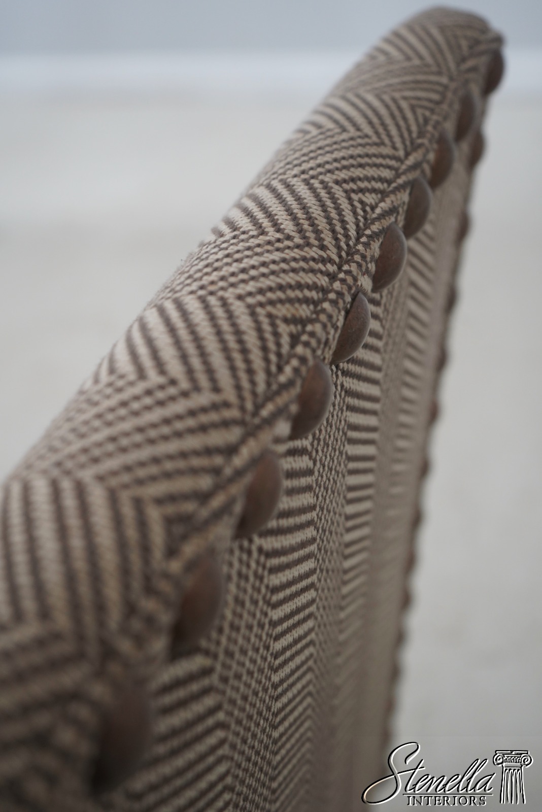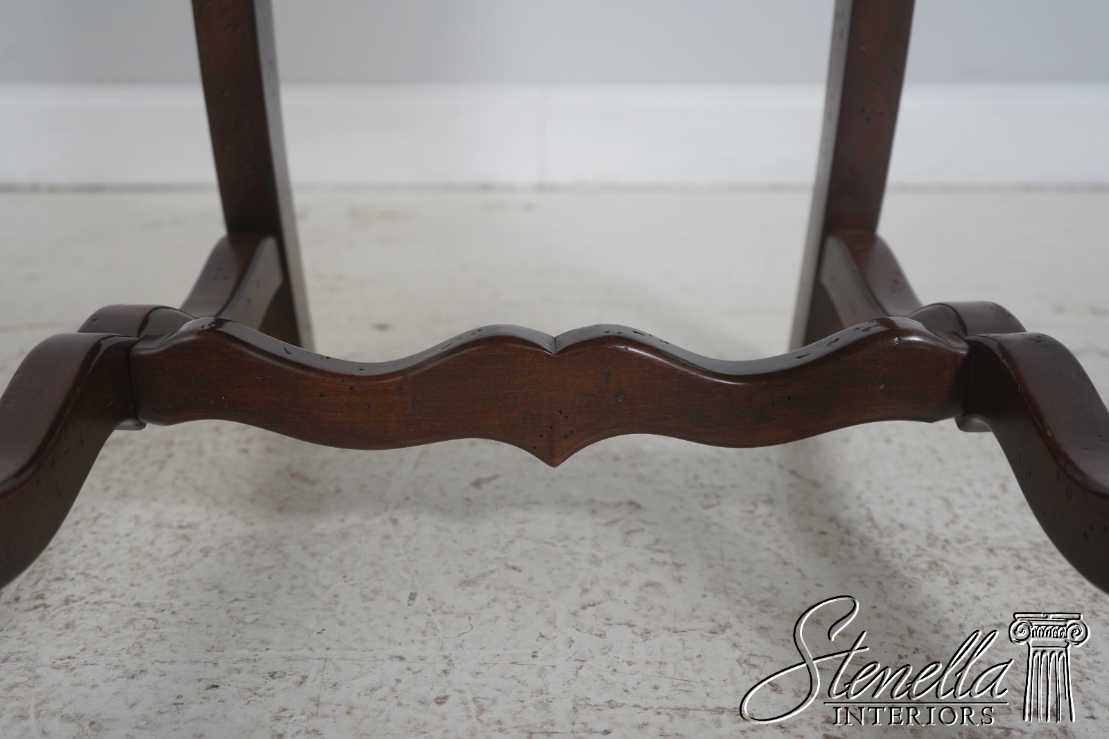 Details: High Quality Construction Hand Carved Legs French Style Walnut finish Stretcher Base Frame Tack Head Trim Large Nail Head Trim Scroll Arms Factory Distressed Frames See other offering for matching farmhouse table Un-Marked As To Manufacture Overall clean well cared for upholstery Offered @ Fraction Original Retail Cost