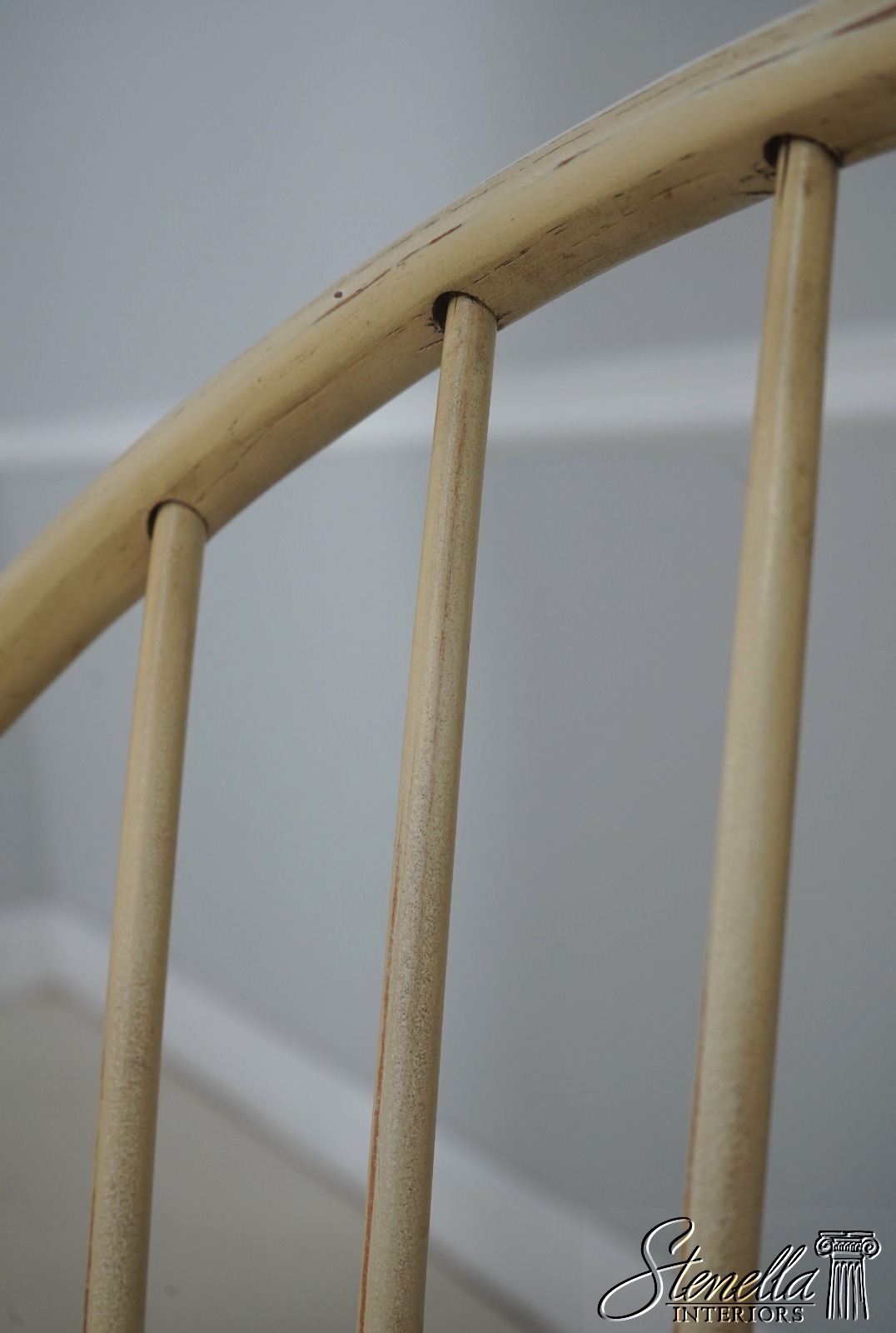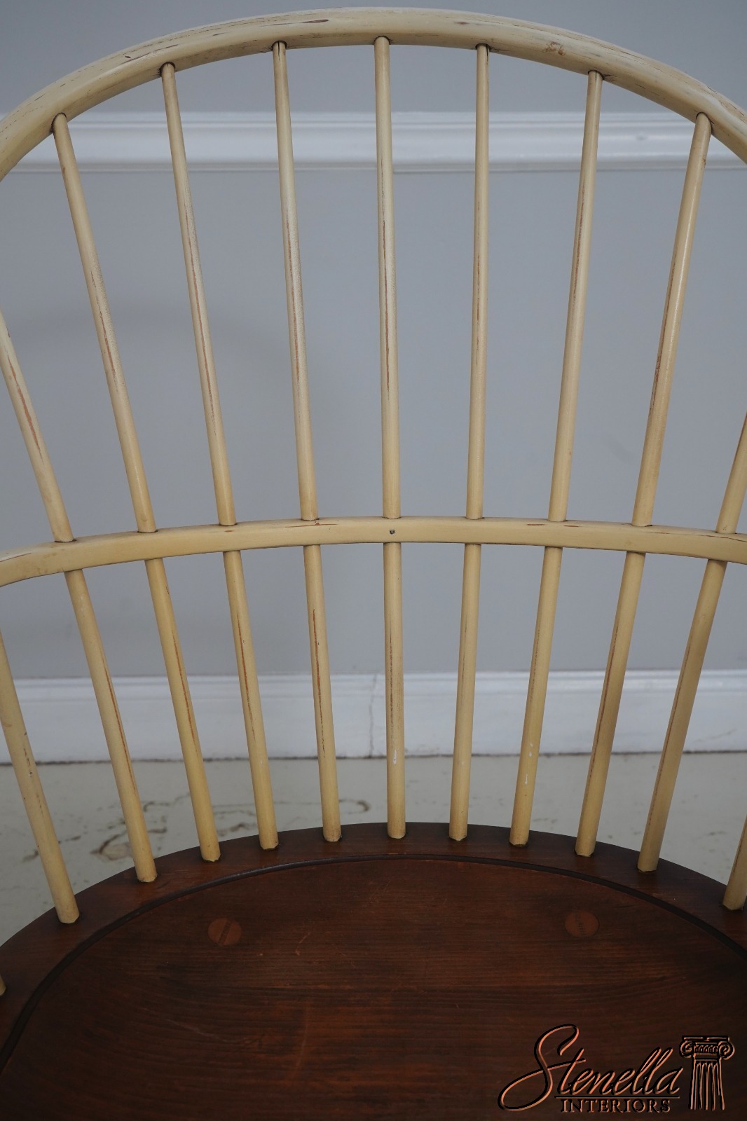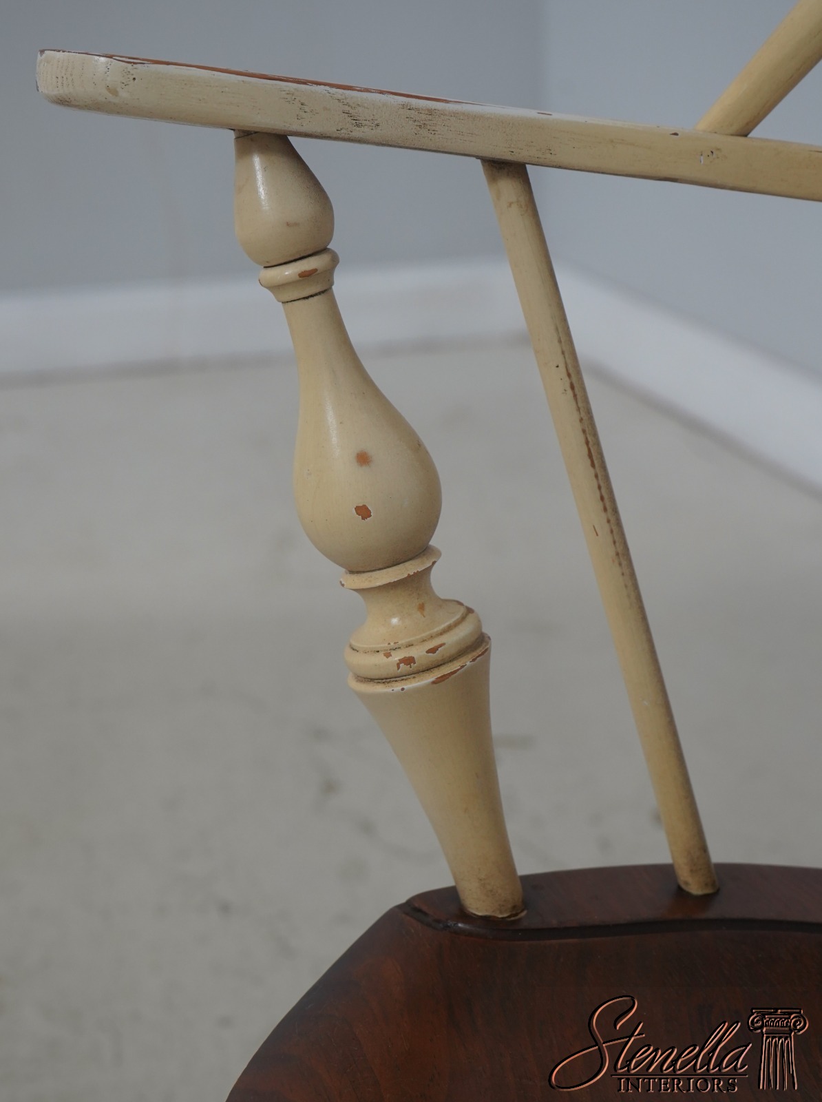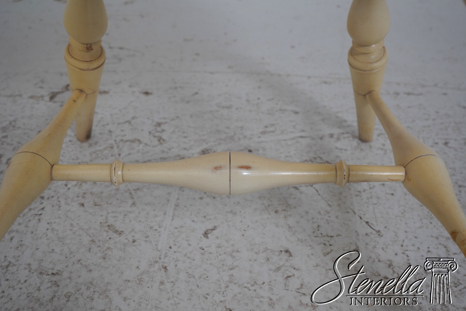 Details: Farmhouse Style High Quality Construction Traditional Style Stretcher Base Frame Spindle Bacs Un-Marked As To Manufacture Turned Legs Saddle Seat Distressed painted finish Mortised seat construction Offered @ Fraction Original Retail Cost