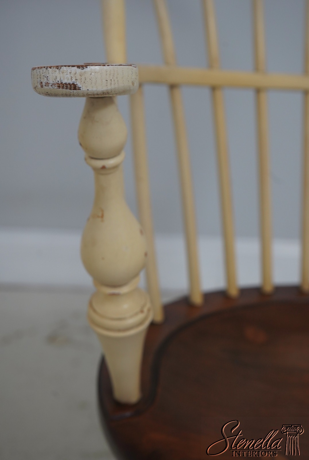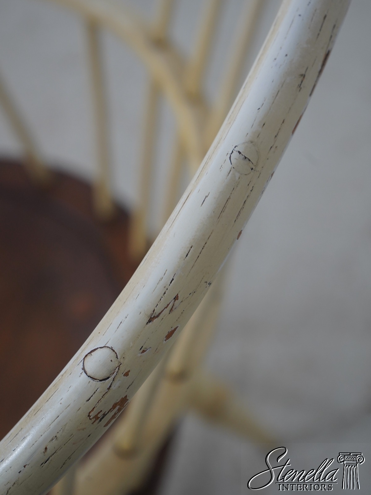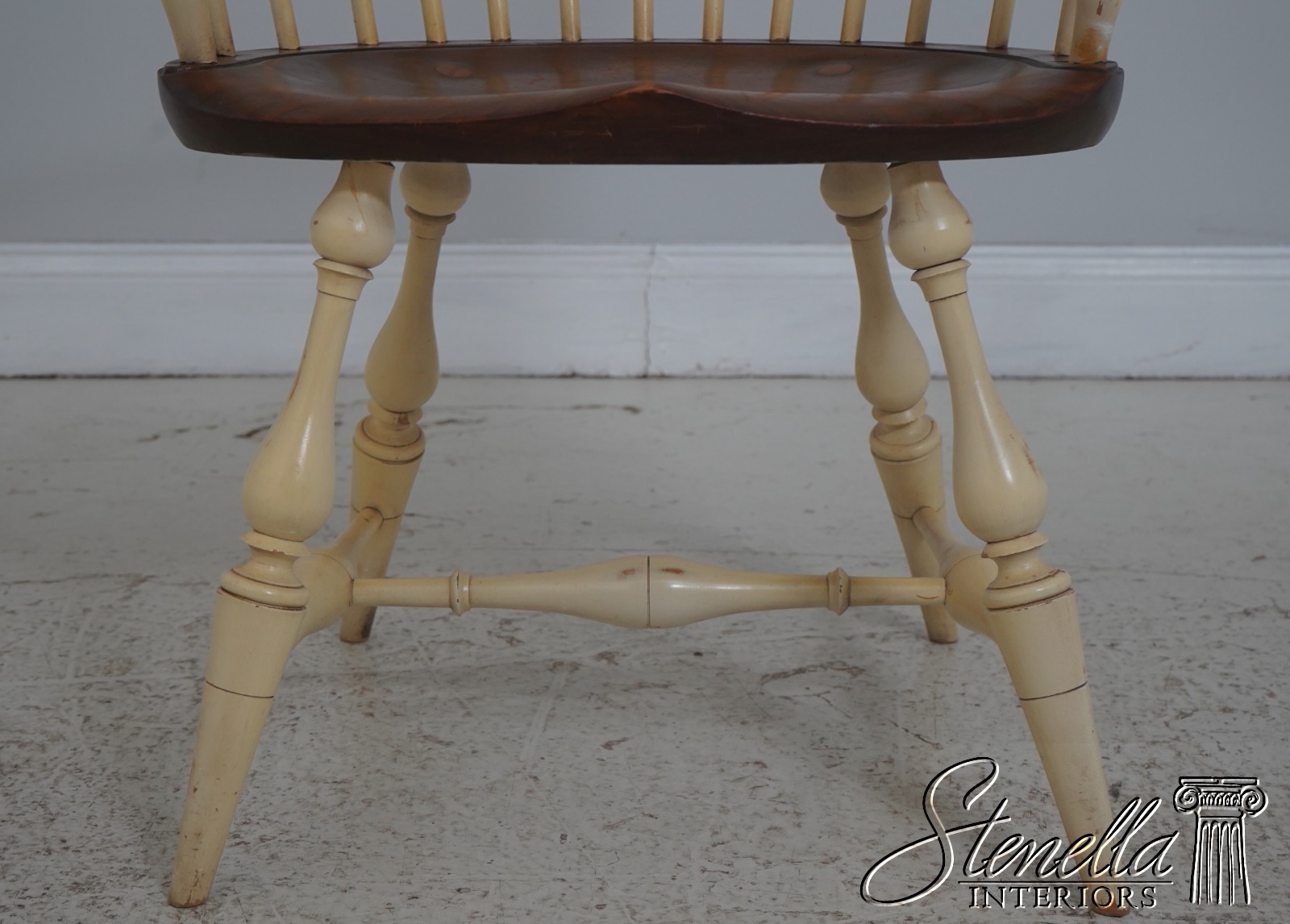 Details: Farmhouse Style High Quality Construction Traditional Style Stretcher Base Frame Spindle Bacs Un-Marked As To Manufacture Turned Legs Saddle Seat Distressed painted finish Mortised seat construction Offered @ Fraction Original Retail Cost