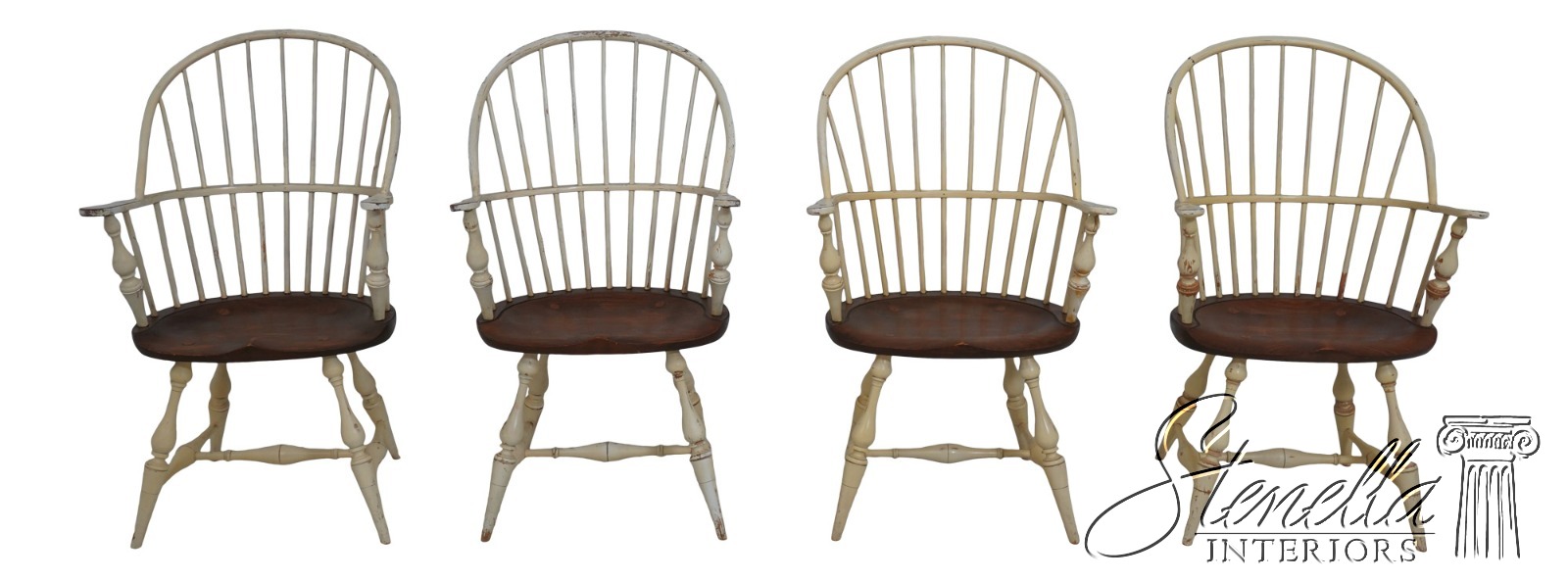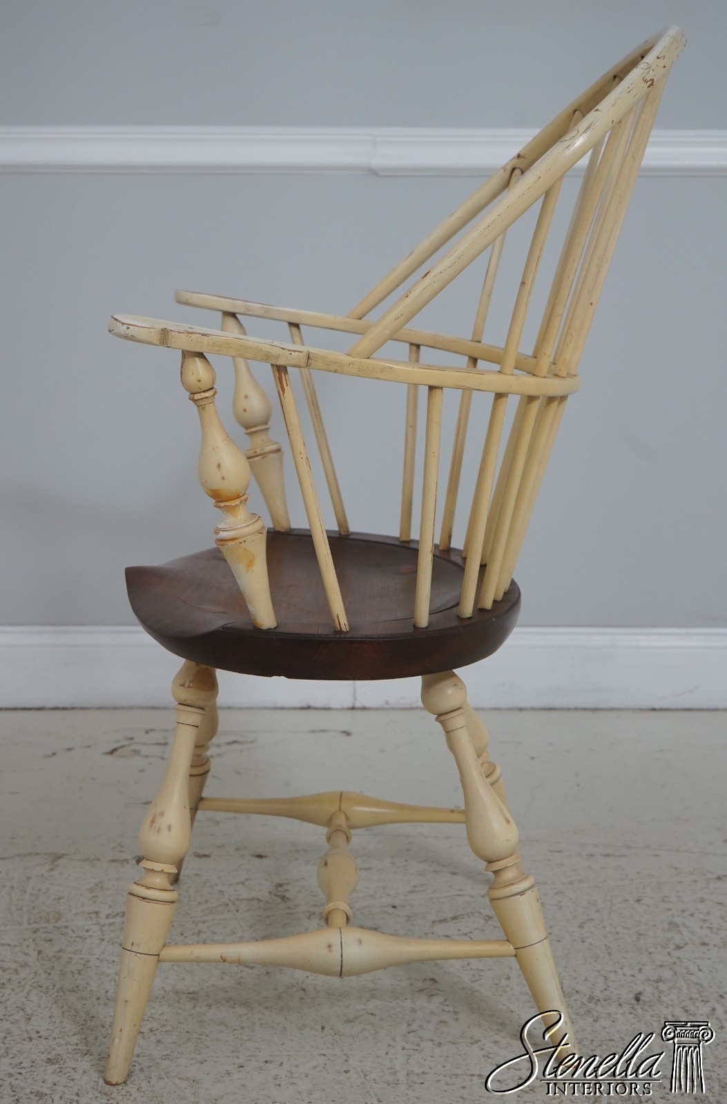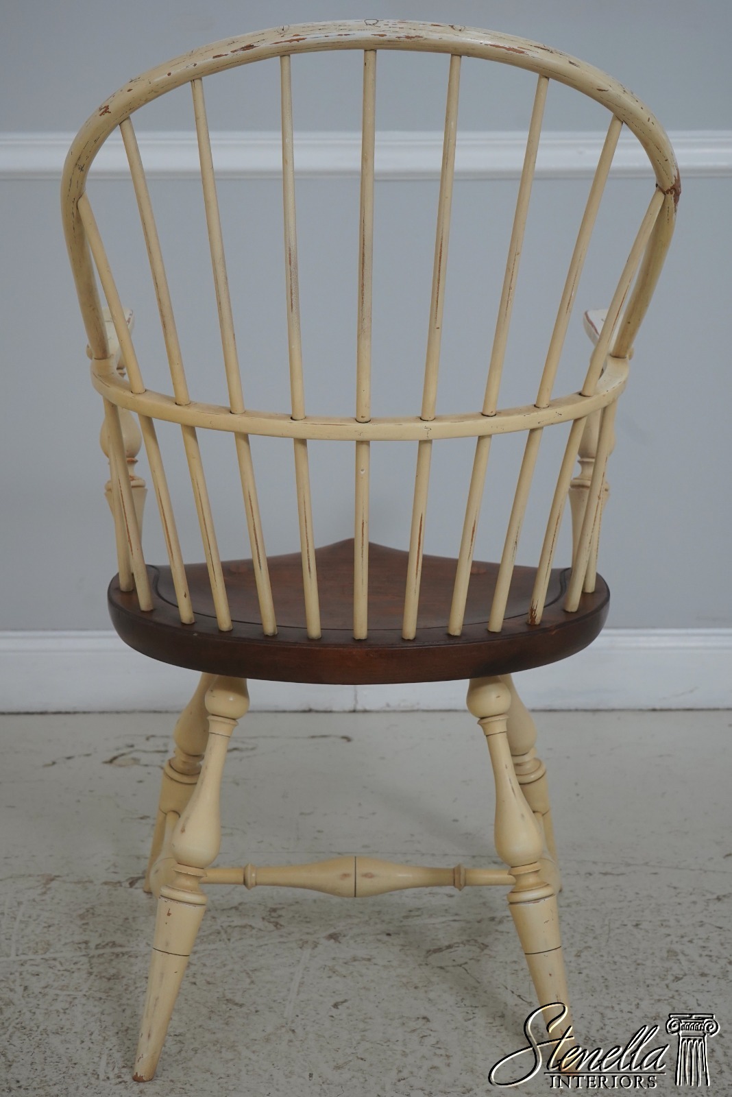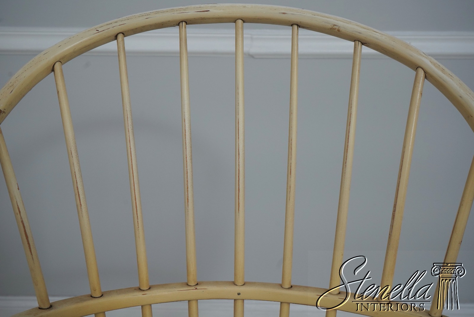 Details: Farmhouse Style High Quality Construction Traditional Style Stretcher Base Frame Spindle Bacs Un-Marked As To Manufacture Turned Legs Saddle Seat Distressed painted finish Mortised seat construction Offered @ Fraction Original Retail Cost