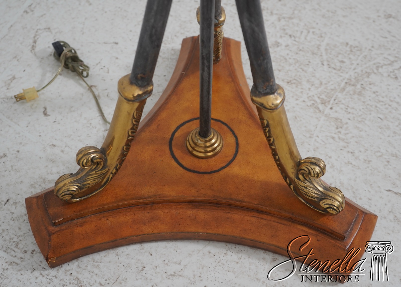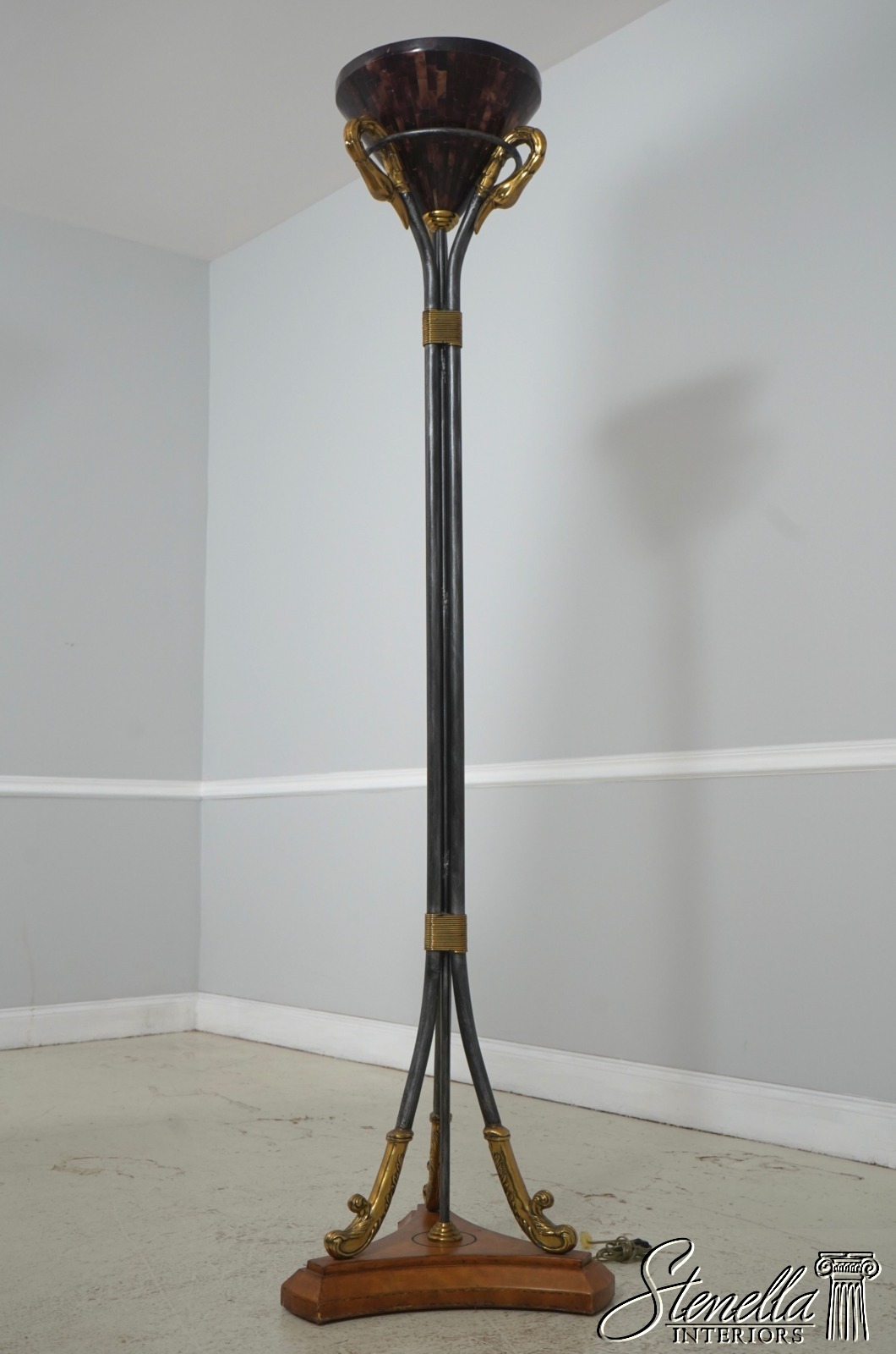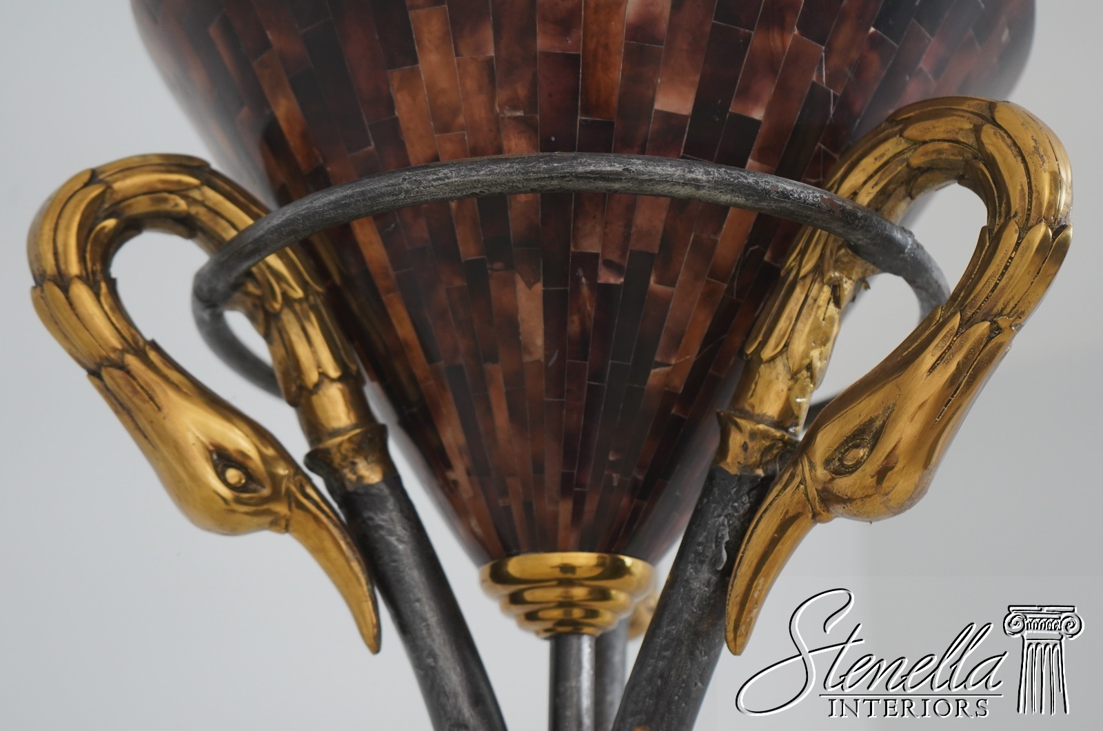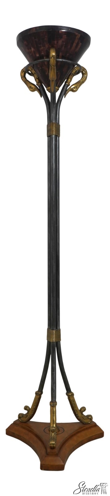 Details: Tessellated Faux Tortoise Shade Torchiere Style Lamp Wrought Iron & Brass Lamp w. Leather Wrapped Base Swan Head Supports Un-Marked As To Manufacture Offered @ Fraction Original Retail Cost
