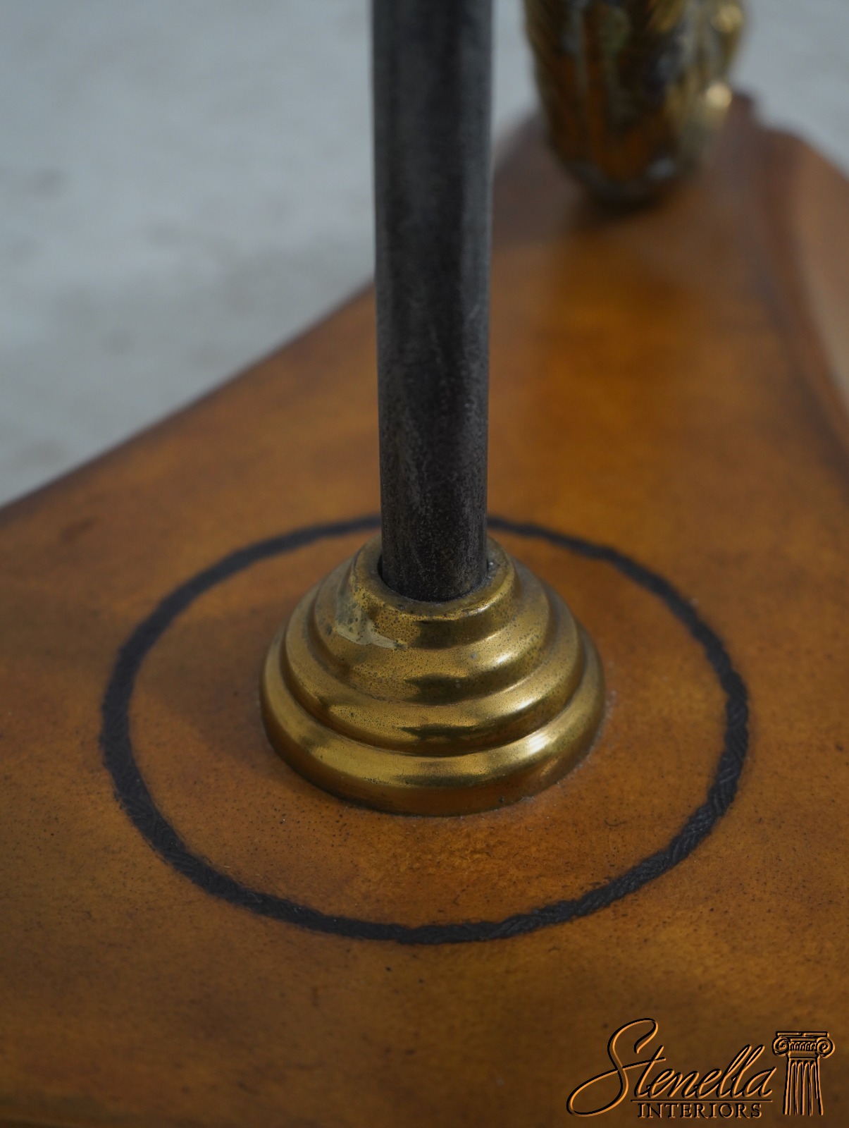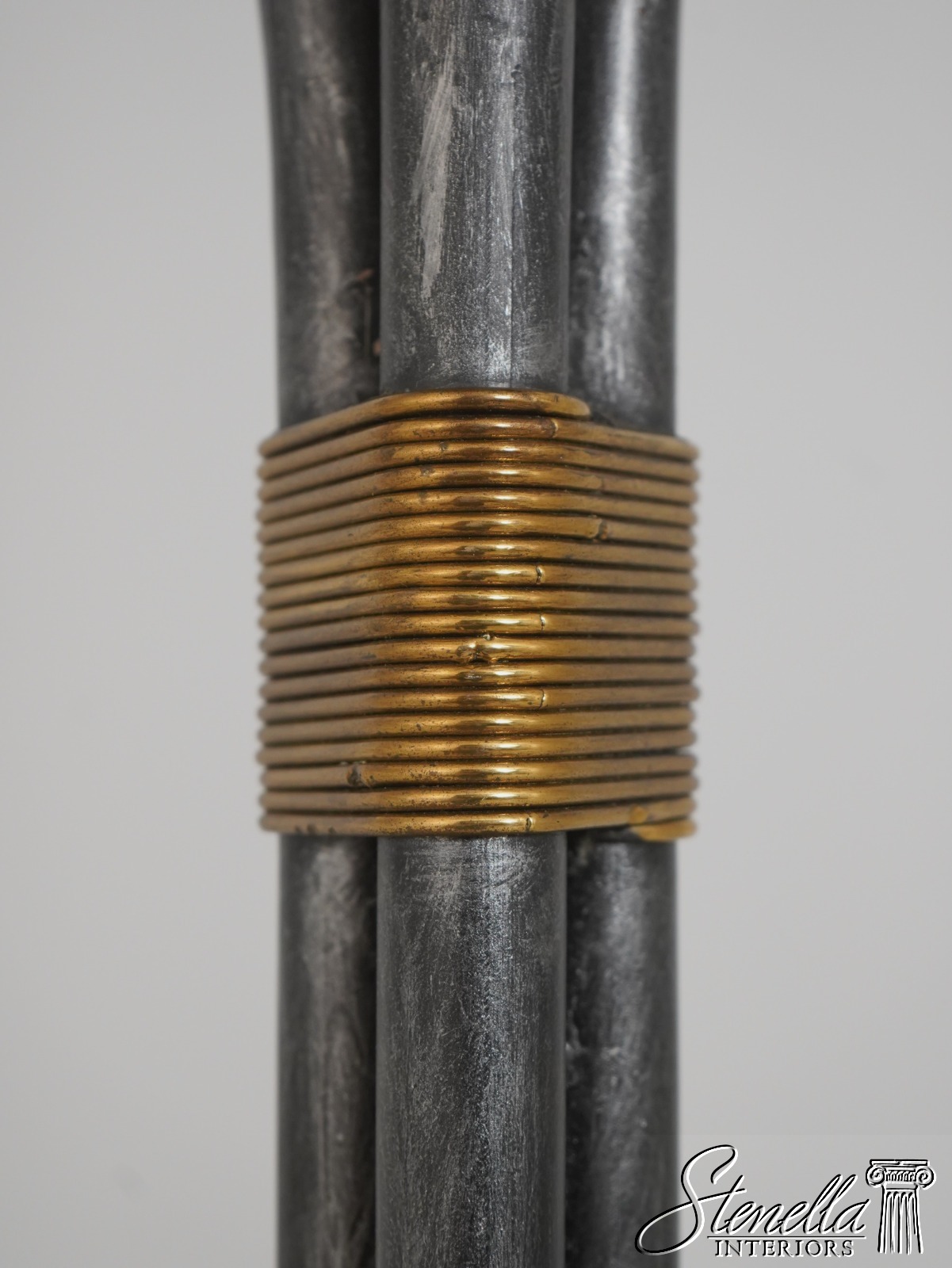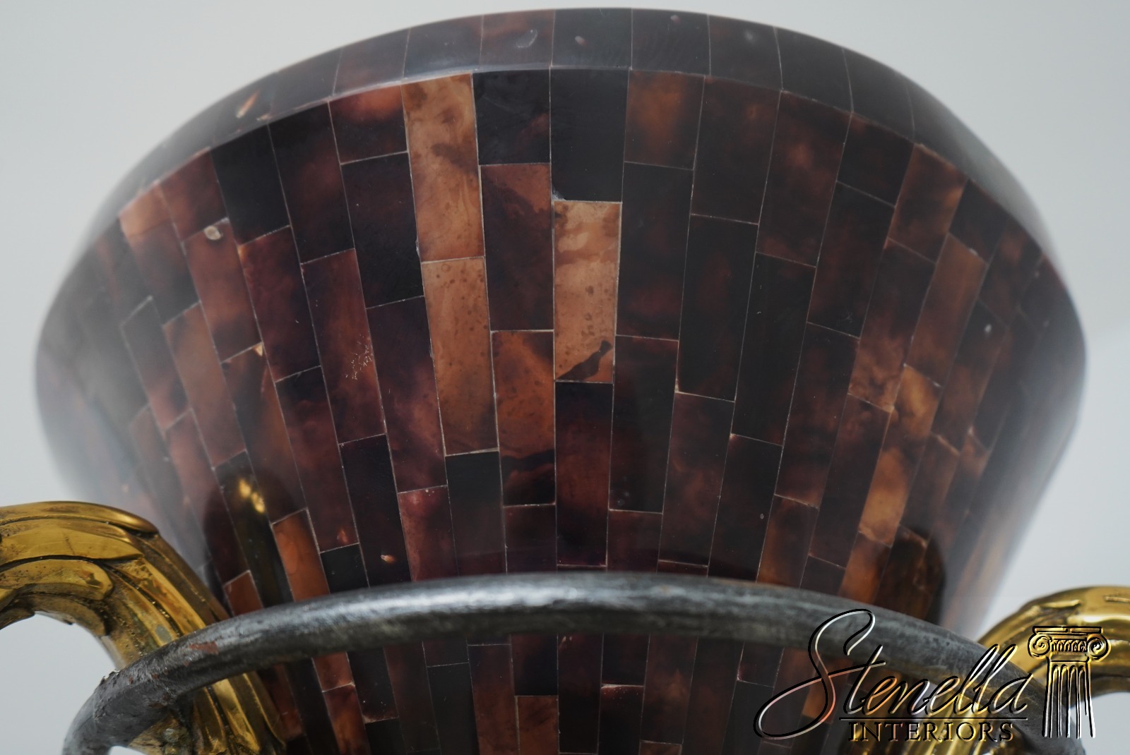 Details: Tessellated Faux Tortoise Shade Torchiere Style Lamp Wrought Iron & Brass Lamp w. Leather Wrapped Base Swan Head Supports Un-Marked As To Manufacture Offered @ Fraction Original Retail Cost