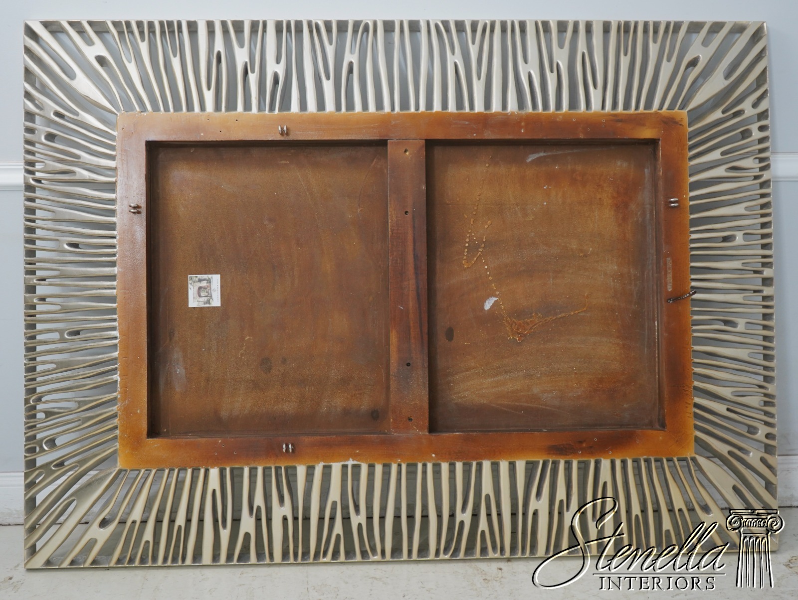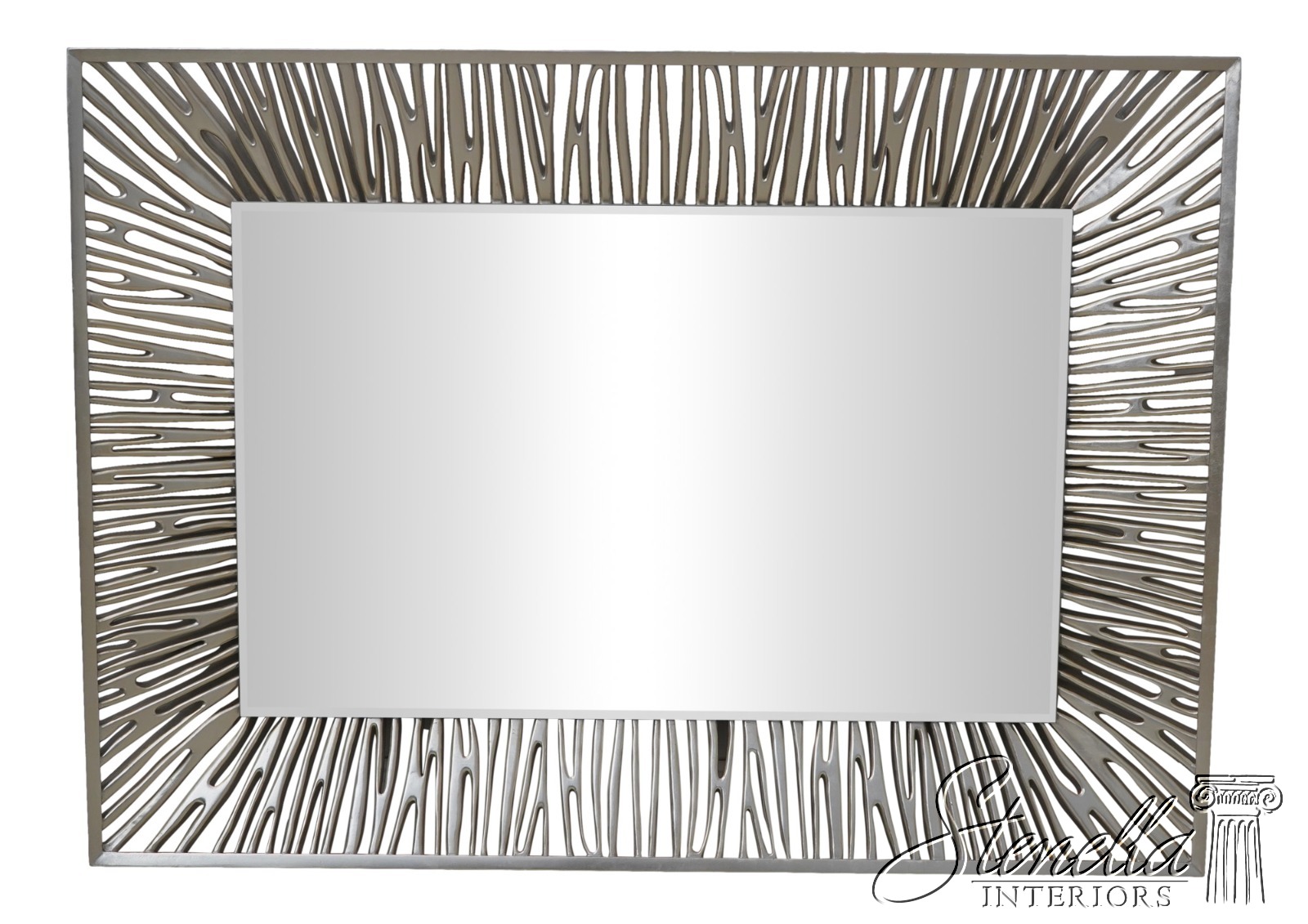 Details: Beveled Glass Mirror High Quality Construction Large Impressive Mirror Pierced Carved Frame Silver Leaf Finish Absolutely Gorgeous Designer Mirror Offered @ Fraction Original Retail Cost