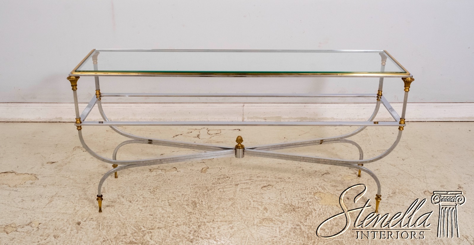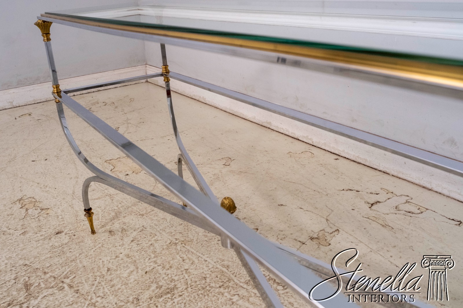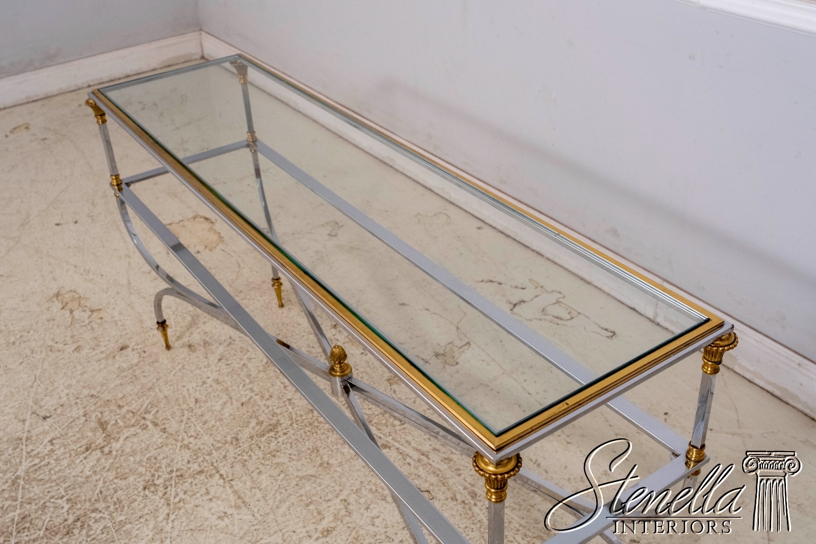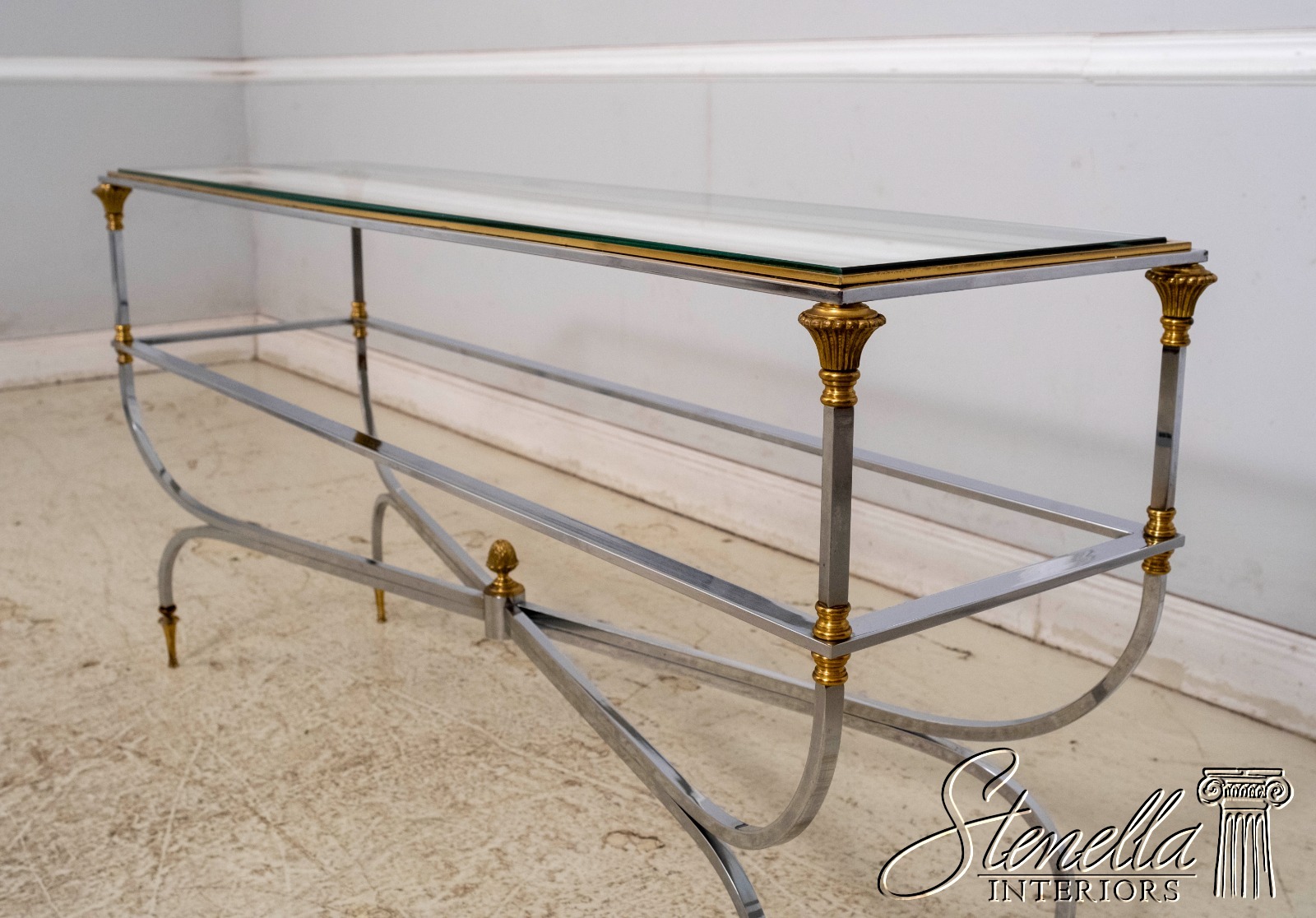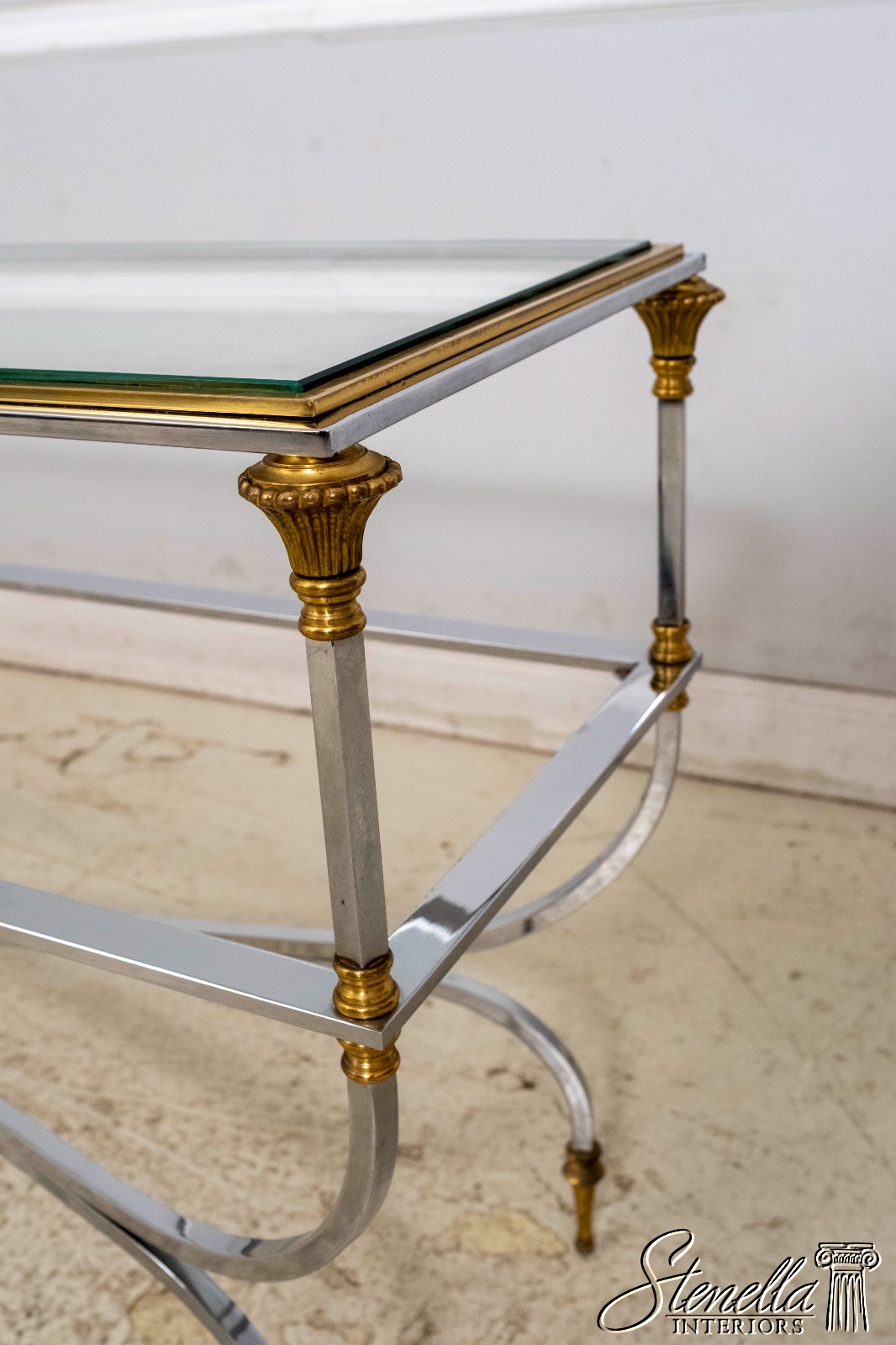 70099: MAISON JANSEN Style Mid Century Modern Brass Chromo 2 Tier Sofa Table