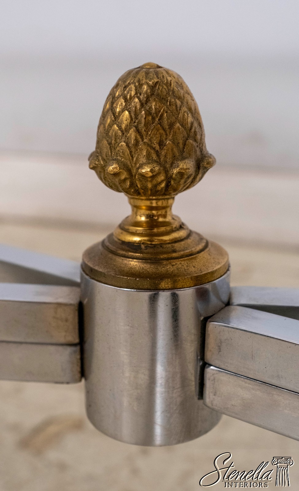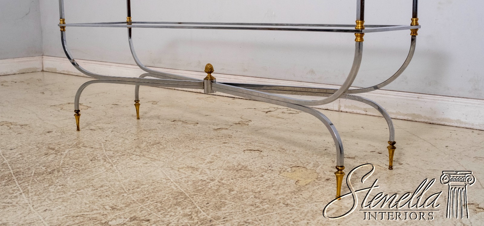 Details: In The Manner Of Maison Jansen Brass Capped Feet High Quality Construction Stretcher Base Frame Pineapple Finial Un-Marked As To Manufacture Missing Lower Glass Shelf Offered @ Fraction Original Retail Cost