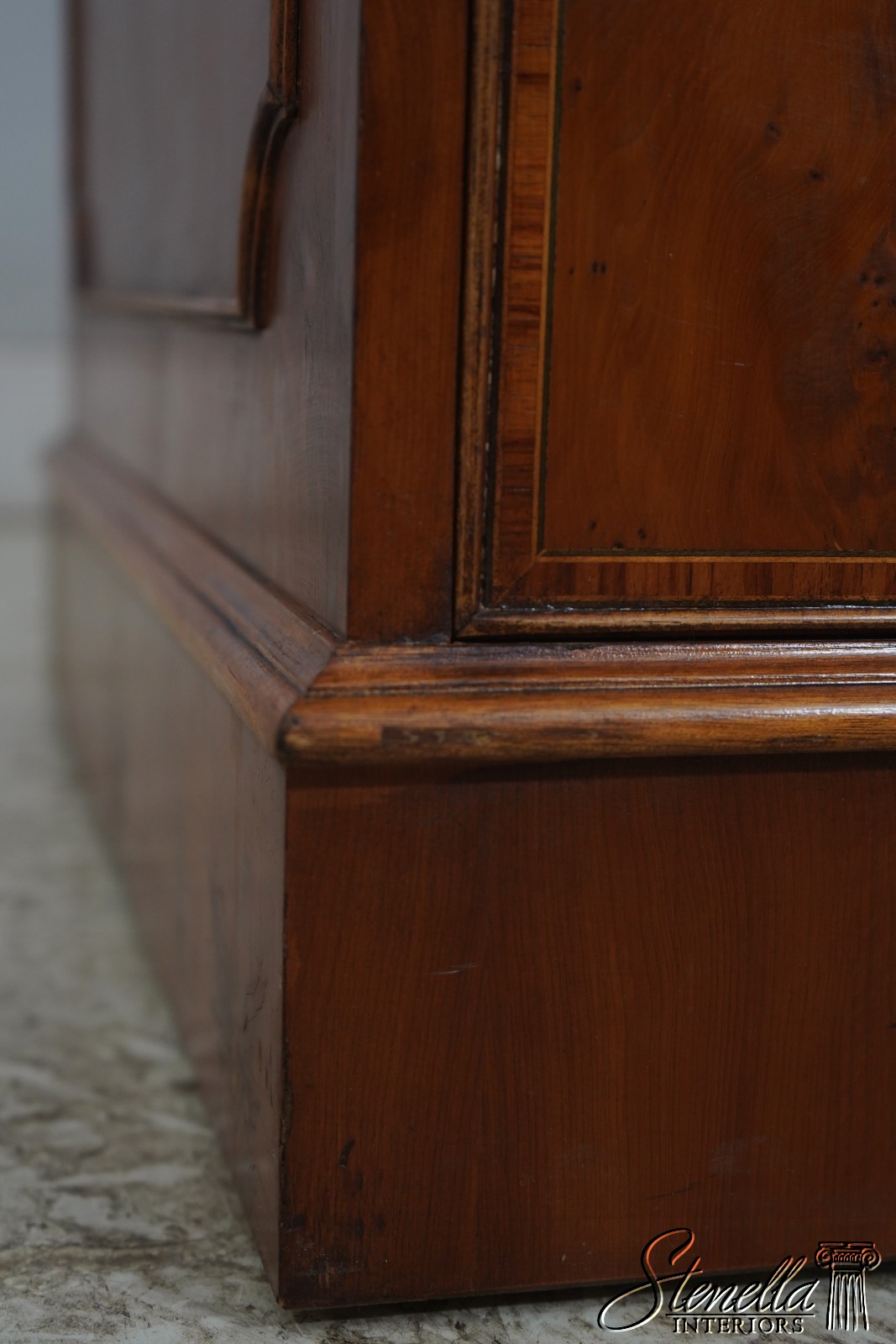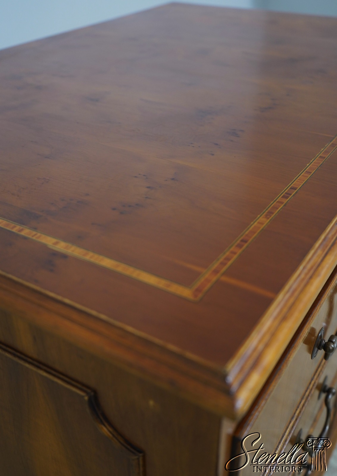 Details: Yew Wood High Quality Construction Nice Inlay Work Throughout Nice Tooled Leather Sides Solid Brass Hardware Drawers For Hanging Files Key Locking w. Key 2 Slide Out Writing Surfaces w. Tooled Leather Un-Marked As To Manufacture Offered @ Fraction Original Retail Cost