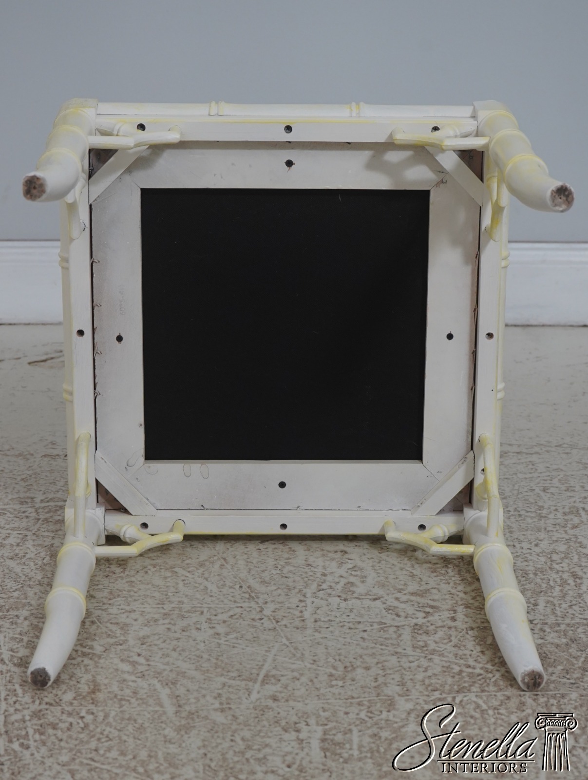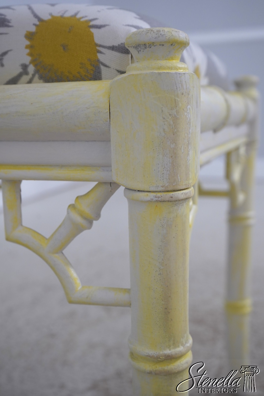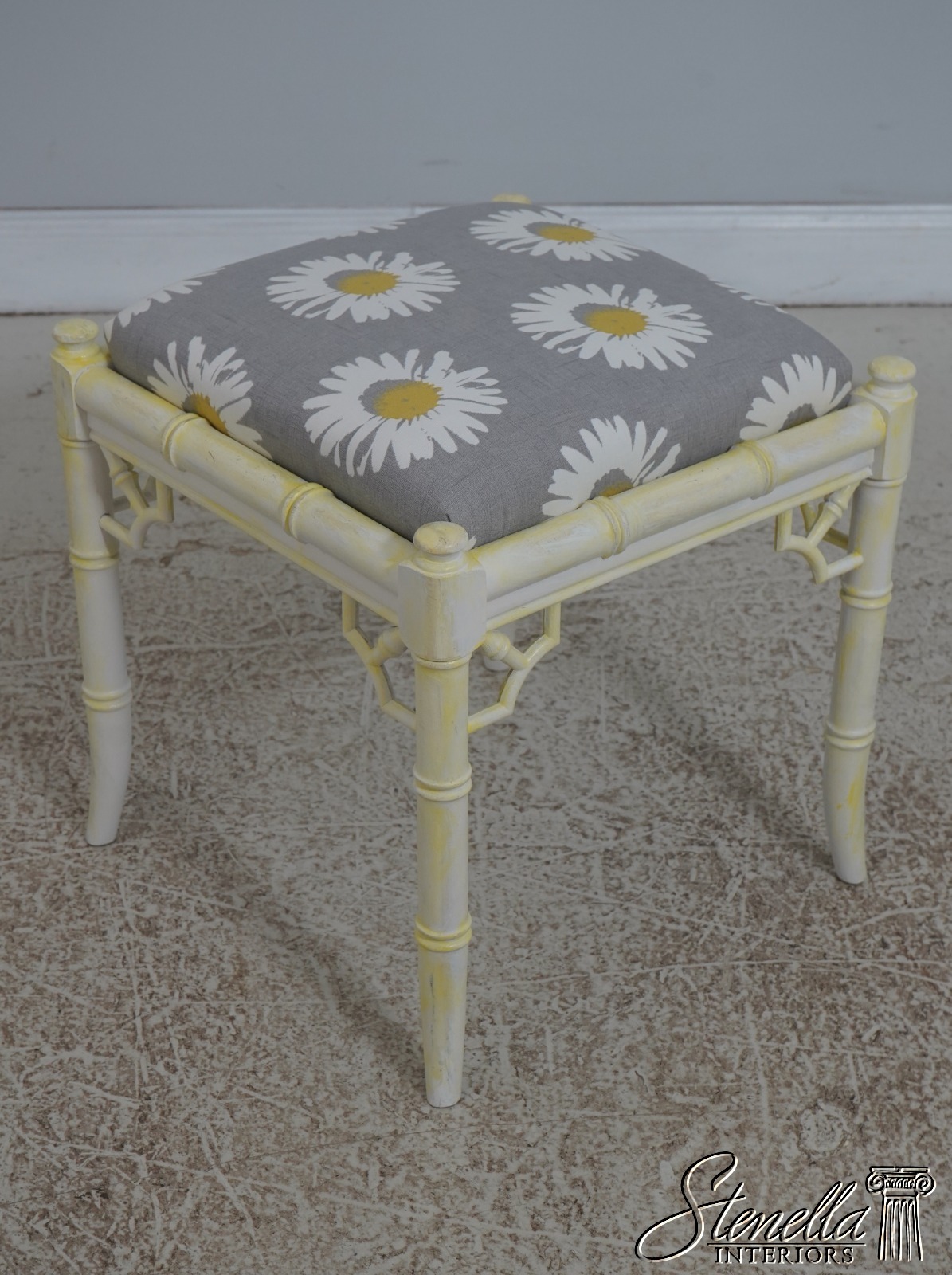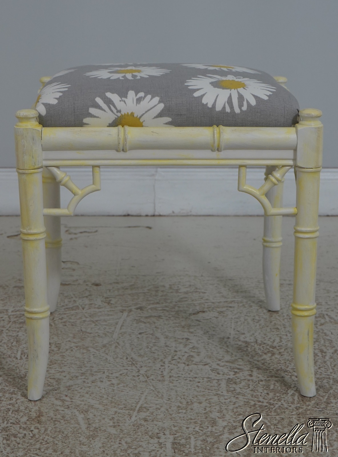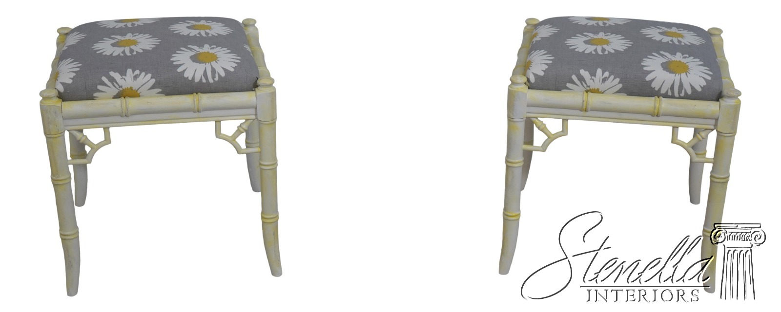 Details: Stunning Decorator Pair Of Stools High Quality Construction Bamboo Form Stools Traditional Style Professionally Reupholstered In Brand New Upholstery Un-Marked As To Manufacture Off White Painted Finish w. Yellow Accents Offered @ Fraction Original Retail Cost