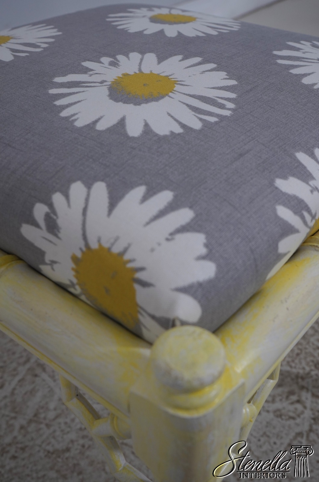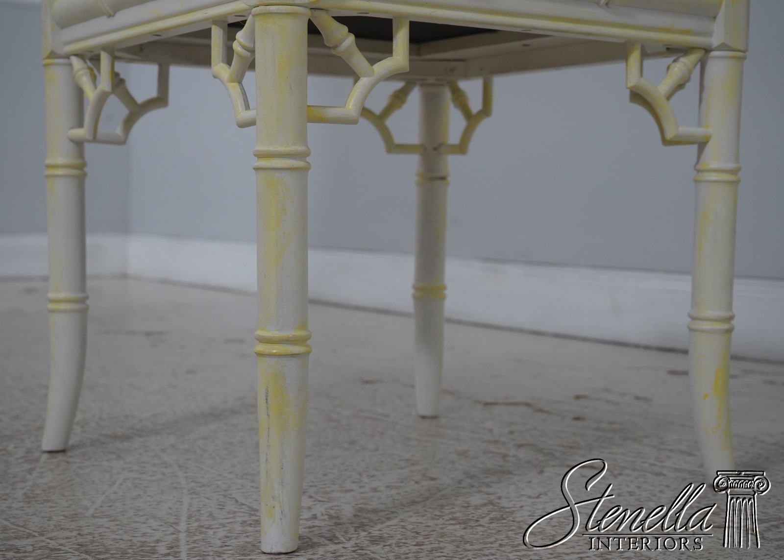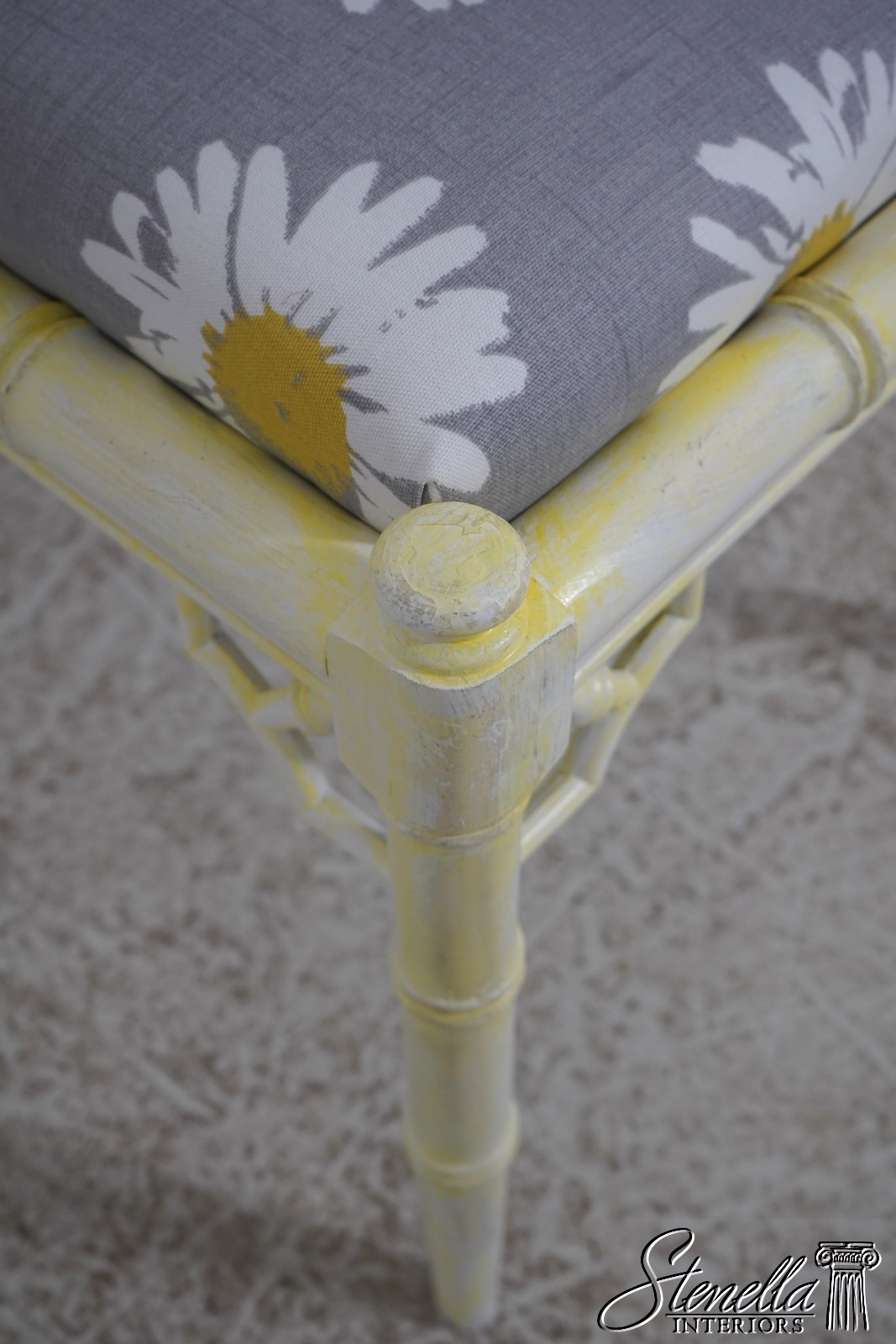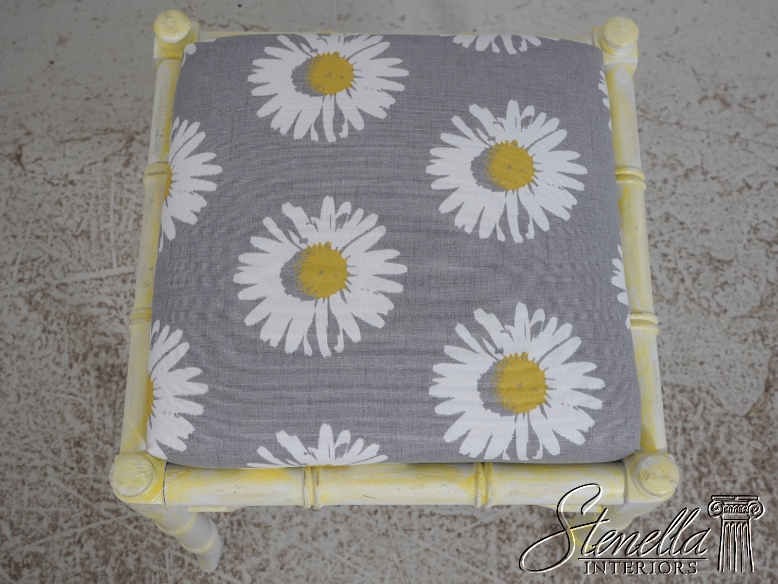 Details: Stunning Decorator Pair Of Stools High Quality Construction Bamboo Form Stools Traditional Style Professionally Reupholstered In Brand New Upholstery Un-Marked As To Manufacture Off White Painted Finish w. Yellow Accents Offered @ Fraction Original Retail Cost