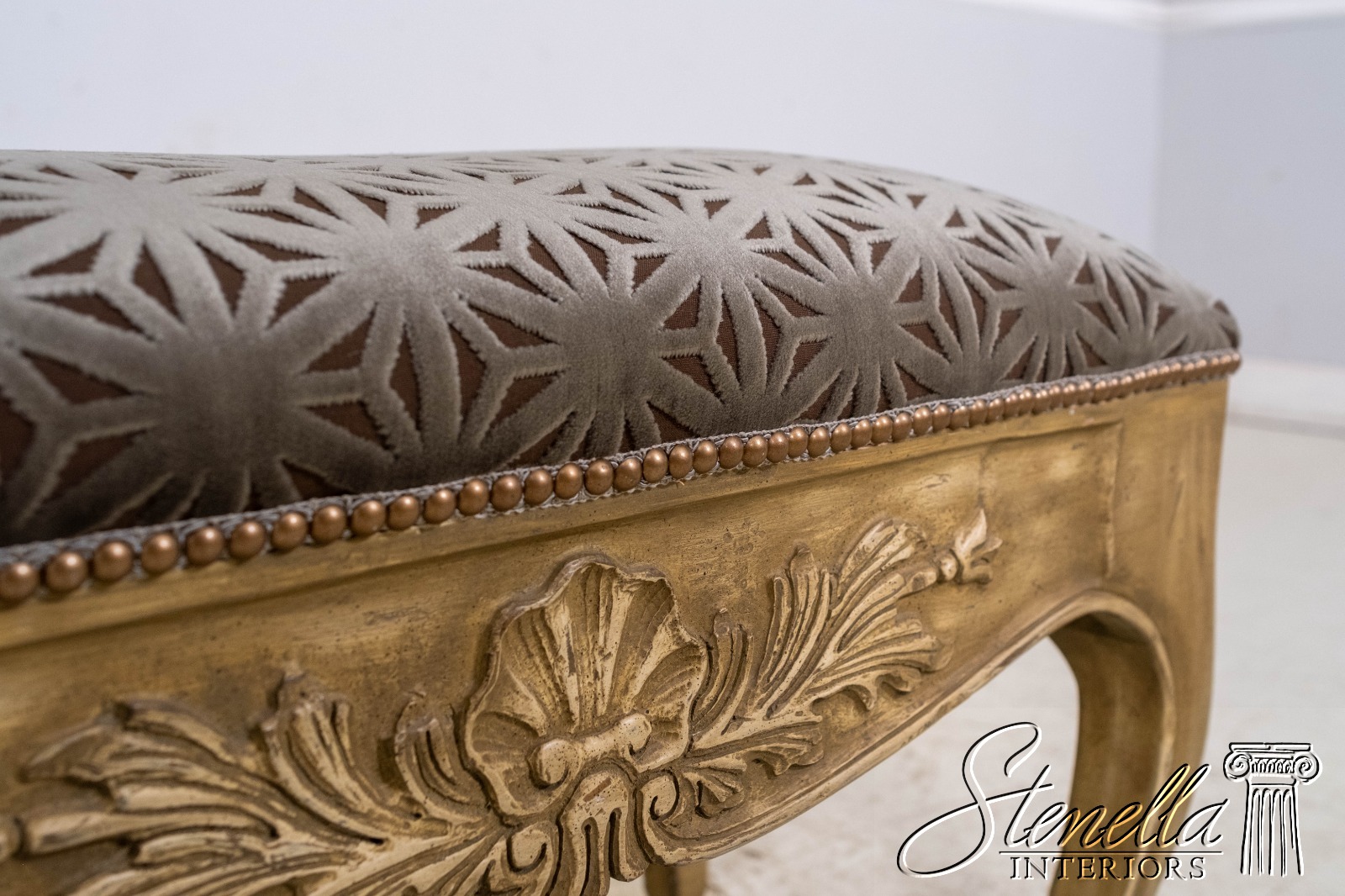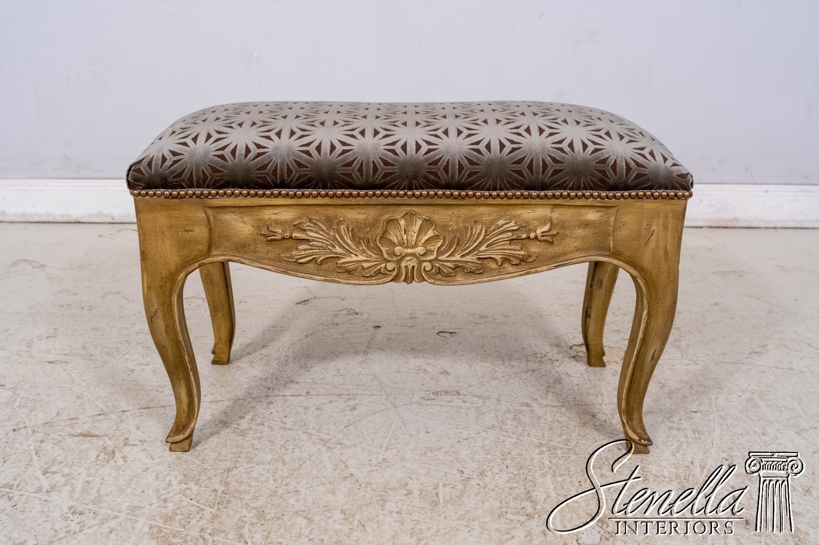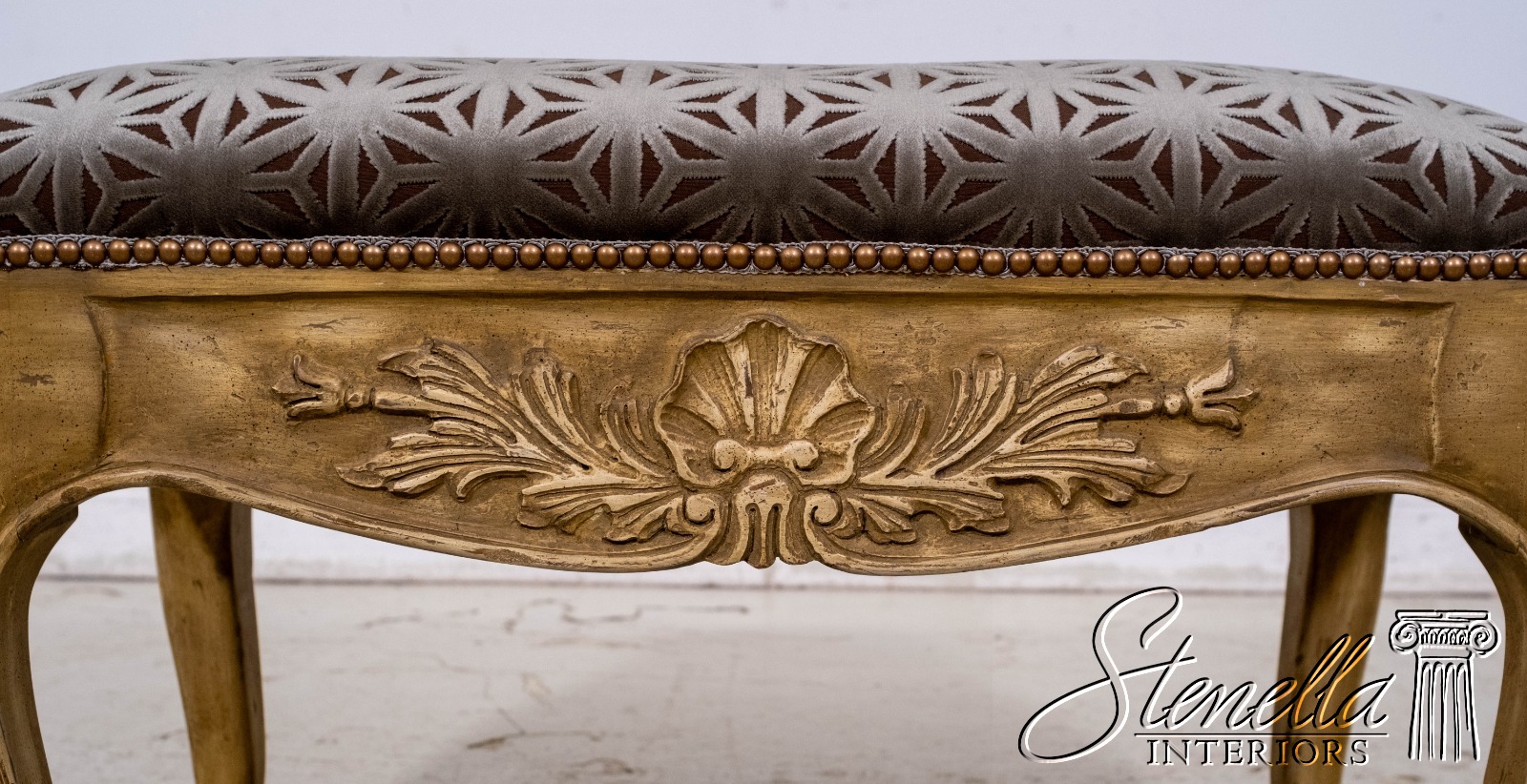 L69668: Vintage French Shell Carved Upholstered Bench w. New Upholstery