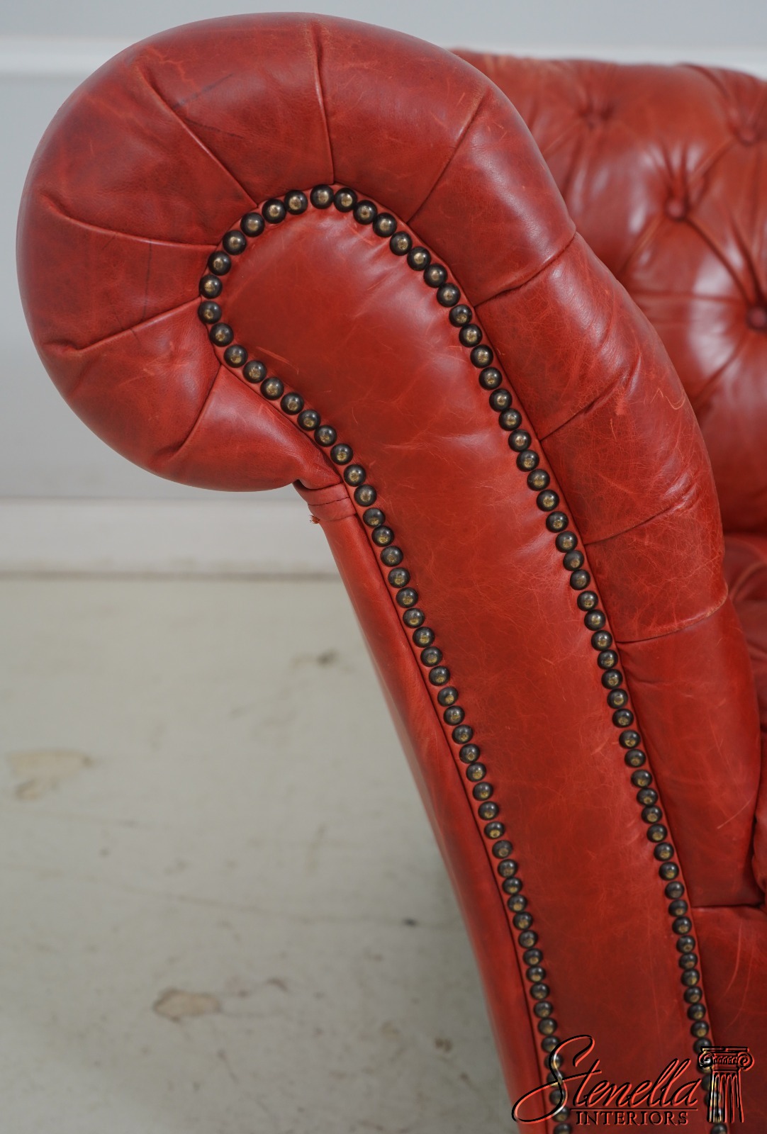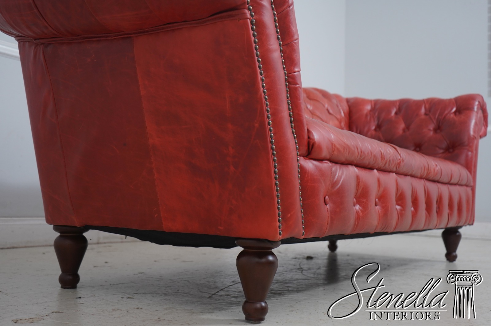 Details: Fine Carved Details High Quality Construction Large Impressive Sofa English Style Tack Head Trim Full Grain Leather Turned Legs Rolled Scrolled Sloped Arms Reverse Camel Back Un-Marked As To Manufacture Offerd @ Fraction Original Retail Cost